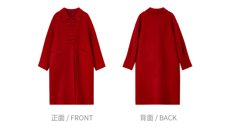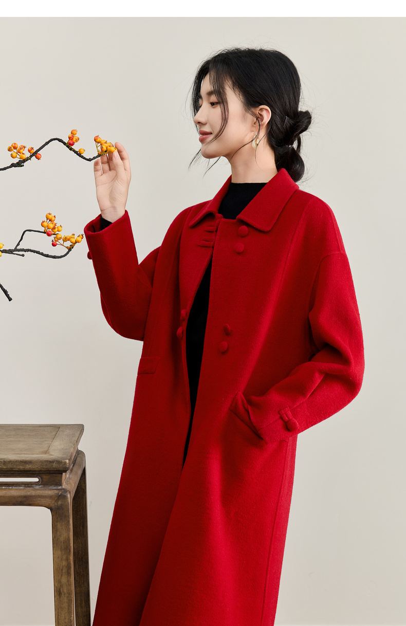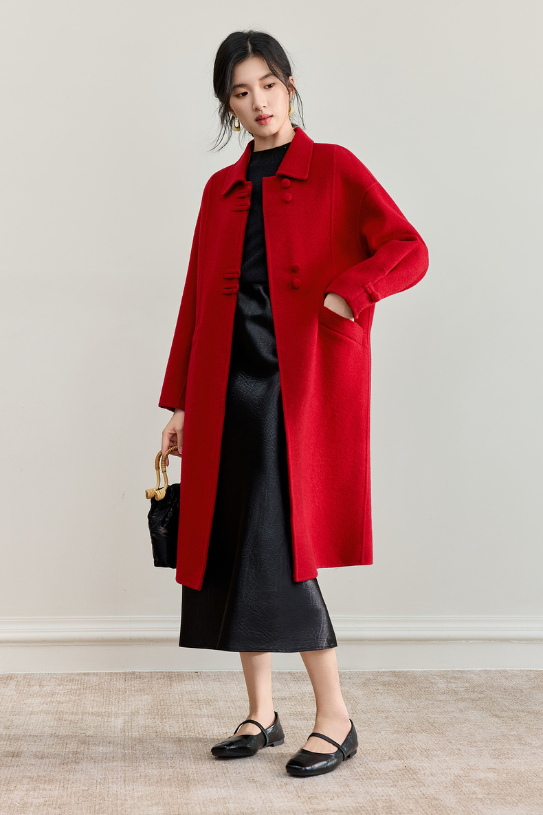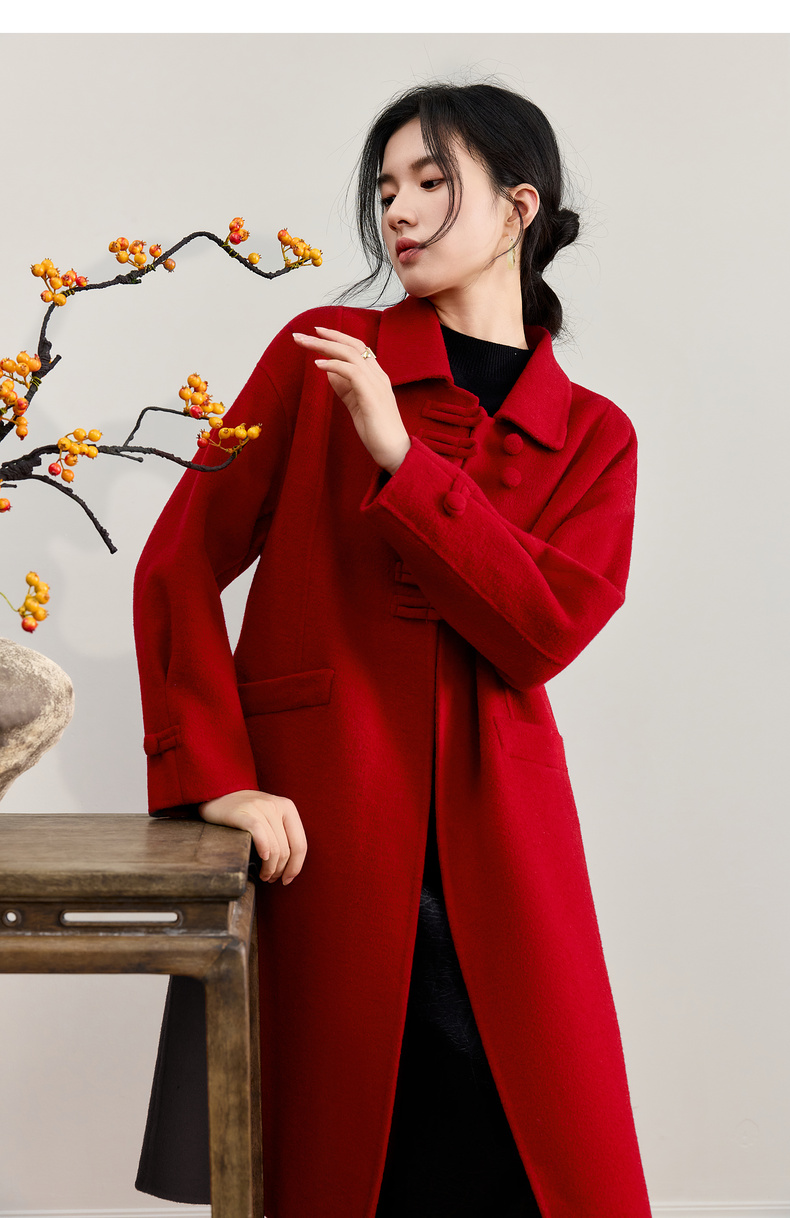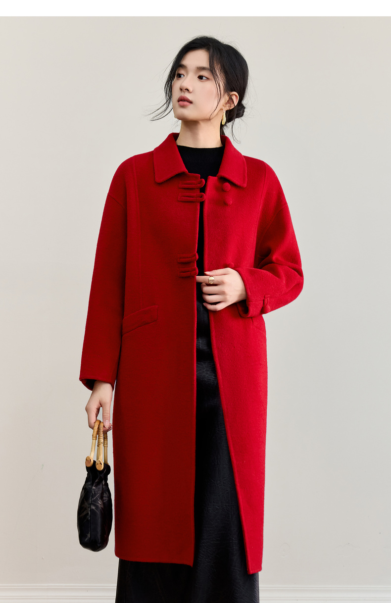【内购】【绵羊毛】优雅通勤翻领国风一字盘扣宽松落肩保暖长款双面呢大衣-W54OC3440