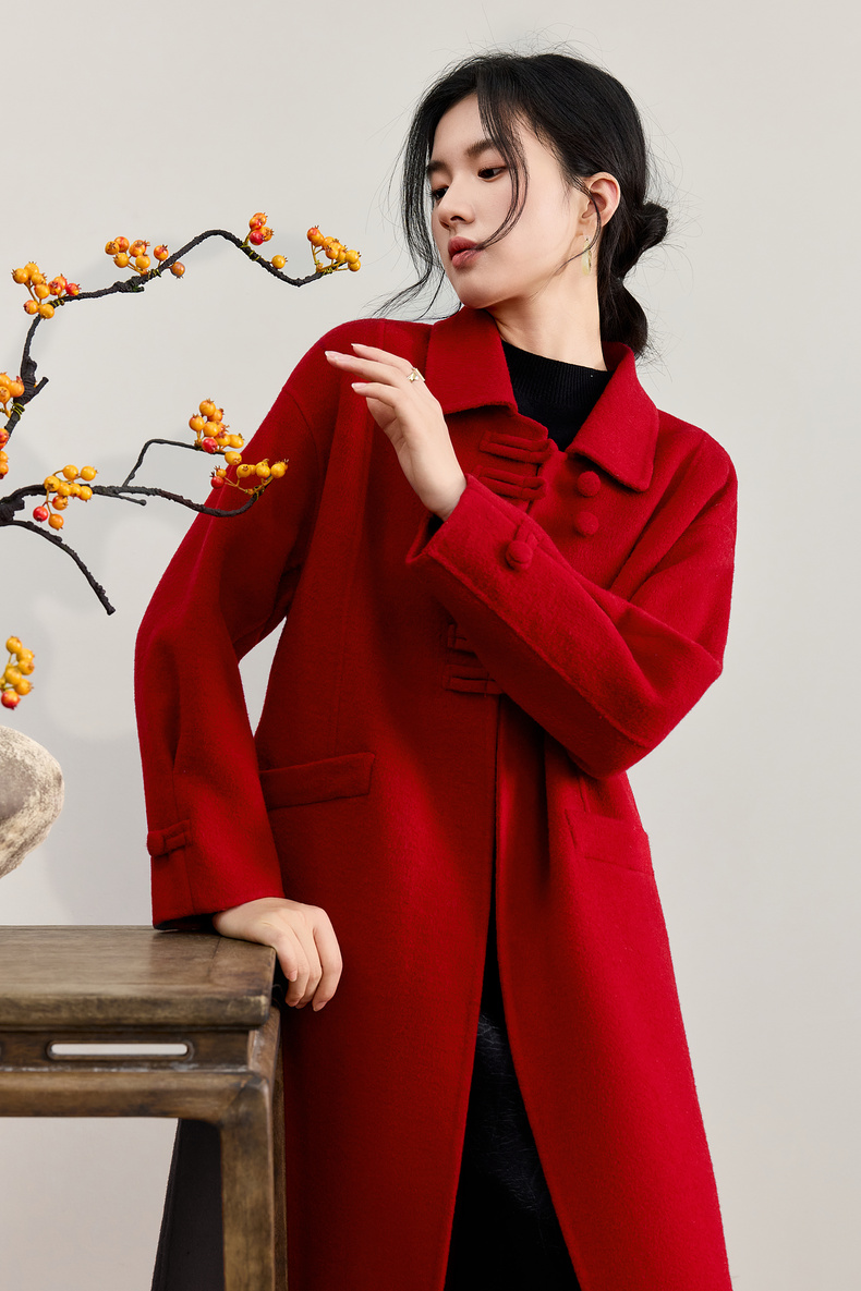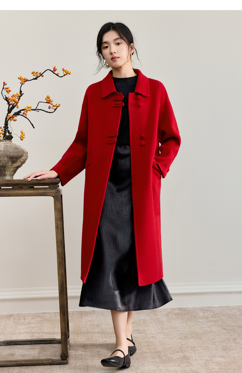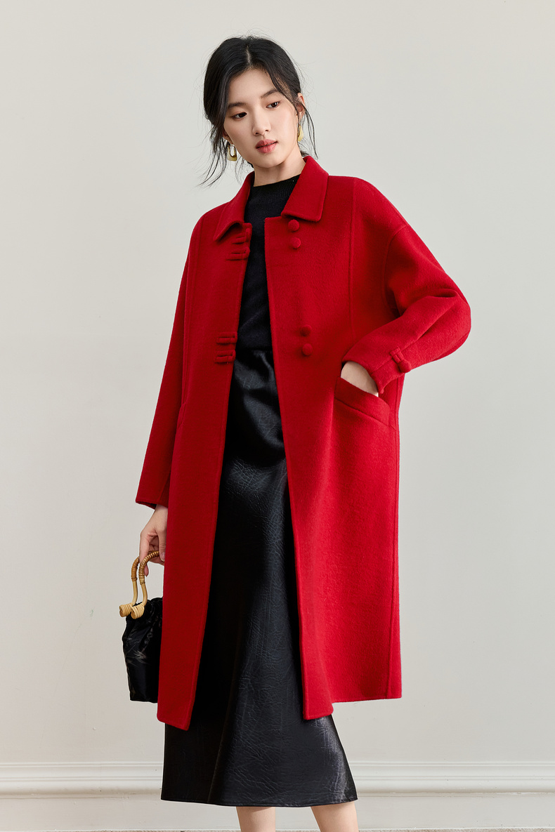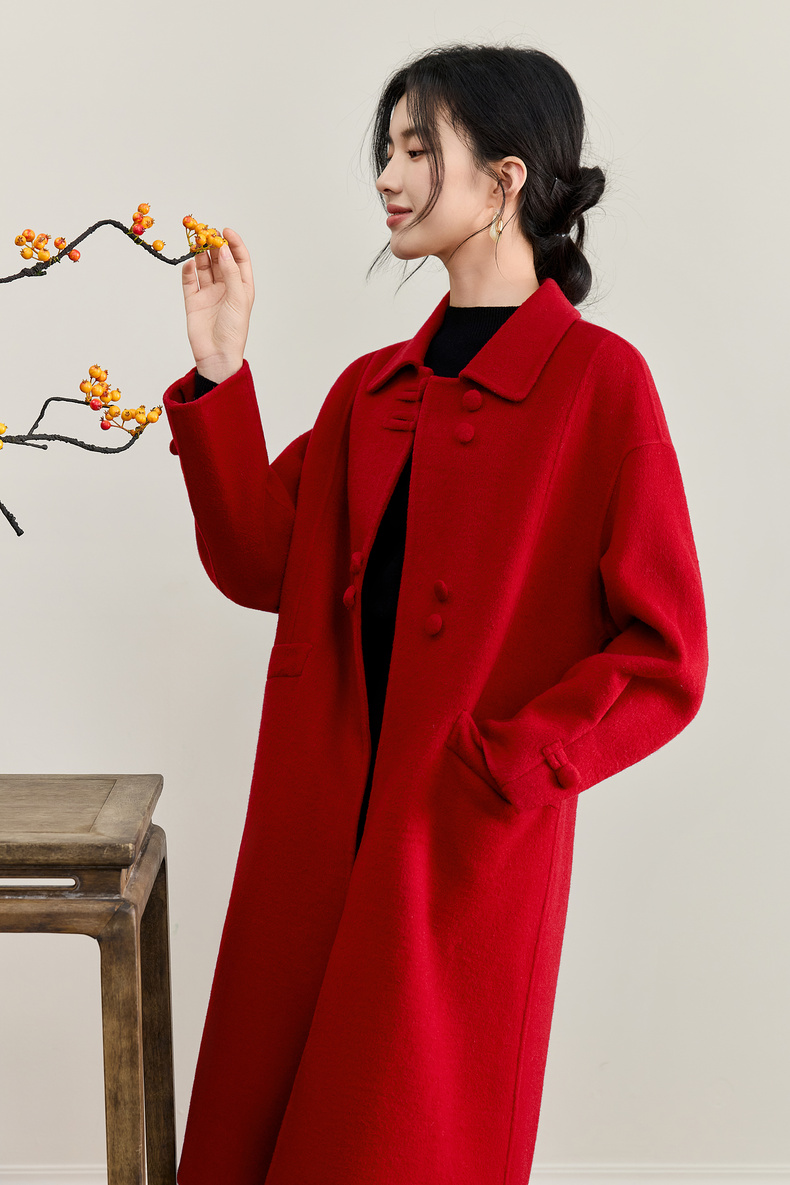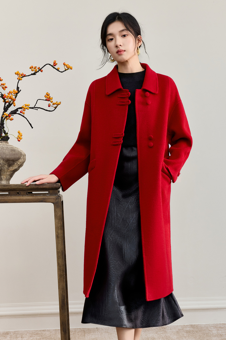 【内购】【绵羊毛】优雅通勤翻领国风一字盘扣宽松落肩保暖长款双面呢大衣-W54OC3440