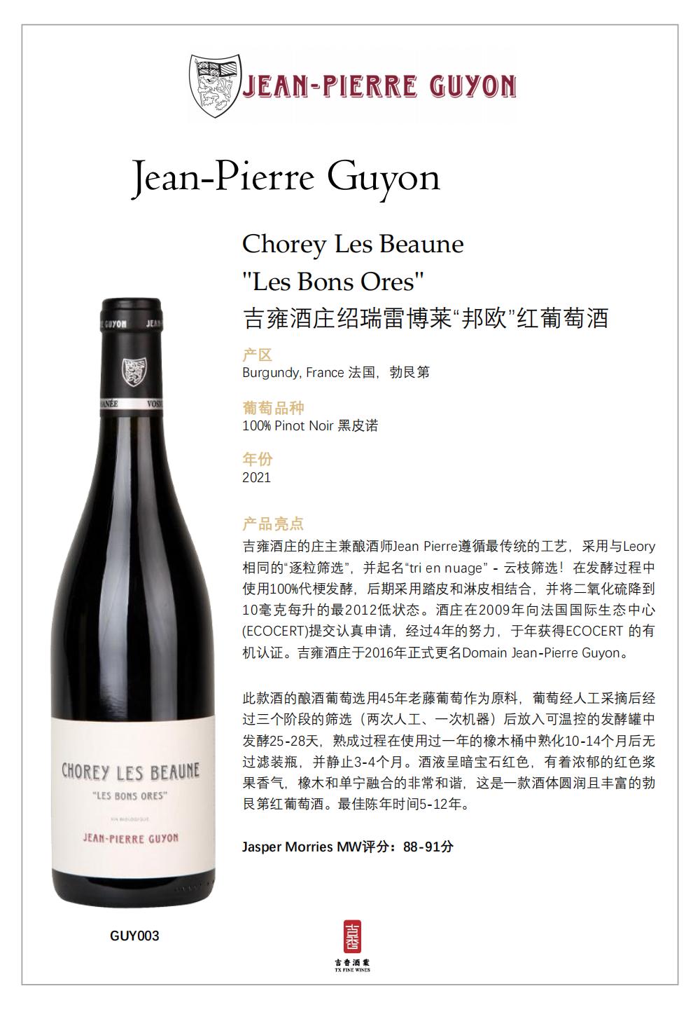 吉雍酒庄绍瑞雷博莱邦欧红葡萄酒2021 JP Guyon Chorey Les Beaune "Les Bons Ores"