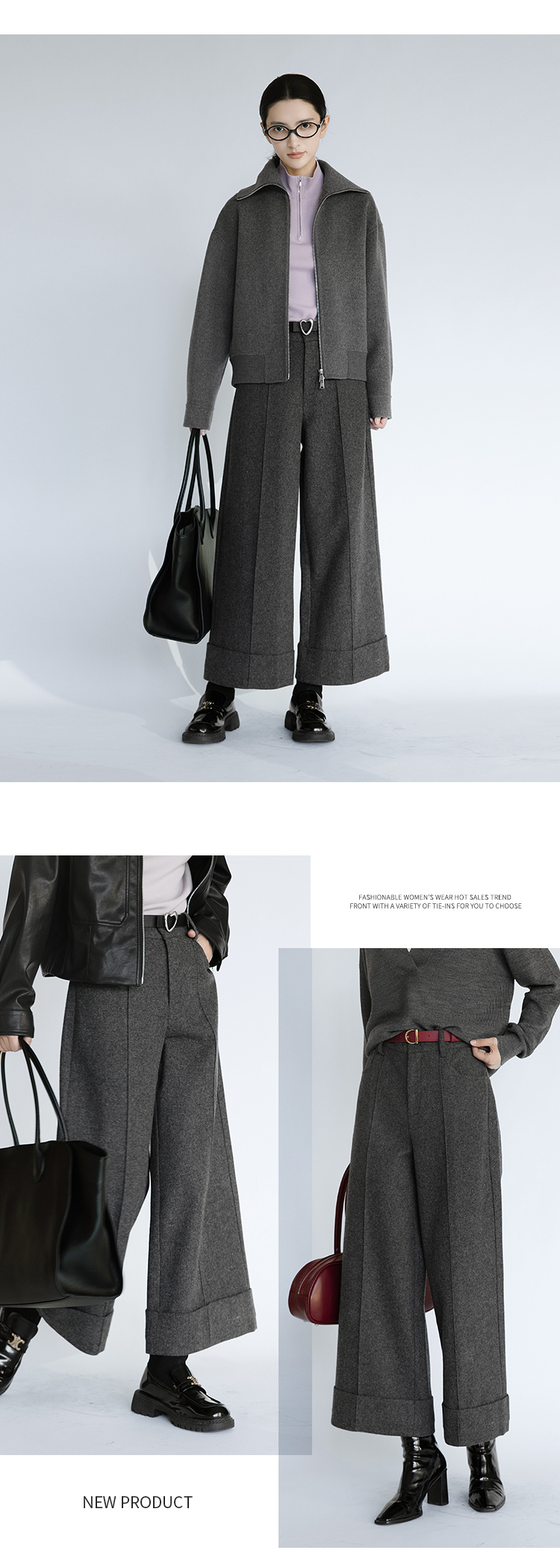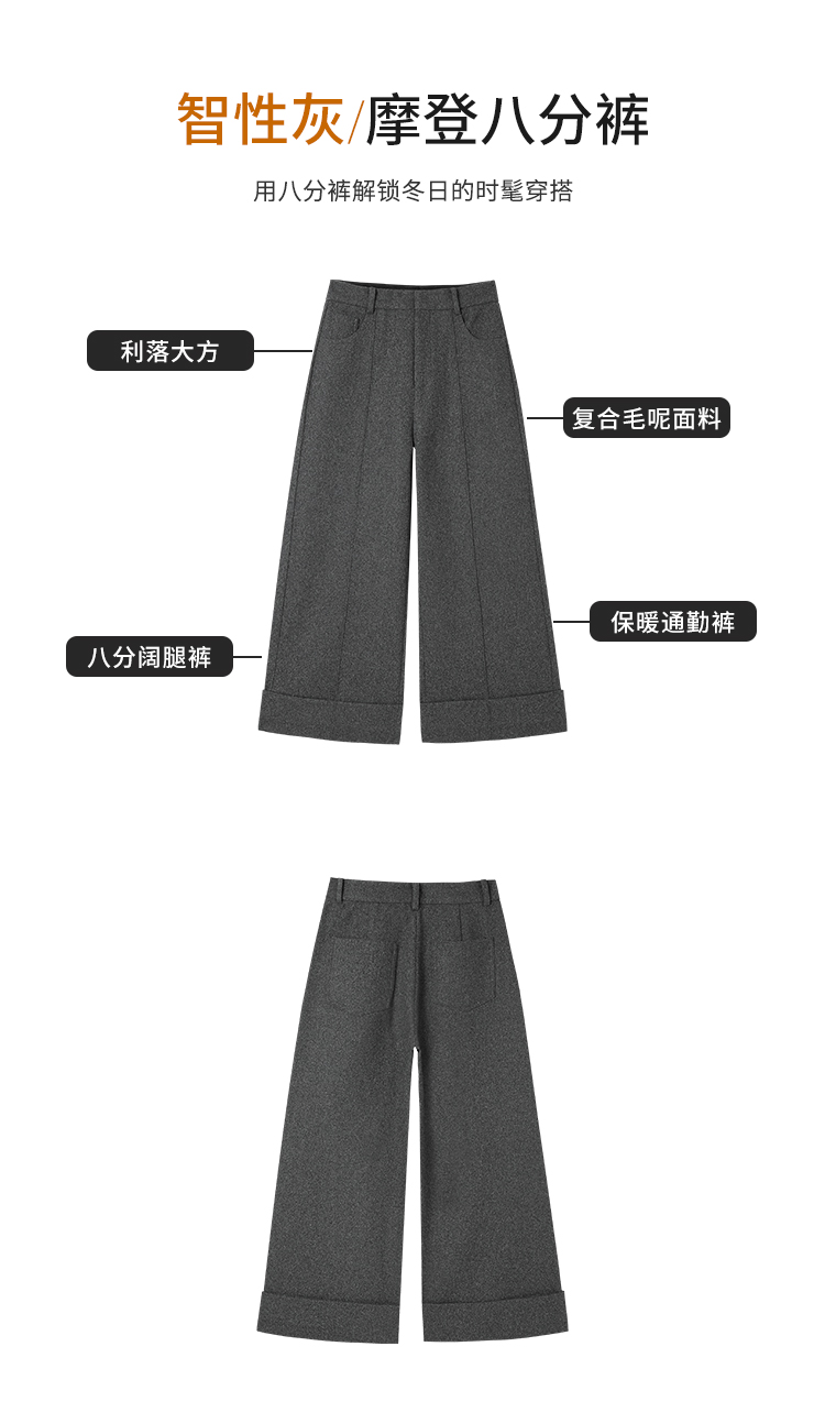 【商场同款】CNT5B44 “ 摩登八分裤 ” 八分阔腿裤, 脚口翻边利落大方 复合毛呢面料挺括有质感