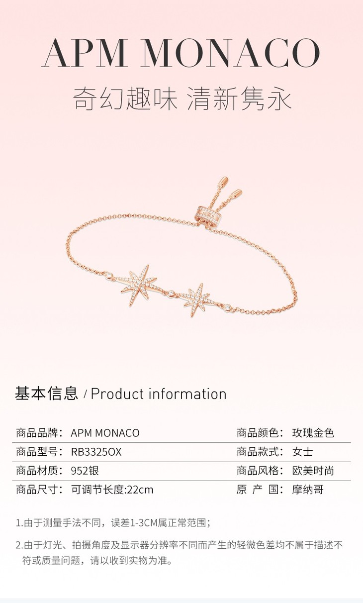【授权商品】APM MONACO 女士粉金色纯银镶晶钻双流星手链 RB3325O