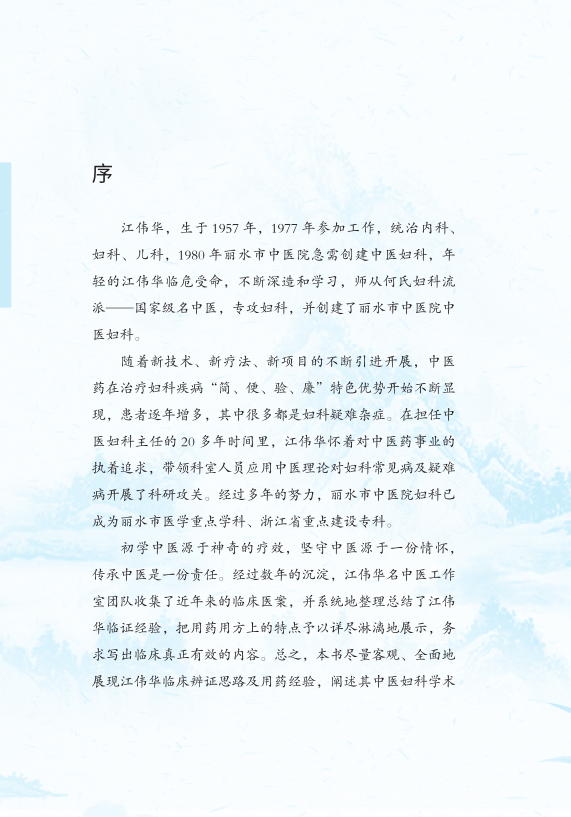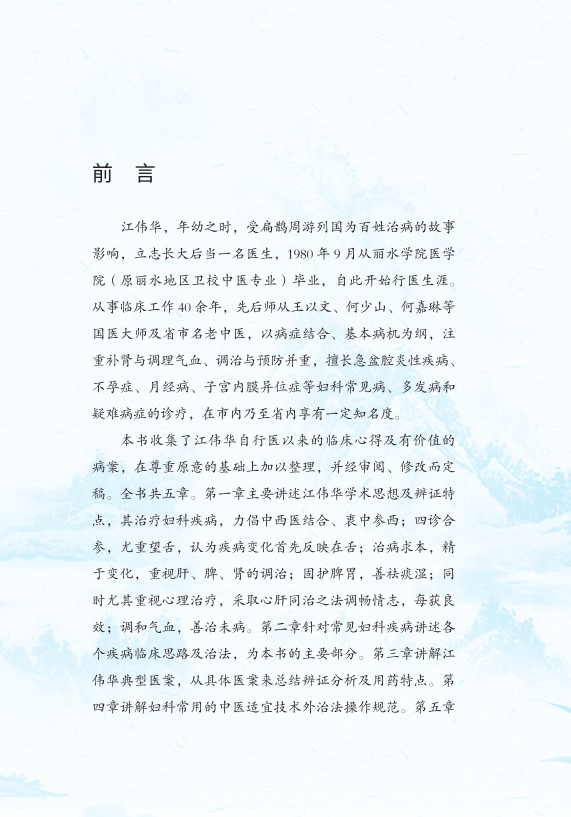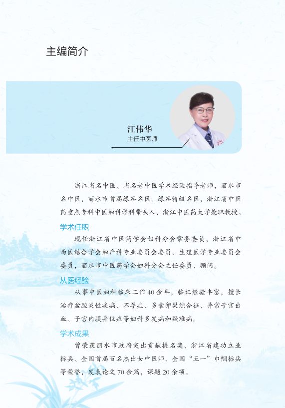 江伟华为浙江省名中医,行医四十余载,诊治病患无殊,擅长治疗各种妇科疾病,如月经不调、不孕症、生殖系统炎症、癥瘕等,疗效卓著。本书系统、全面、真实总结了浙江省名中医江伟华从医四十余年的临证心得体会,并记录了相关验案及中医适宜技术在妇科的应用。本书尽量客观、全面地展现江伟华辨证施治的全过程,阐述其中医妇科学术思想体系,体现具有江氏特色的中医妇科用药经验,以以飨读者。本书适合广大中医妇科临床工作者阅读参考。