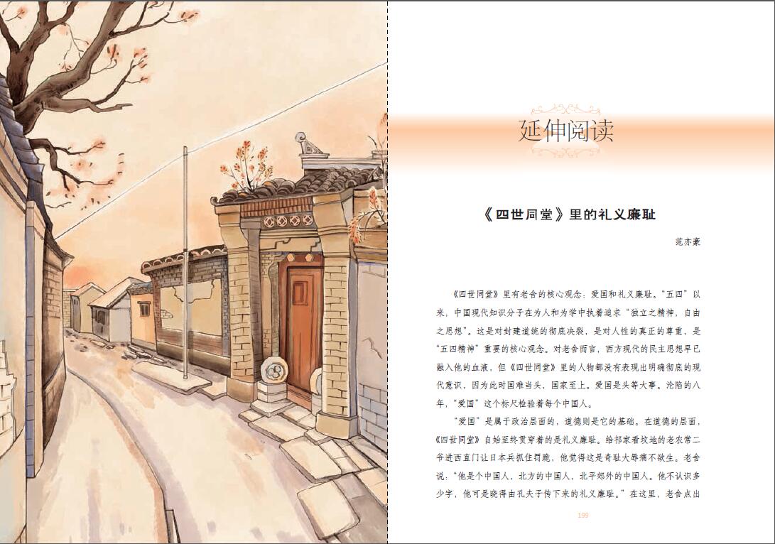 “优等生必读文库·现代名家美文品读系列”中的入选作品均开设“名人推荐”“作家小传”“名师赏析”“延伸阅读”等助读板块,同时,每套书中还特别附赠时长70 分钟的美文朗读光盘一张,期望以此帮助读者在赏读现代名家美文的过程中,阅读零负担,体验百分百,得到高品质文学的滋养。 《四世同堂》是老舍长篇小说的代表作,老舍认为这是“它是我从事写作以来*长的、可能也是*好的一本书”。作品以抗日战争中沦陷的北京城一条小小的胡同——小羊圈胡同为背景,以祁家四世同堂的生活为主线,写出了背负亡国之痛的众生群像,也揭露了日寇和汉奸的种种罪行和丑态。