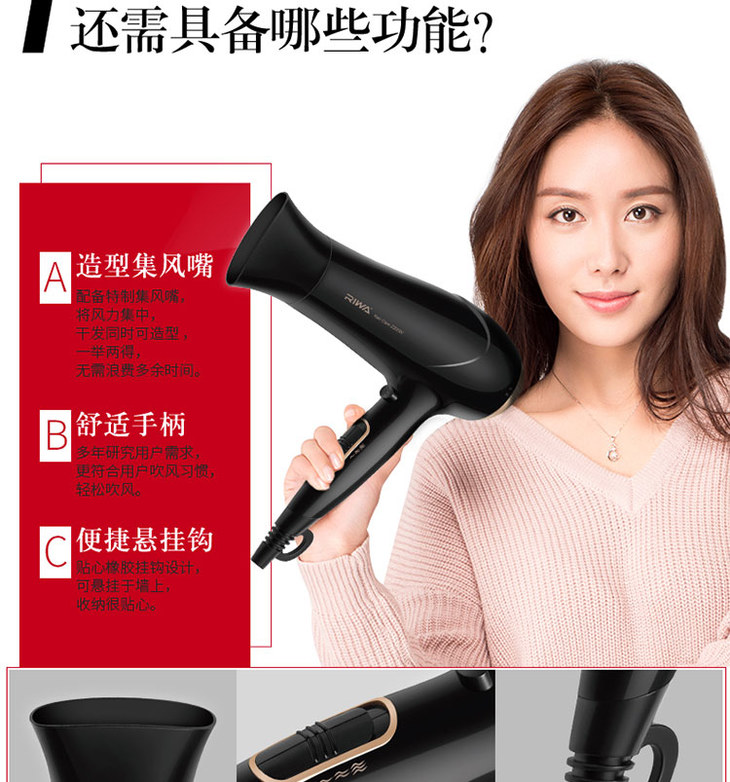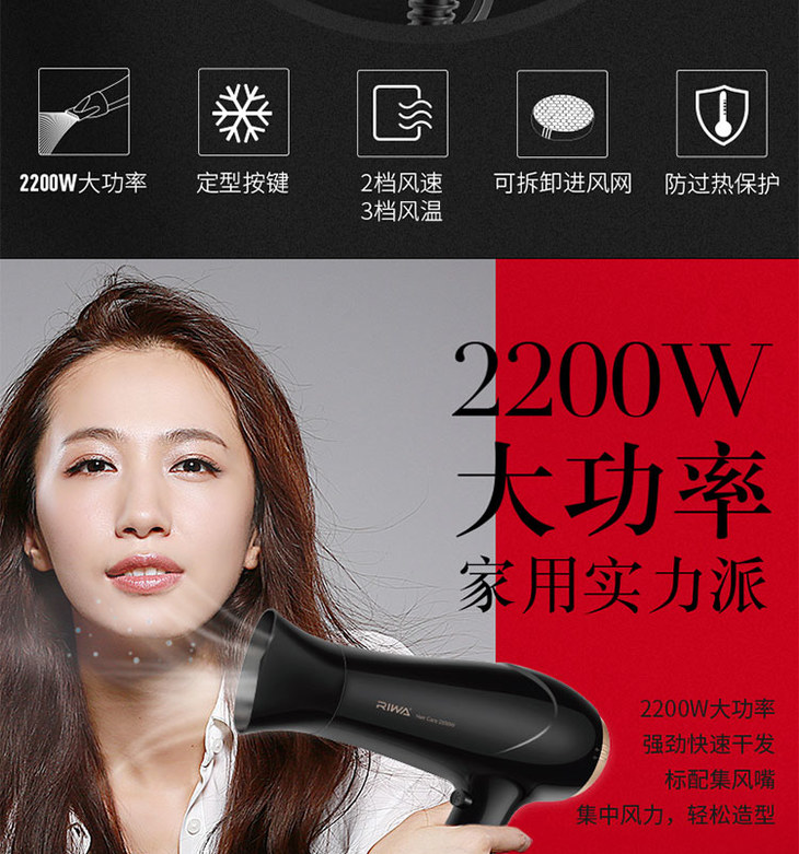 雷瓦(RIWA) 雷瓦(Riwa)电吹风2200W家用大功率吹风机速干恒温 造型风筒 RC-7161(白色)