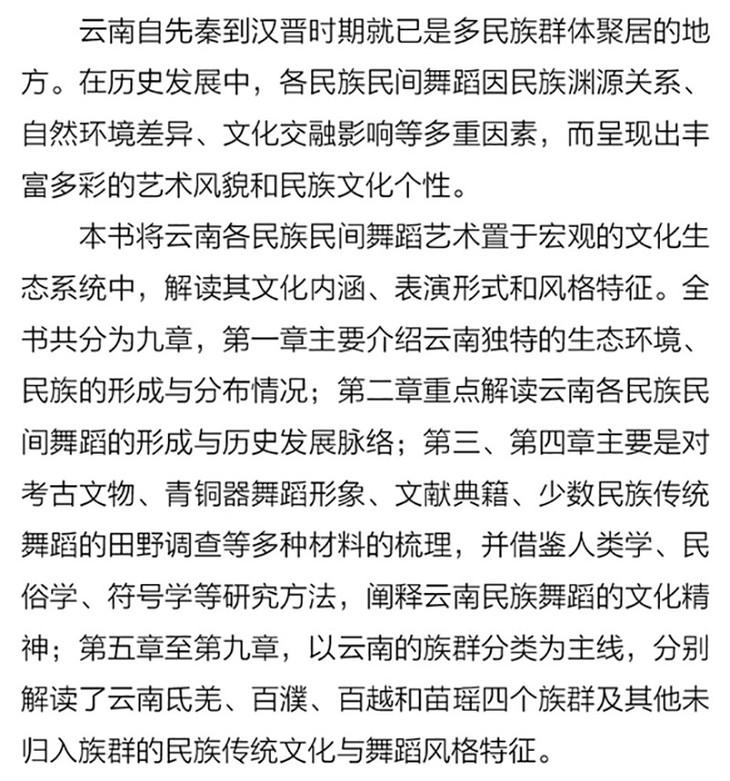 本书运用文化人类学和艺术学研究方法,将云南各民族民间舞蹈艺术置于宏观的文化生态系统中,解读其文化内涵、表演形式和风格特征,并注重在一定的学术高度上兼具艺术性、知识性和可读性。全书共分为九章。第一章主要介绍云南独特的自然生态环境和社会历史发展背景。第二章重点解读云南各民族民间舞蹈的形成与历史发展脉络。第三、四章通过对考古文物、青铜器舞蹈形象、文献典籍、少数民族传统舞蹈的田野调查等多种材料的梳理,借鉴人类学、民俗学、符号学等研究方法,全面解读云南民族舞蹈的文化精神。第五章至第九章,以云南的族群分类为主线,分别描述了云南氐羌、百濮、百越和苗瑶四个族群及其他未归入族群的民族传统文化与舞蹈风格特征。