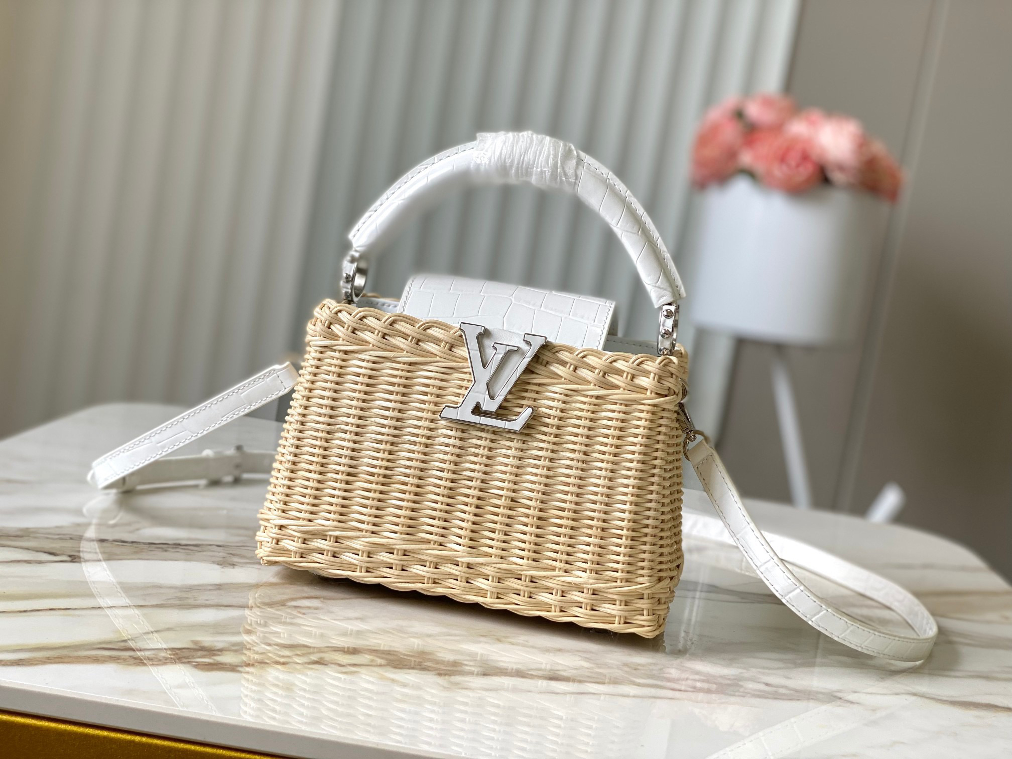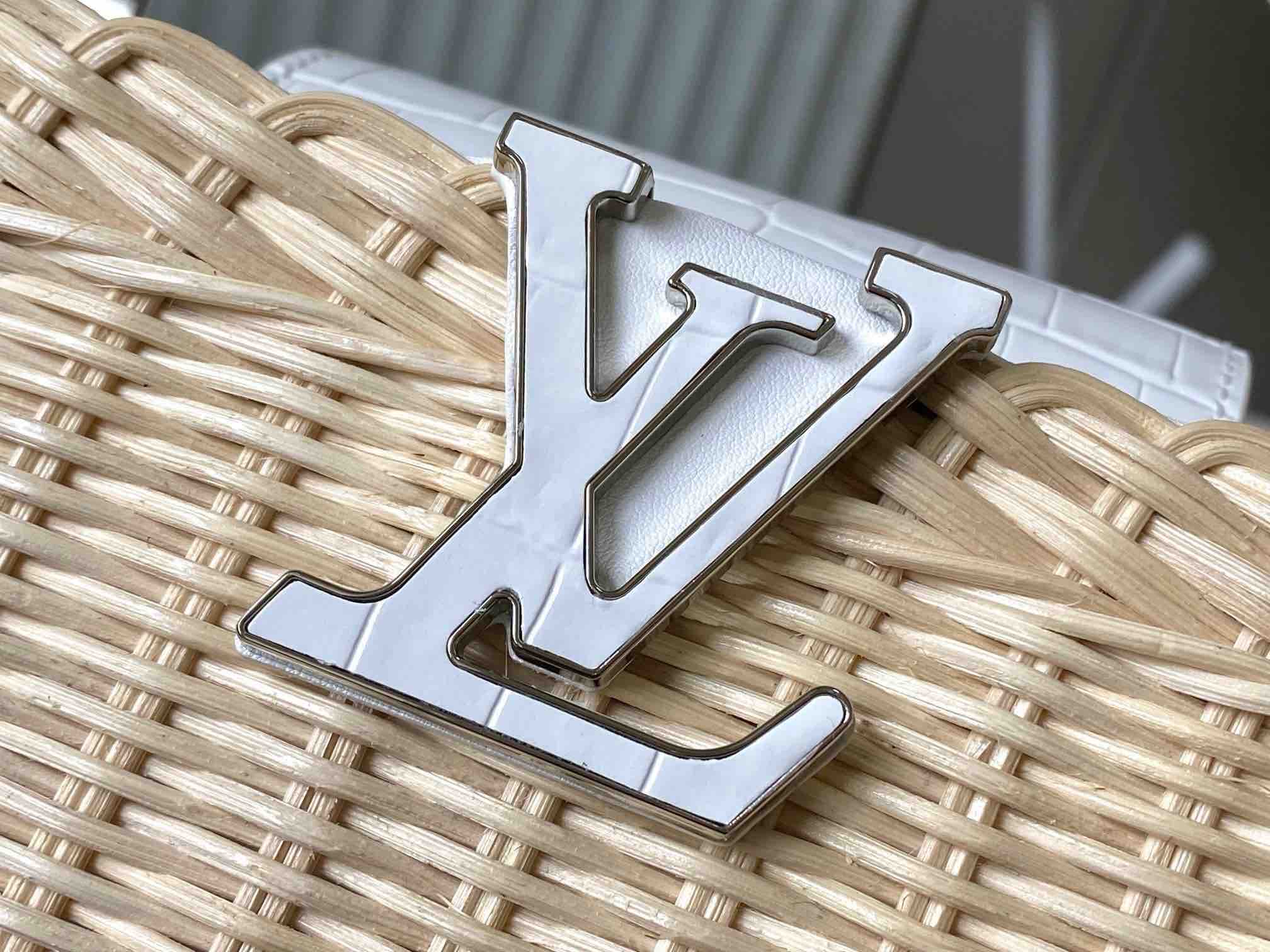 秋冬特惠💰1600 渠道级LV 新品 te级LV 动态芯片 N85520/M48865白鳄鱼竹篮 本款Capucines手袋向路易威登于1892年推出的Picnic 硬箱汲取灵感 洋溢浓郁夏日风情 藤条包身需要数天的匠心编织方可完成 皮革饰边和耀目LV 字母完善细节 斜挎、肩背或手提皆宜 Size : 21 * 14 * 8 CM