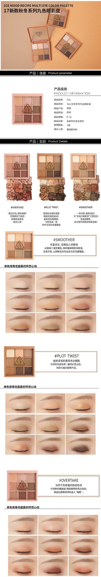 韩国3CE 新款情调秋冬9色眼影盘九色珠光哑光南瓜色大地色