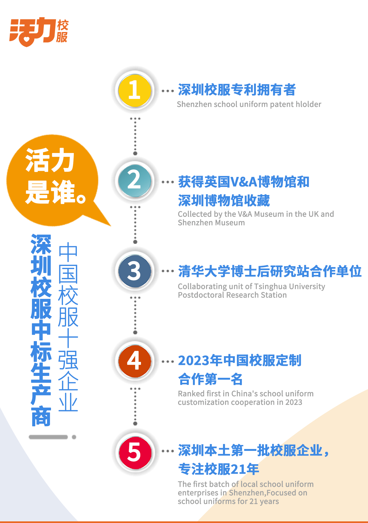 活力校服由深圳市中南活力实业股份有限公司创建的品牌,深圳二十一年老品牌,教育局中标企业;主营深圳校服、广州校服、东莞校服、佛山校服、肇庆校服、江苏校服、鞋袜、学生床上用品等学生课桌椅一站式教育领域产品