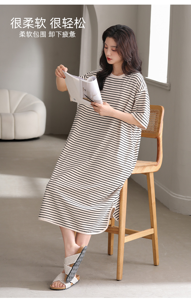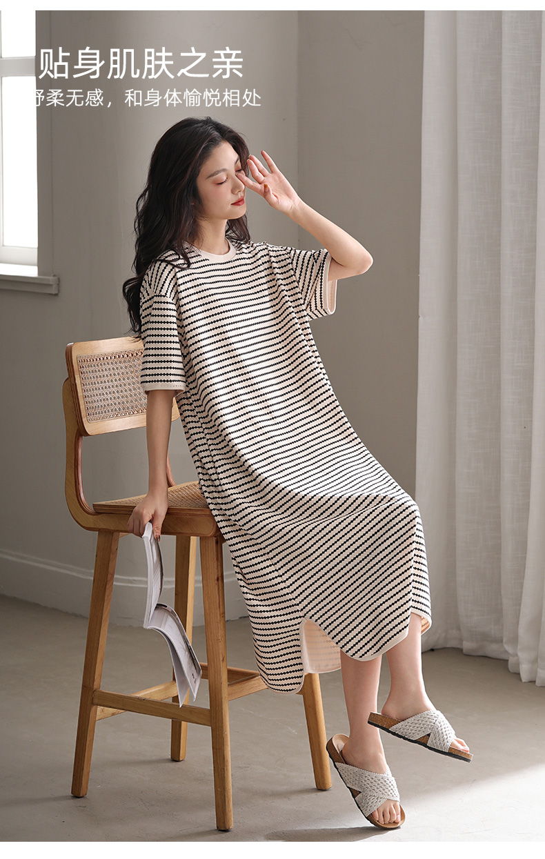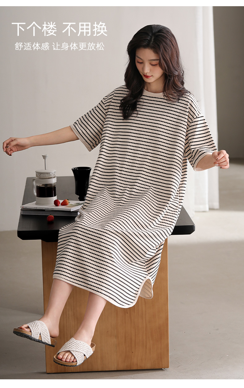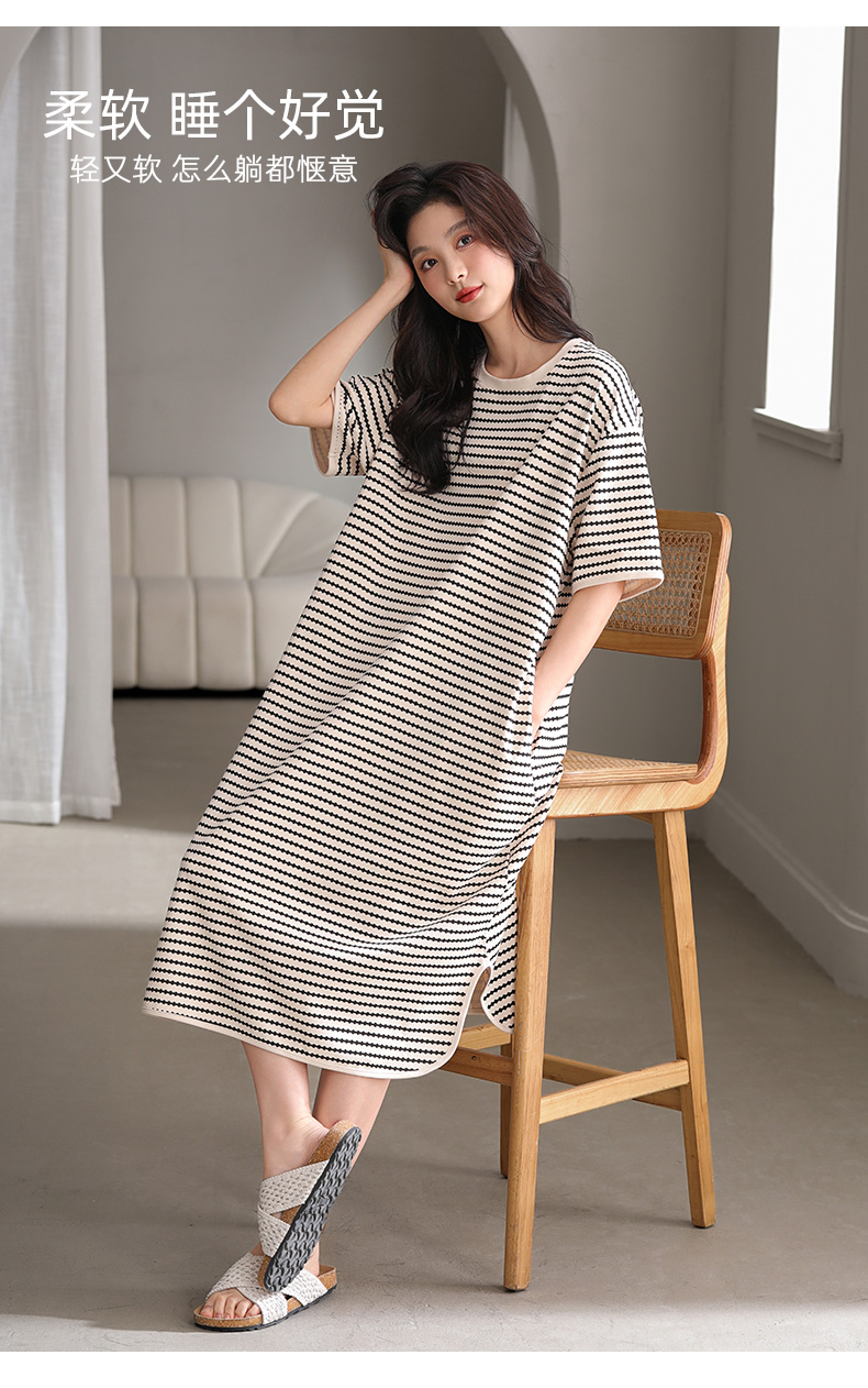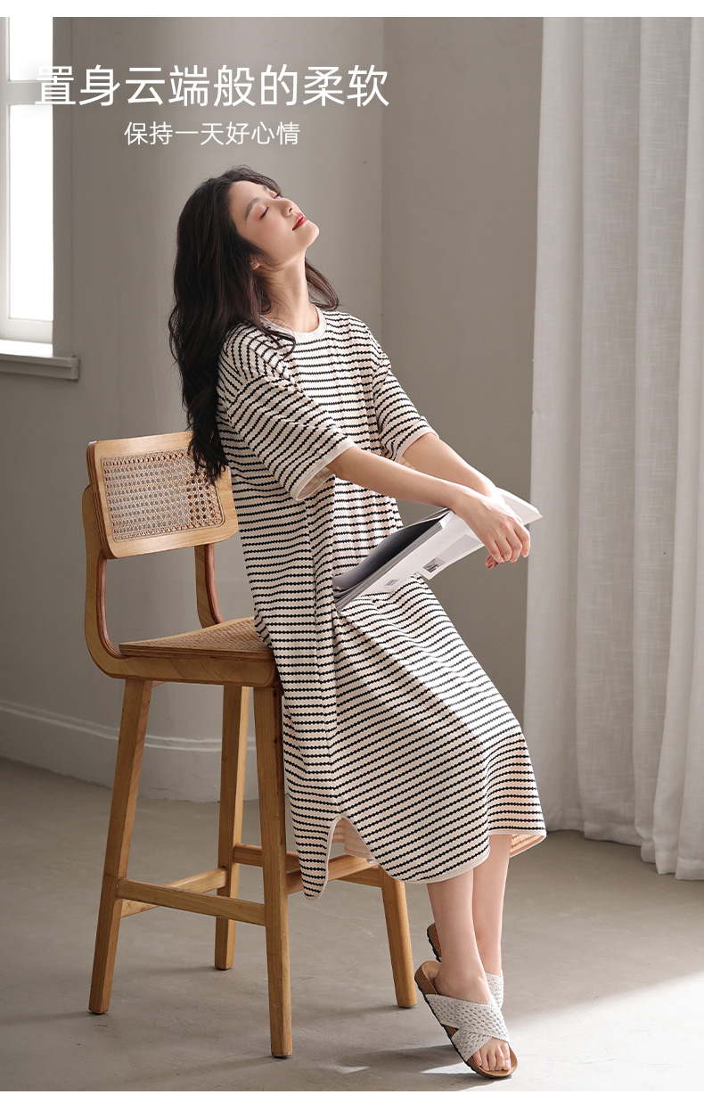 洁丽雅新款睡裙过膝薄款夏季条纹连衣裙短袖休闲宽松可外穿睡衣女