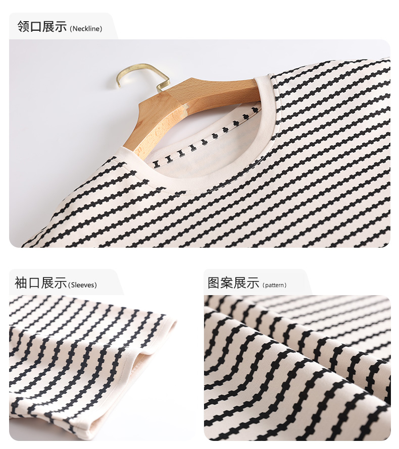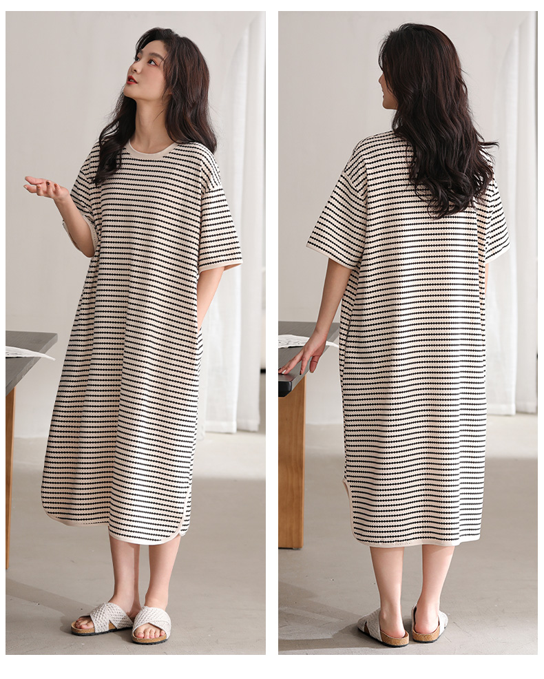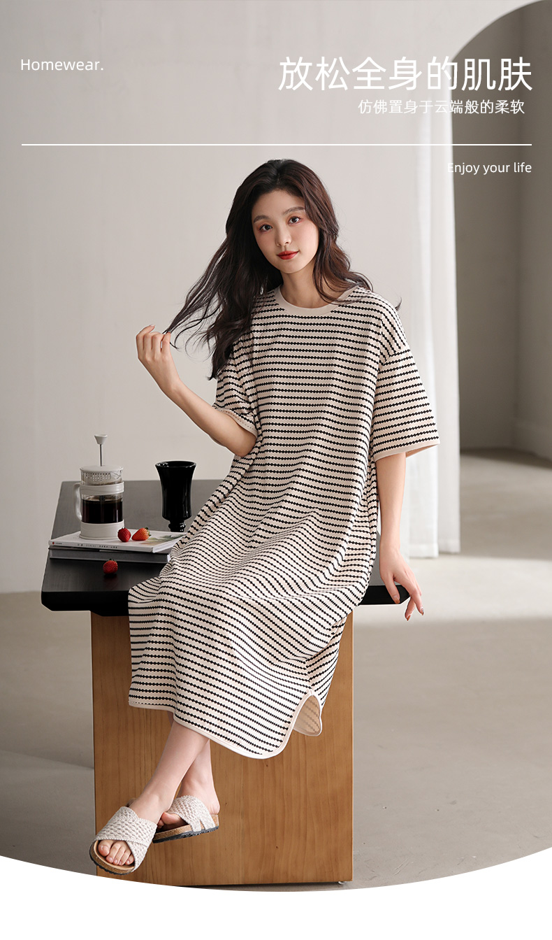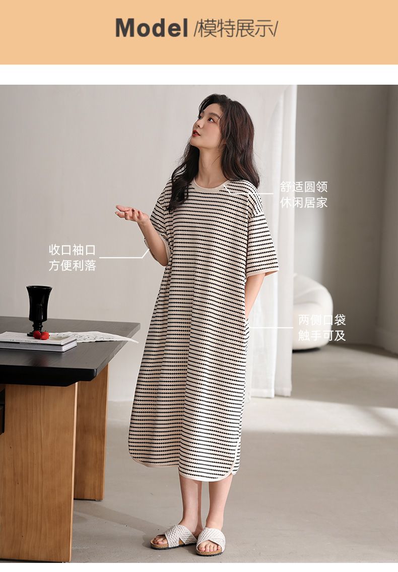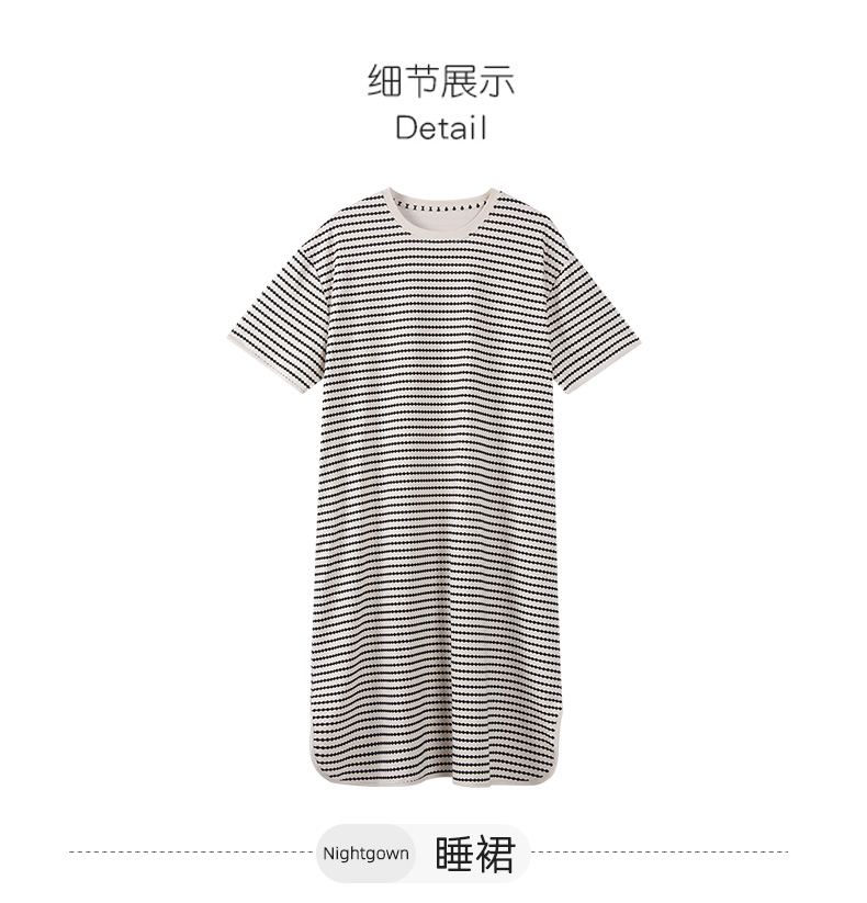 洁丽雅新款睡裙过膝薄款夏季条纹连衣裙短袖休闲宽松可外穿睡衣女