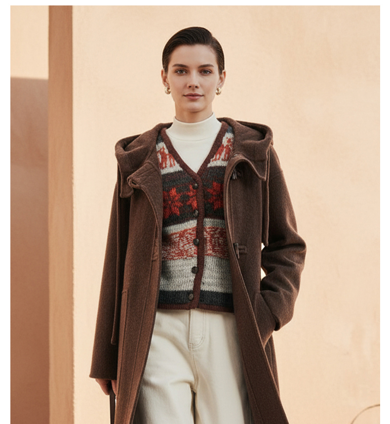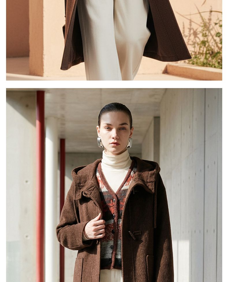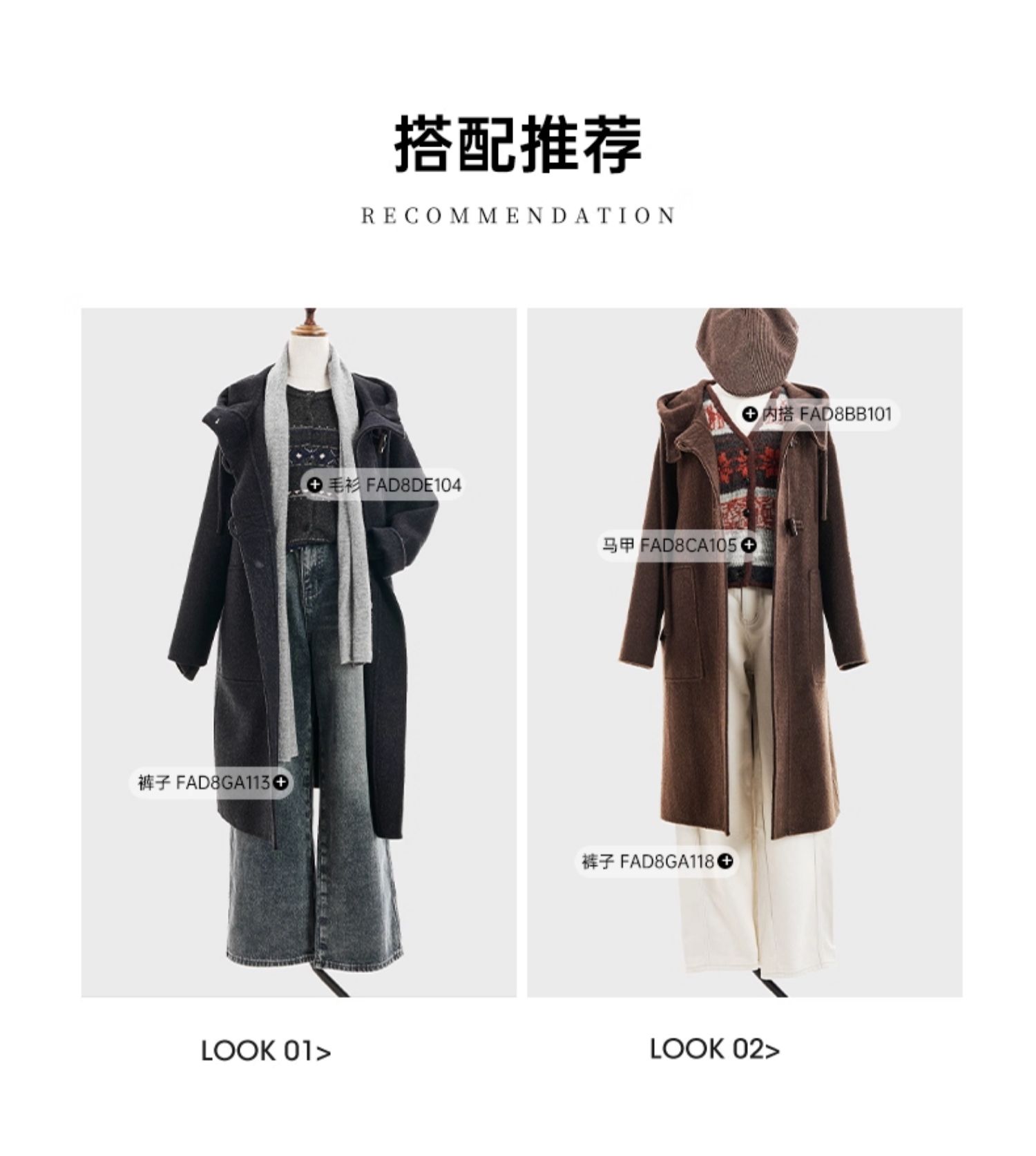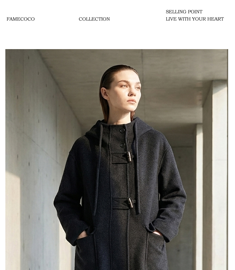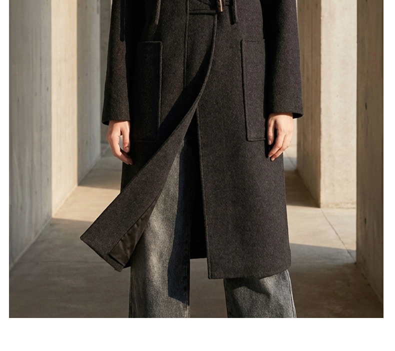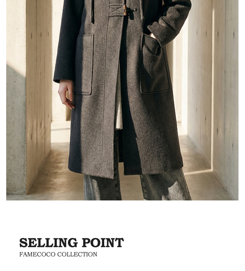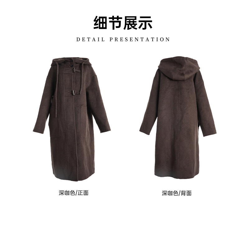 Famecoco范可儿宽松休闲连帽牛角扣大衣长款双面尼外套FAD8AQ108