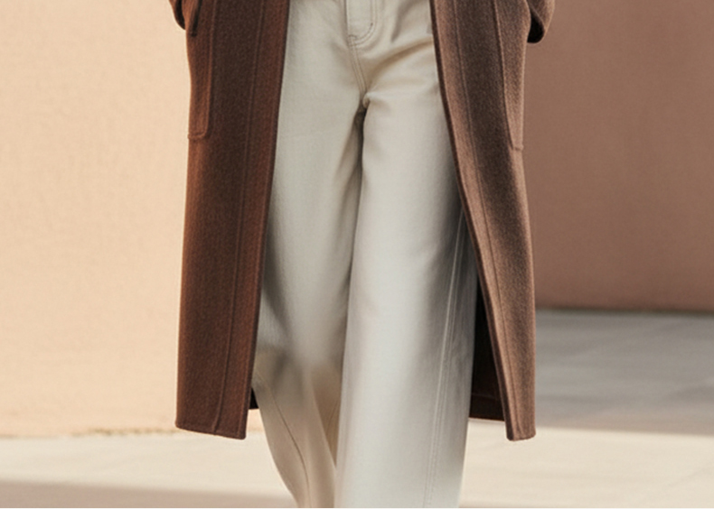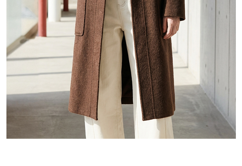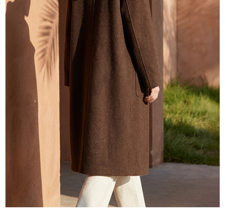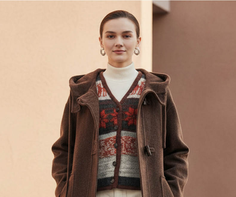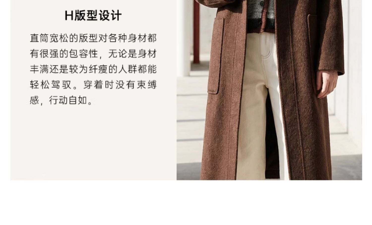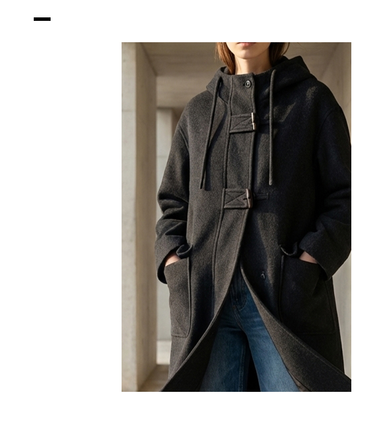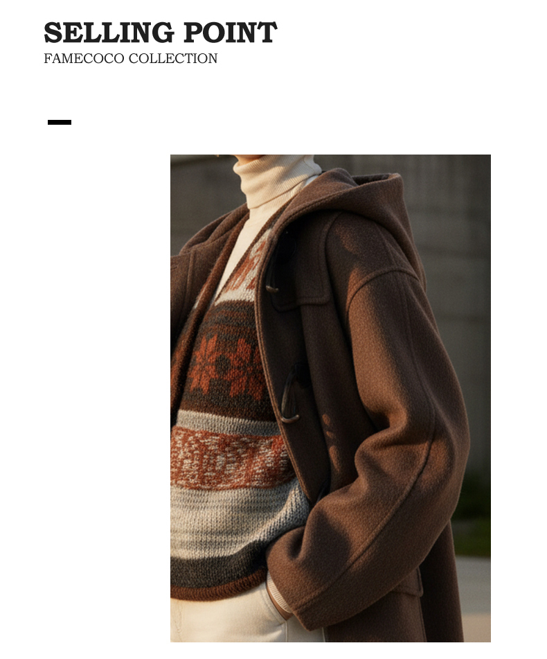 Famecoco范可儿宽松休闲连帽牛角扣大衣长款双面尼外套FAD8AQ108