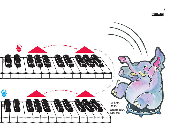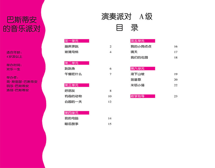 此外,《巴斯蒂安的音乐派对》还是当前低幼钢琴教材市场上紧缺的、可作为钢琴集体课用书的教程,书中不仅在每课的教学指导中给出了如何在集体课上进行教学,还对那些可作为演出、比赛等活动的曲目给出了具体的建议。