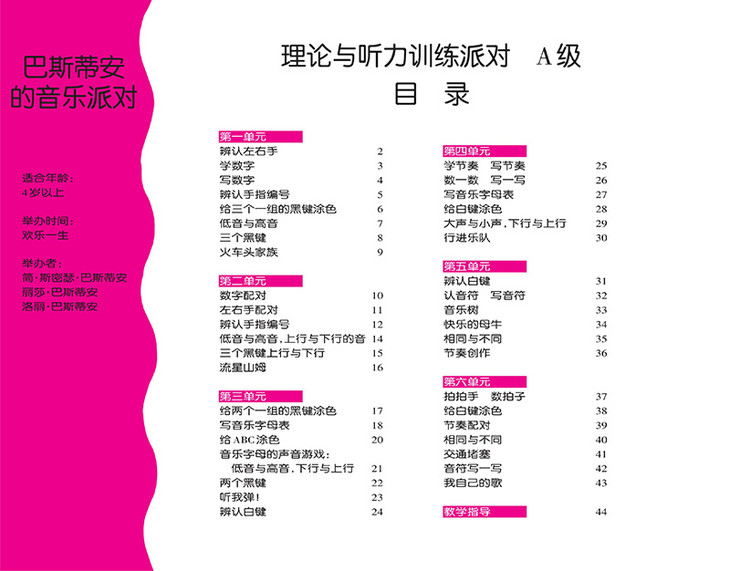 《巴斯蒂安的音乐派对》共包含13本图书,由“4+1”的模式构成。“4”是指这套教程分为A、B、C、D四个级别,每个级别包含3本图书,分别为“钢琴派对”“理论与听力训练派对”和“演奏派对”,其中“钢琴派对”内容为基本课程,“理论与听力训练派对”多是以游戏形式引导孩子对音乐知识和音乐听力进行训练,“演奏派对”则是与课程进度配套的补充曲目。“1”是指在4个级别总计12本书之余,还有一本以独特方法引导低幼龄孩子认识音符和乐谱的《读谱教程》。