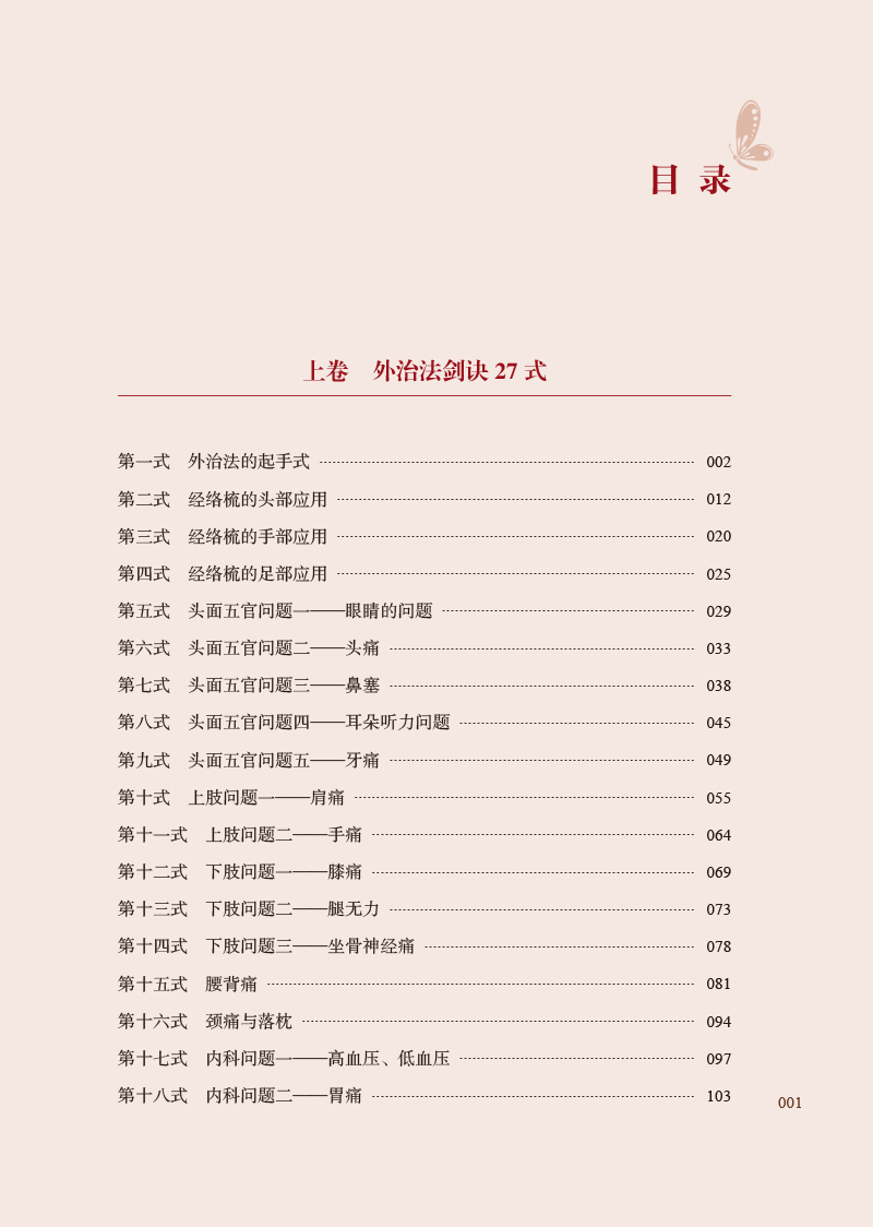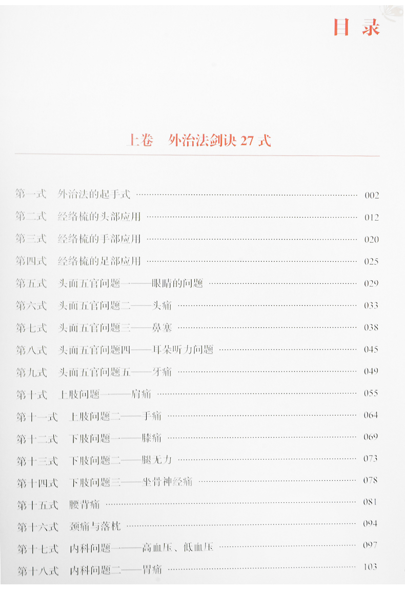 本书分为上下两卷,上卷为《外治法剑诀 27 式》,下卷为《经络学心法 18 篇》。