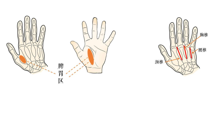 就拿我们的手部来说,有两个按推的重要位置,一是脾胃区,二是颈椎、胸椎、腰椎的三条缝。
