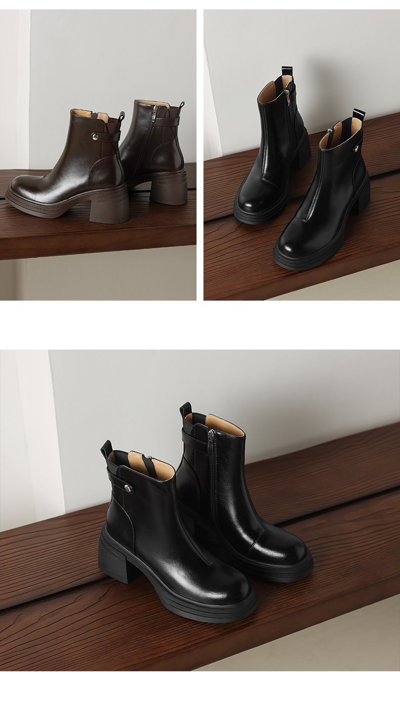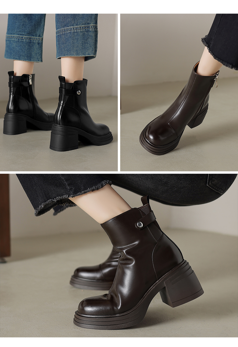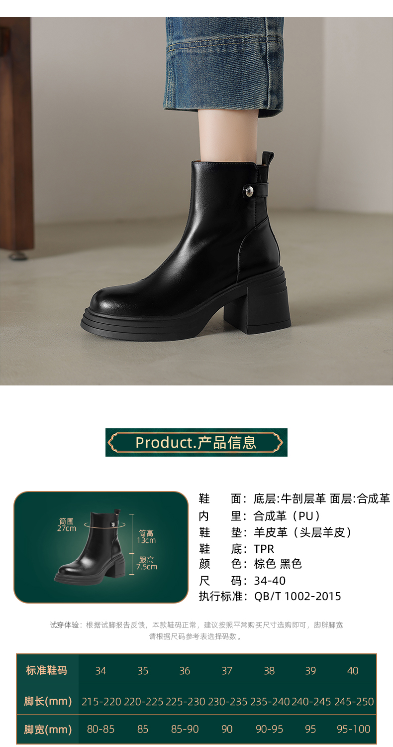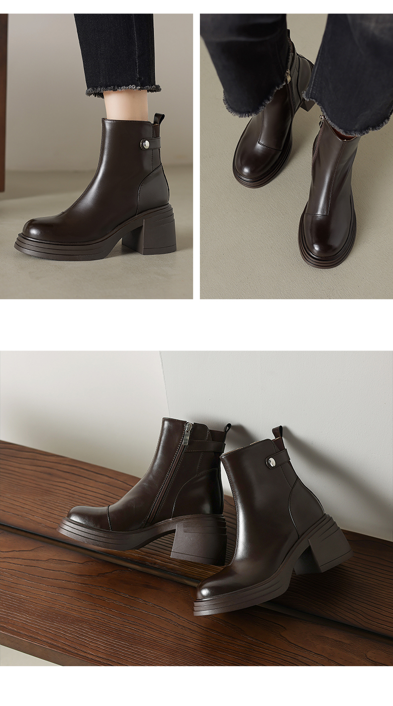 阿么手工女鞋新款小个子高跟真皮短靴2025新款纯色英伦单靴7.5CM