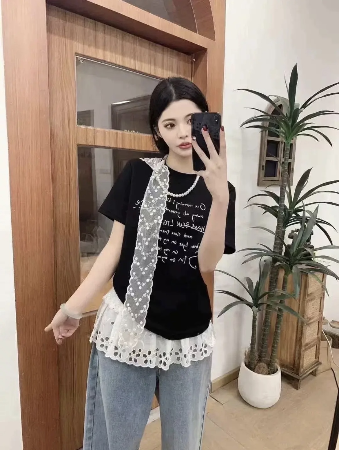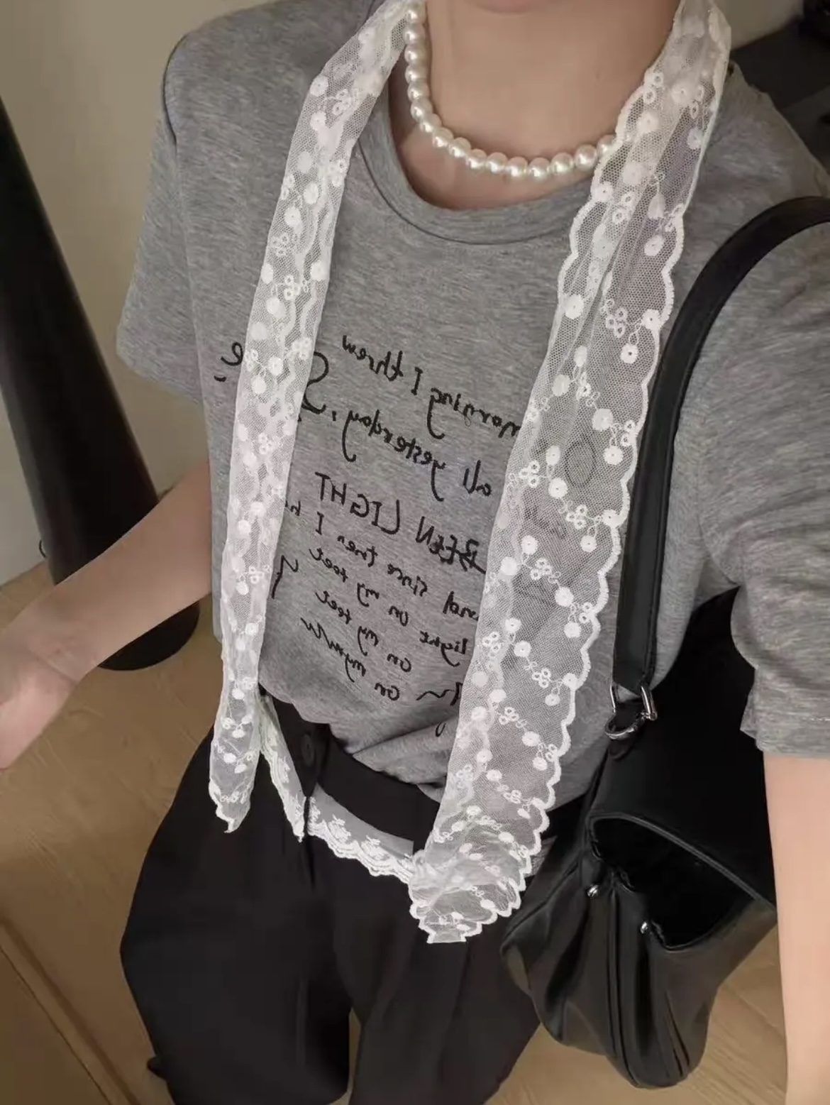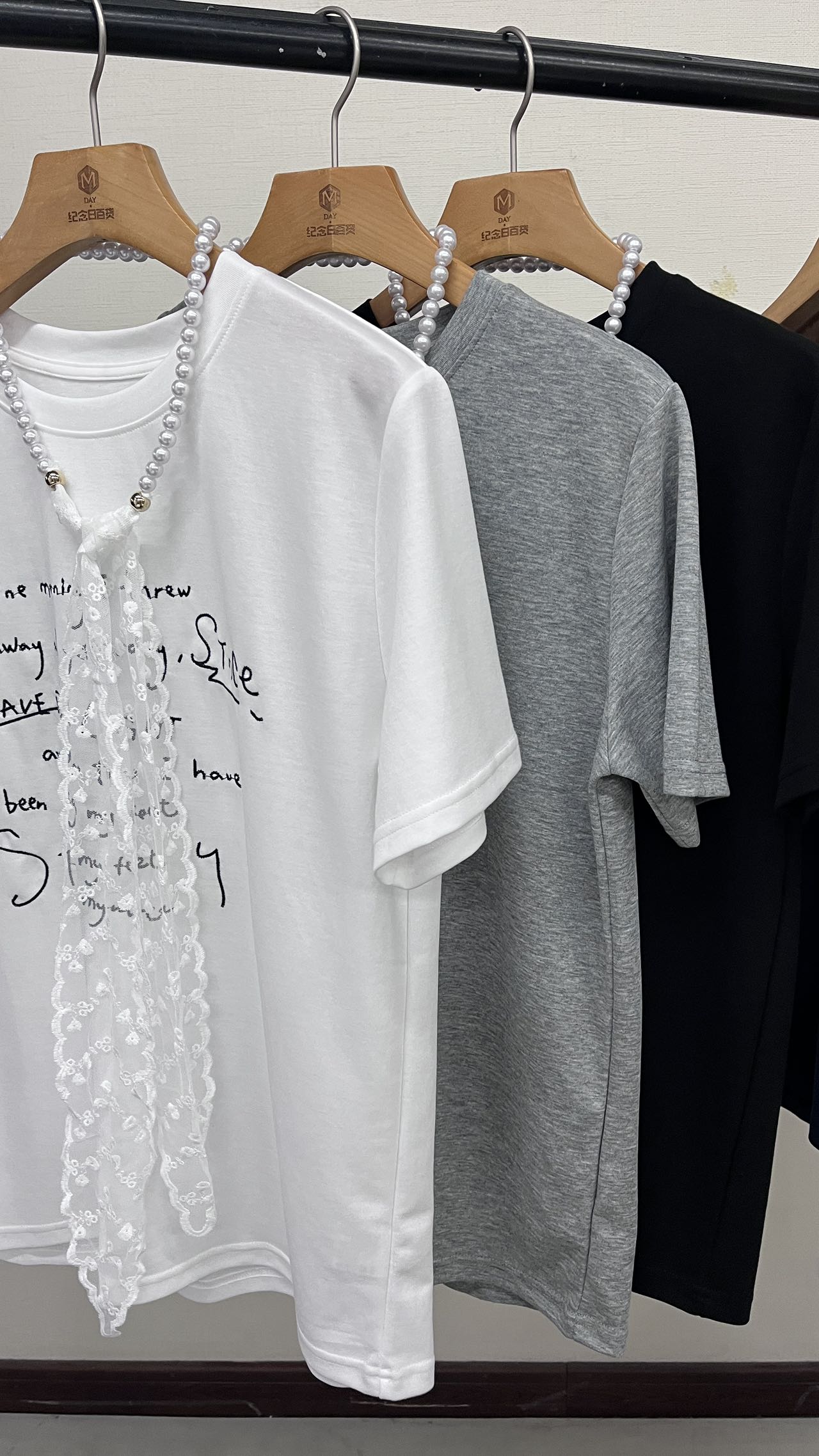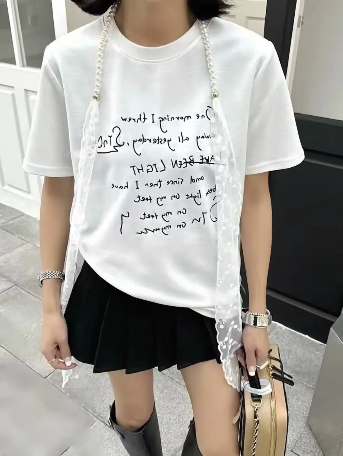 【YW】无忧购韩系珍珠蕾丝飘带项链纯棉百搭字母刺绣短袖T恤10029(截单后7天发货)