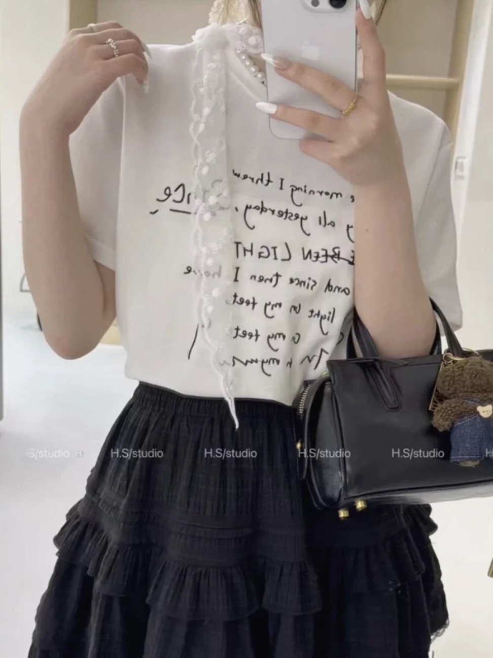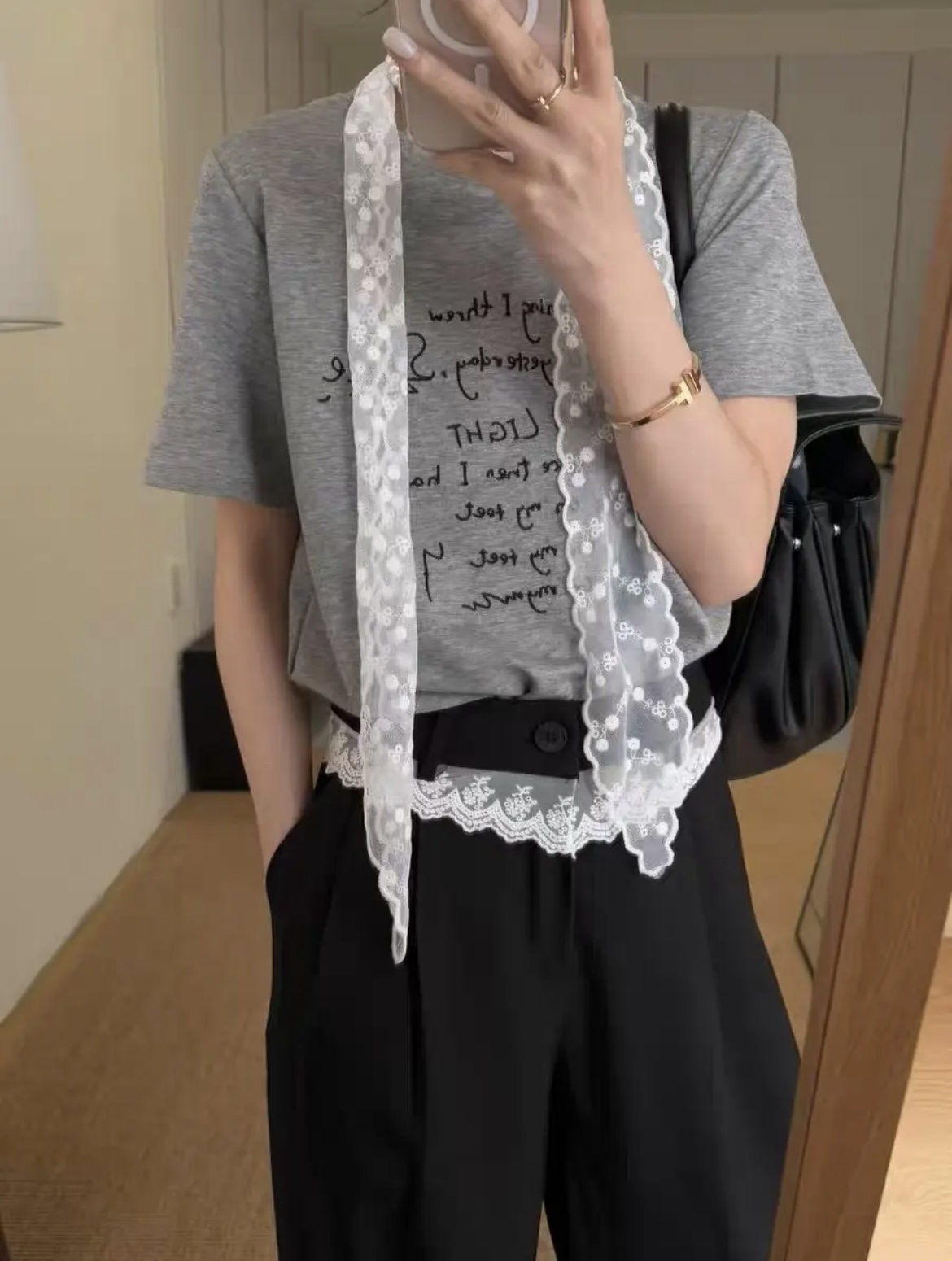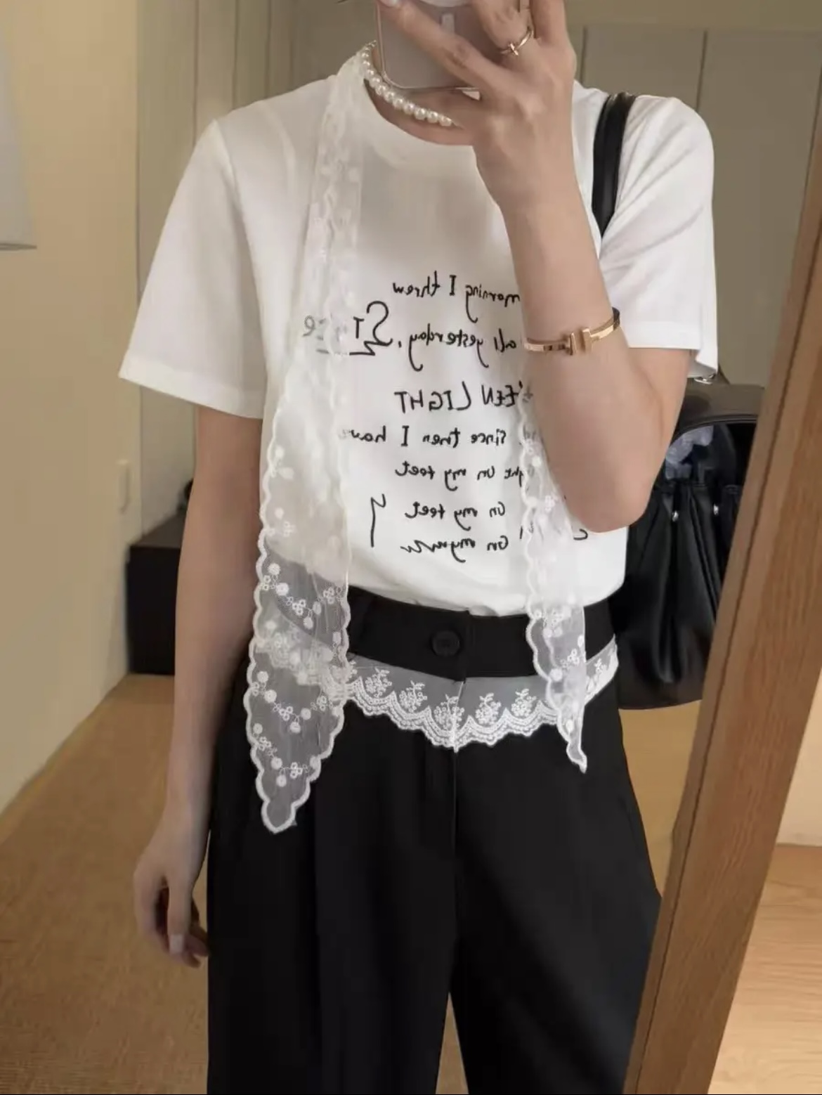 【YW】无忧购韩系珍珠蕾丝飘带项链纯棉百搭字母刺绣短袖T恤10029(截单后7天发货)
