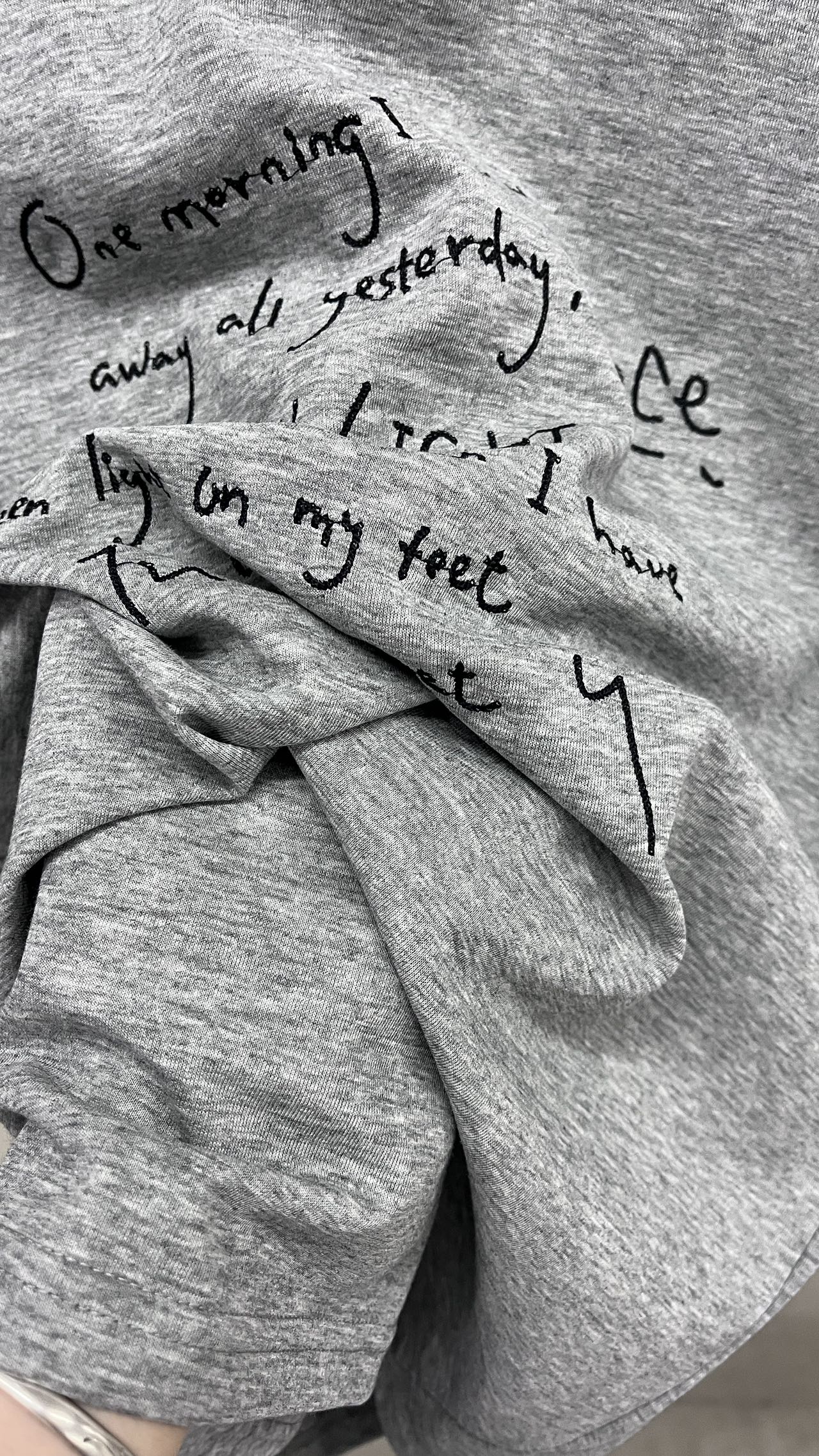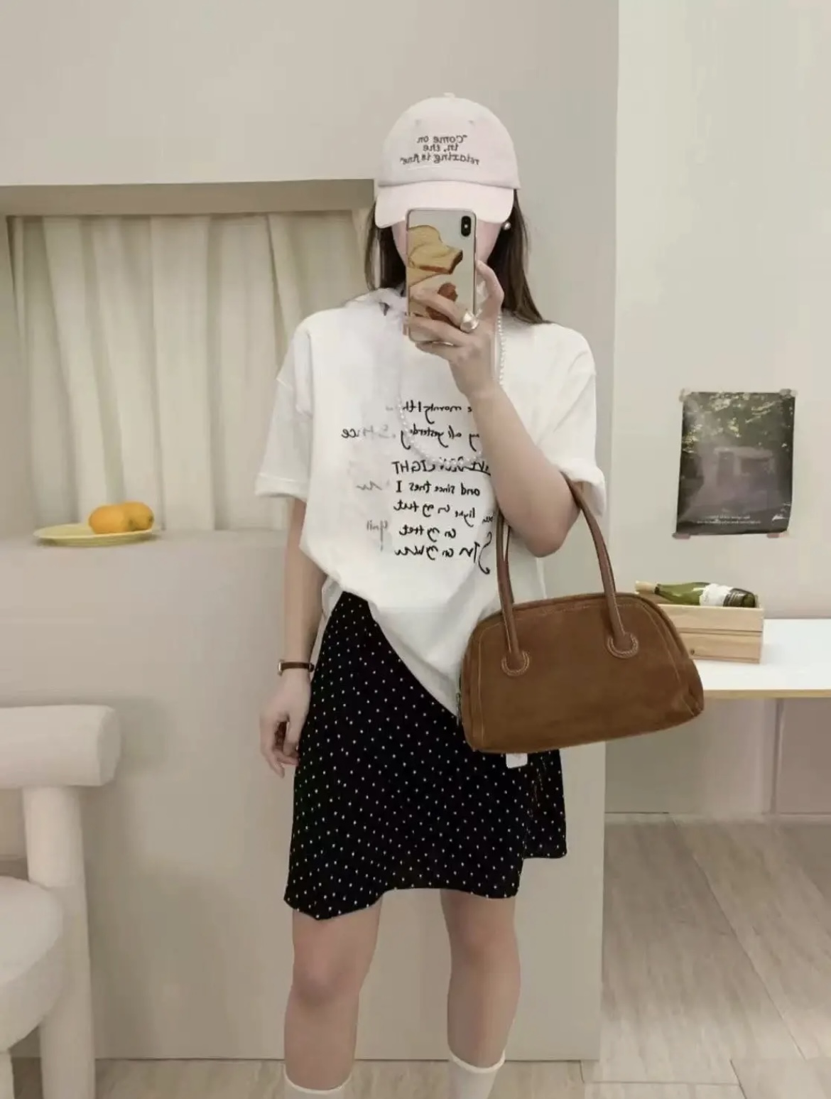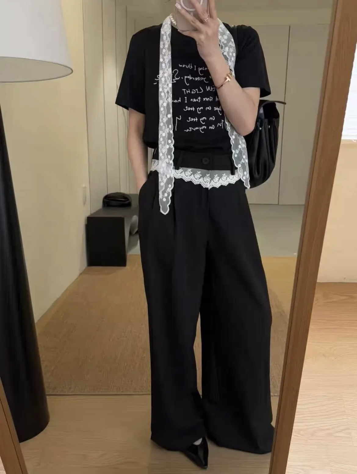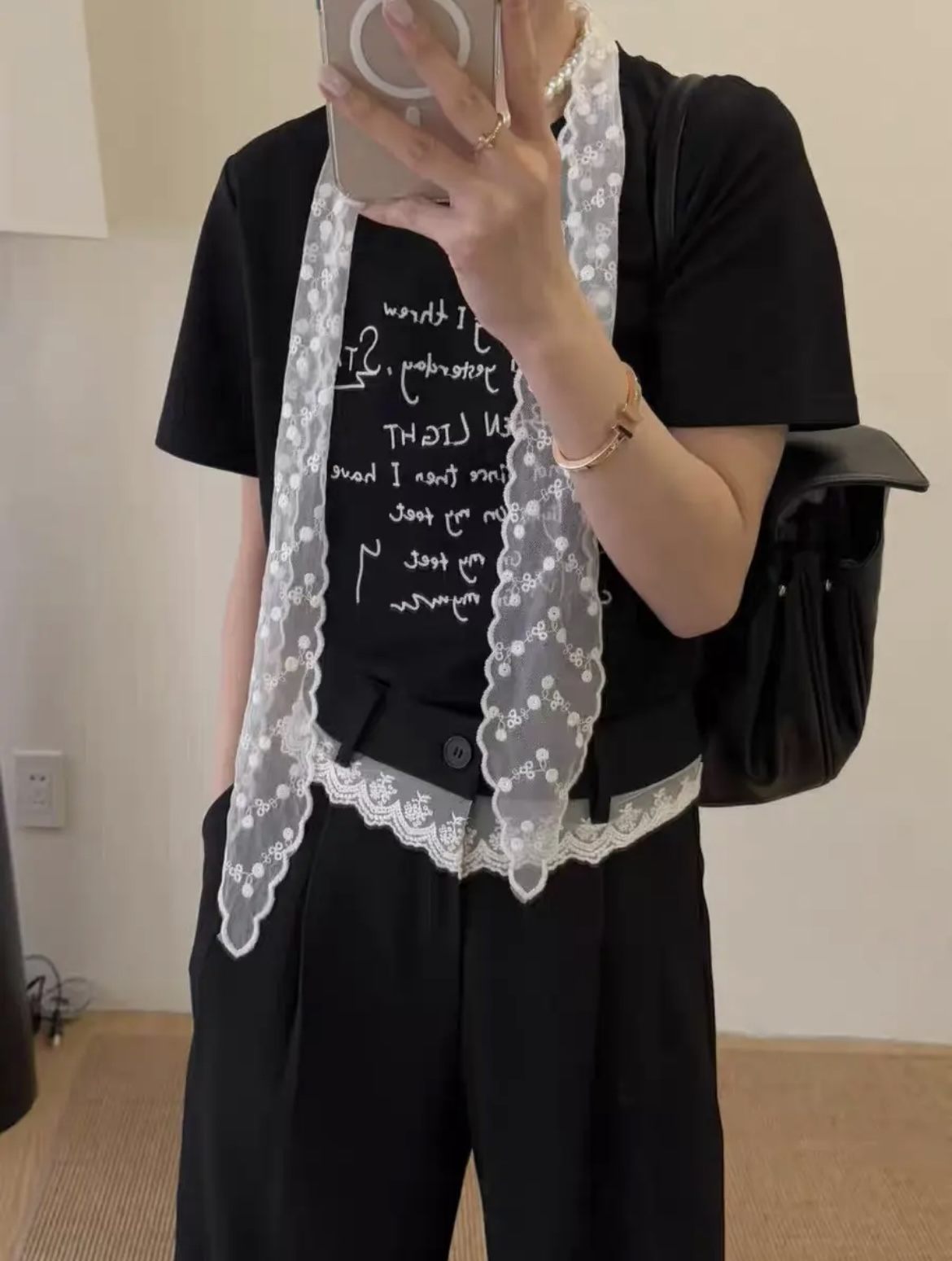 【YW】无忧购韩系珍珠蕾丝飘带项链纯棉百搭字母刺绣短袖T恤10029(截单后7天发货)