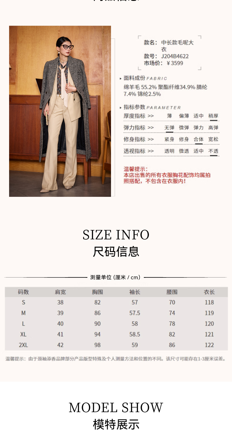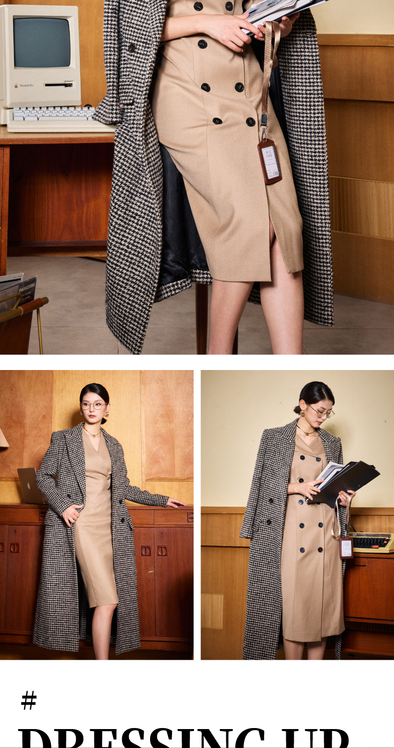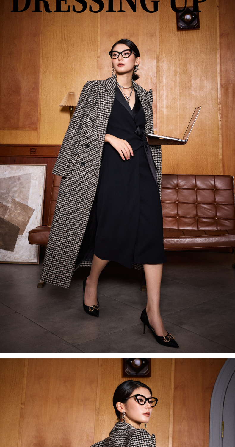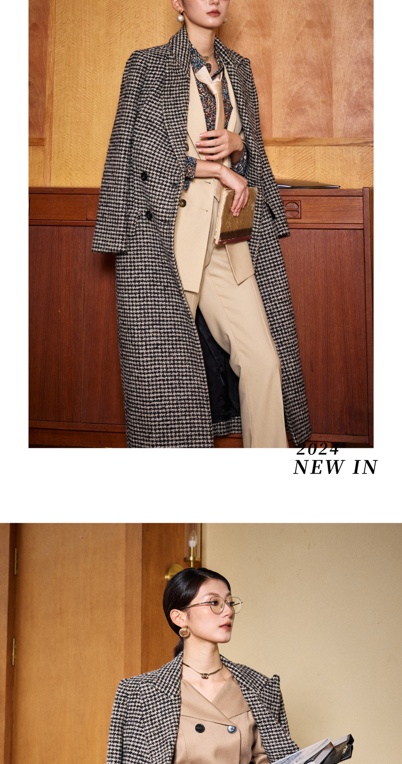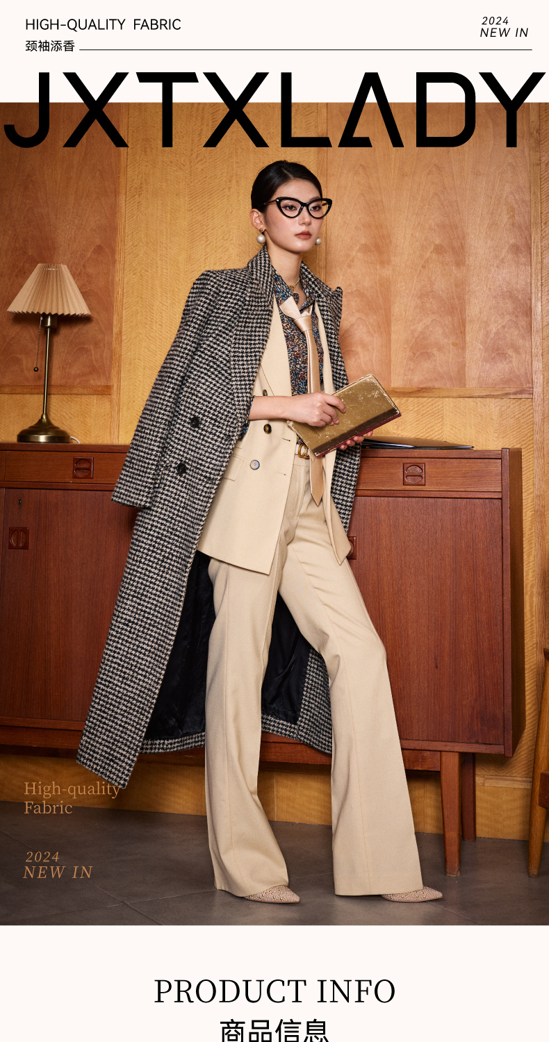 ”摩登年代“复古千鸟格修身大衣复古女人味J204B4622颈袖添香