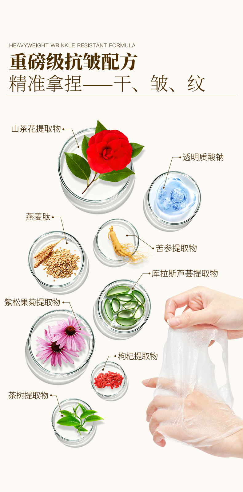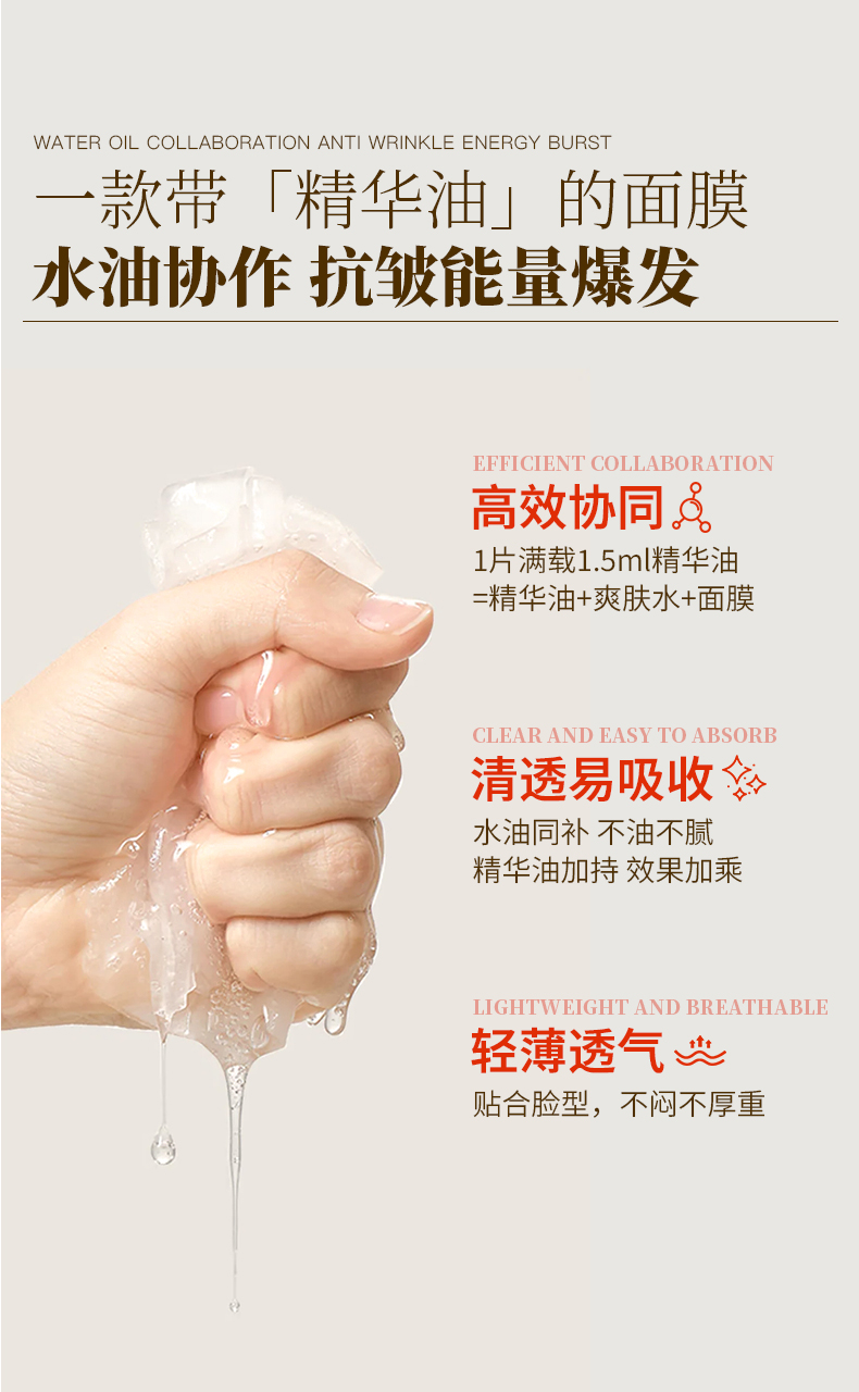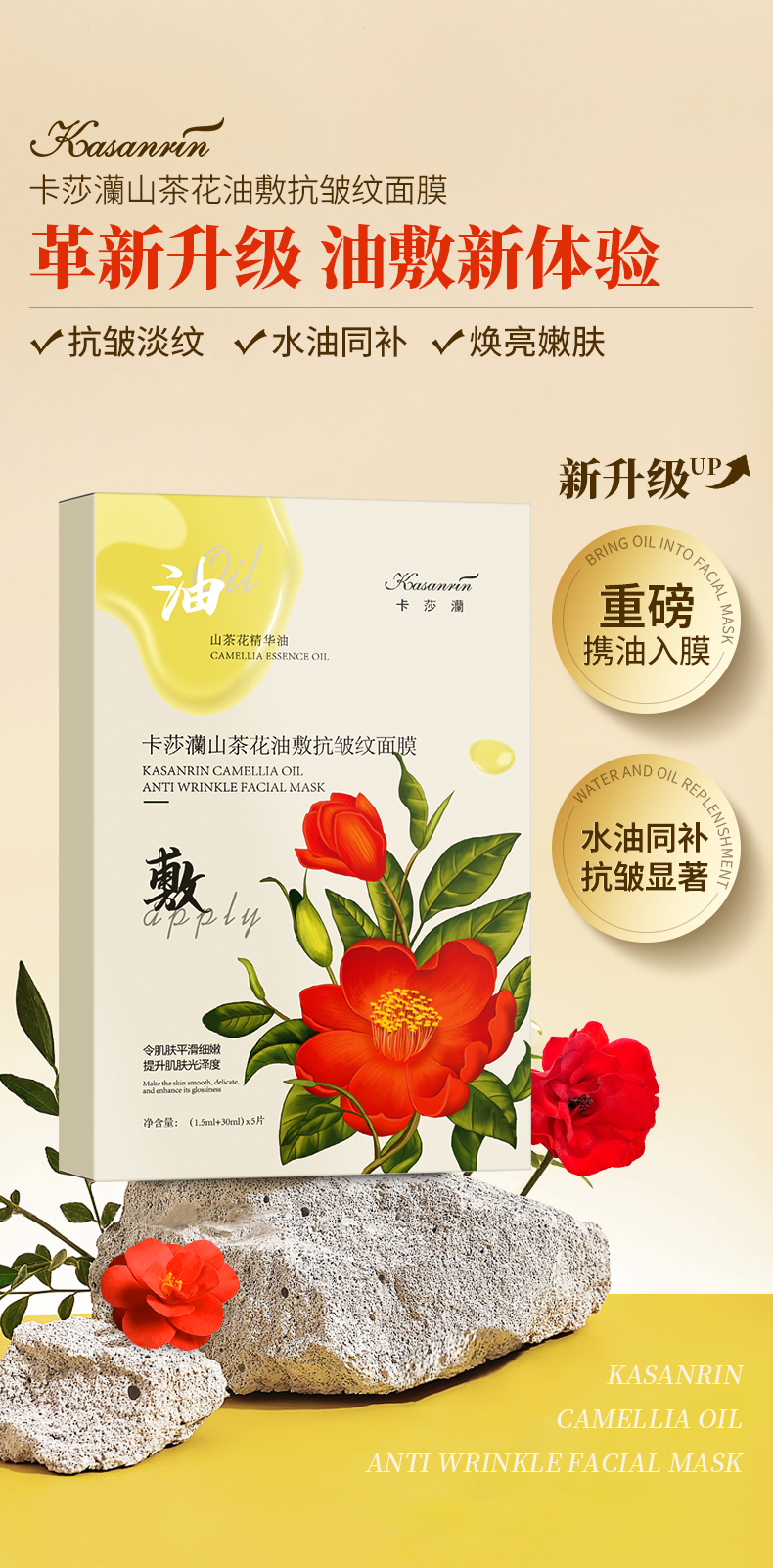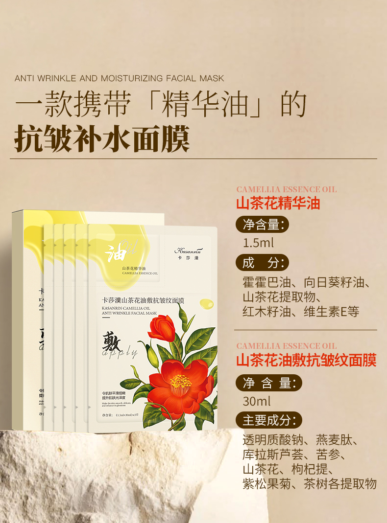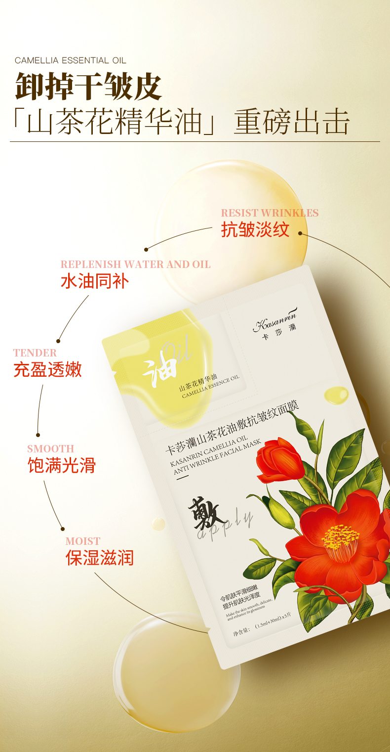 卡莎灡山茶花油敷抗皱纹面膜,精华+精华油双仓面膜,淡化细纹,改善干皮。