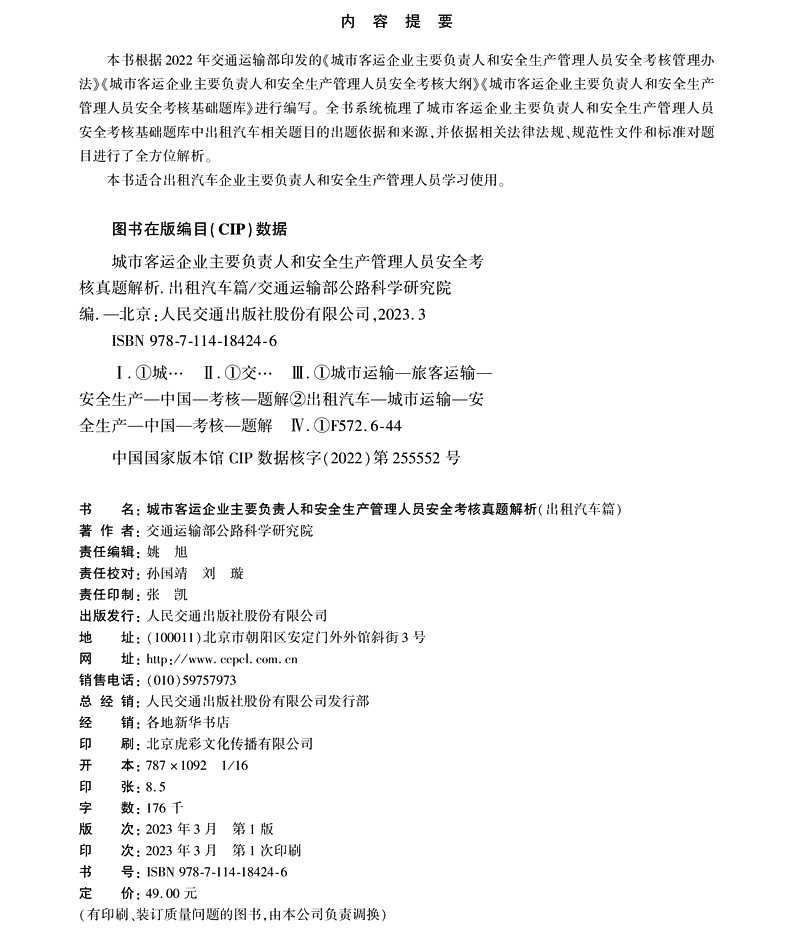 书名:城市客运企业主要负责人和安全生产管理人员安全考核真题解析(出租汽车篇)