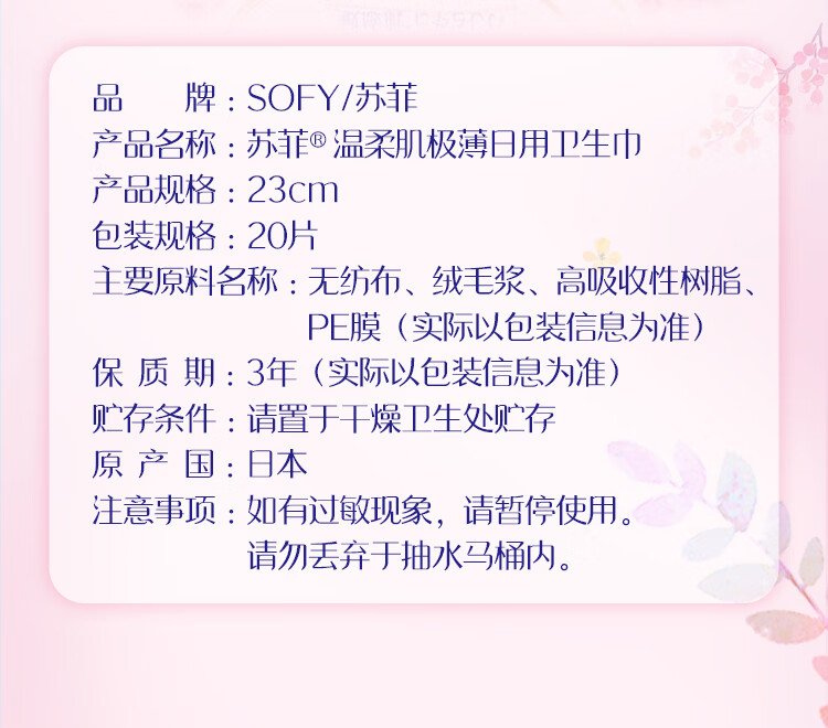 苏菲温柔肌进口日用卫生巾230mm20片