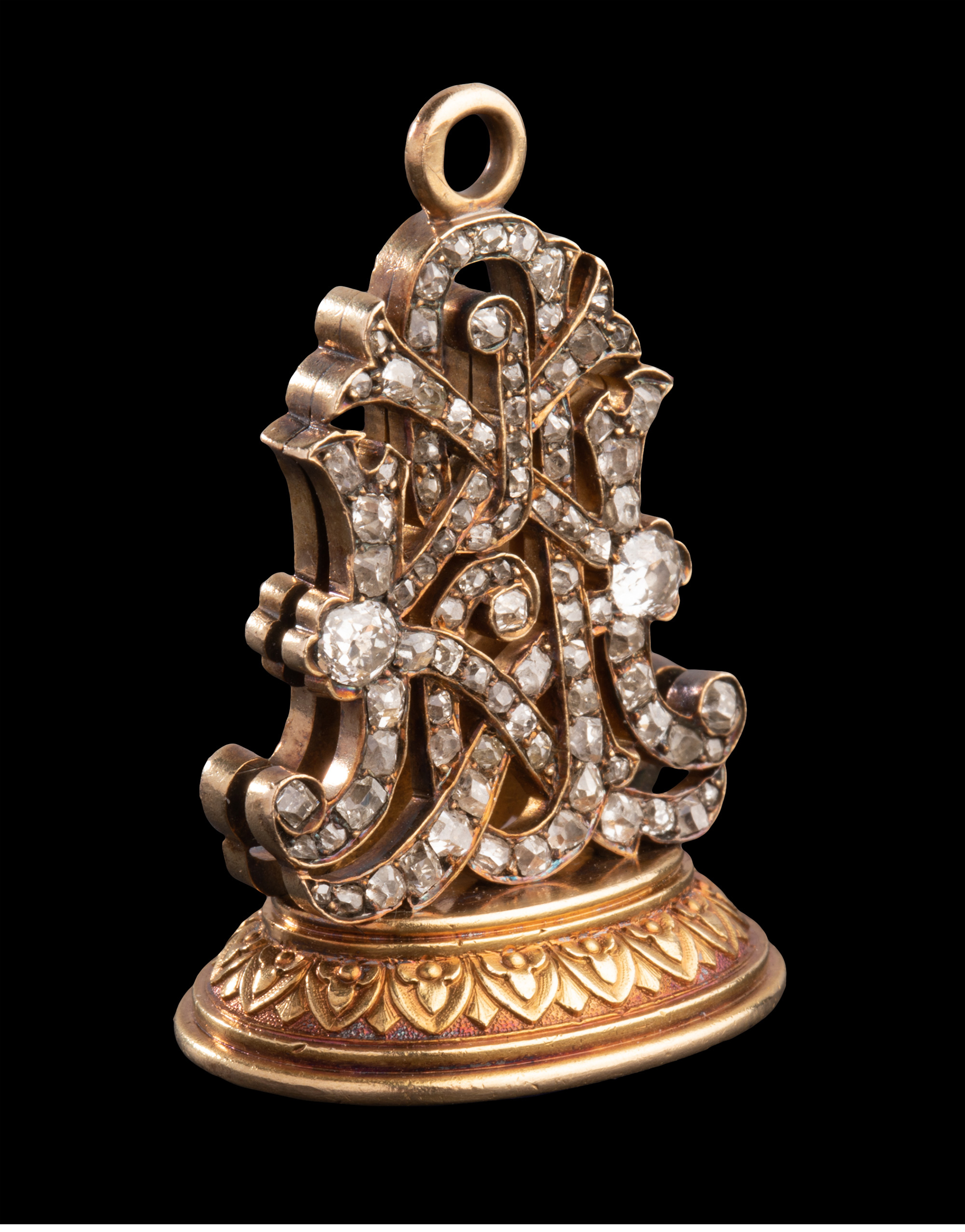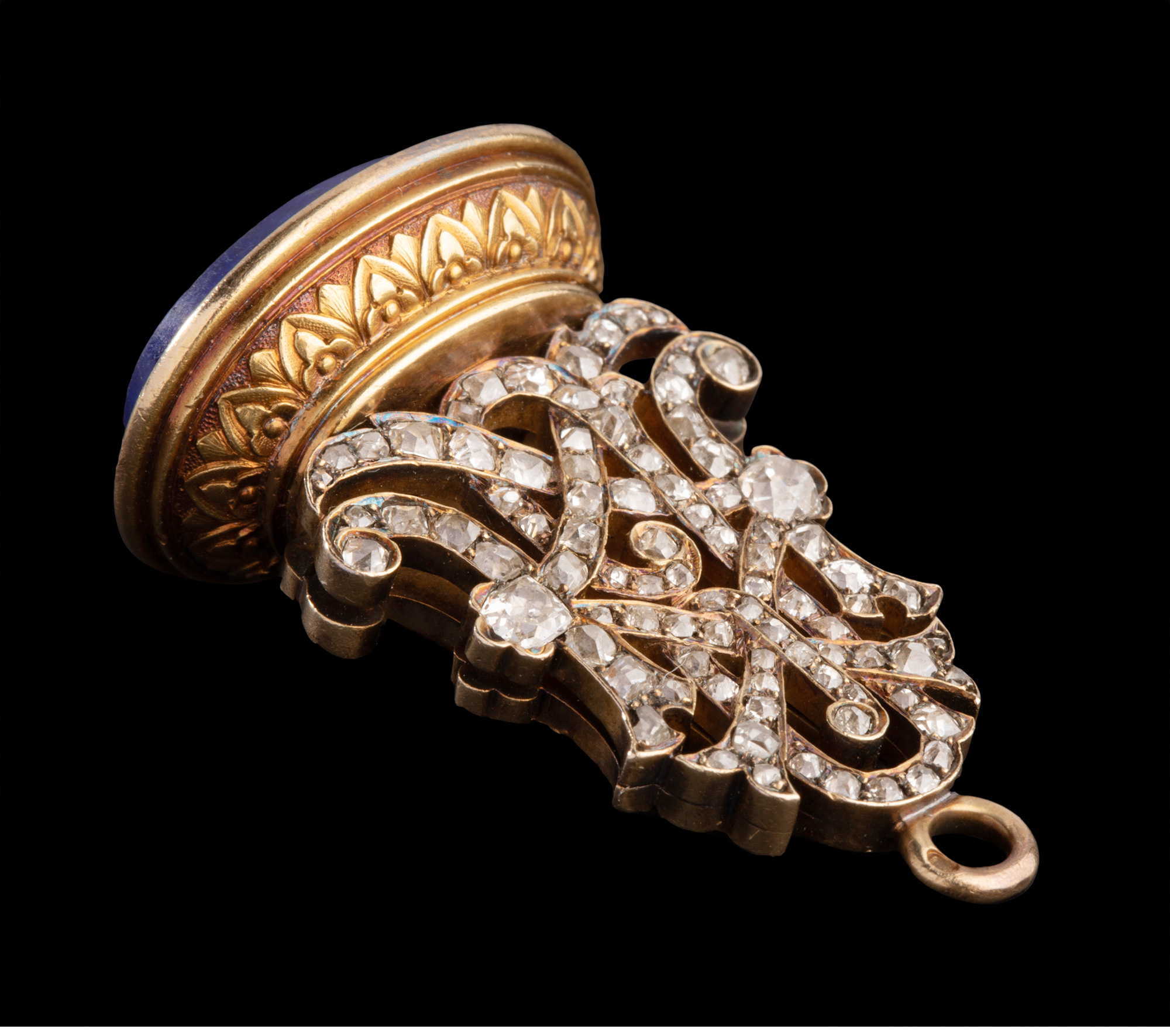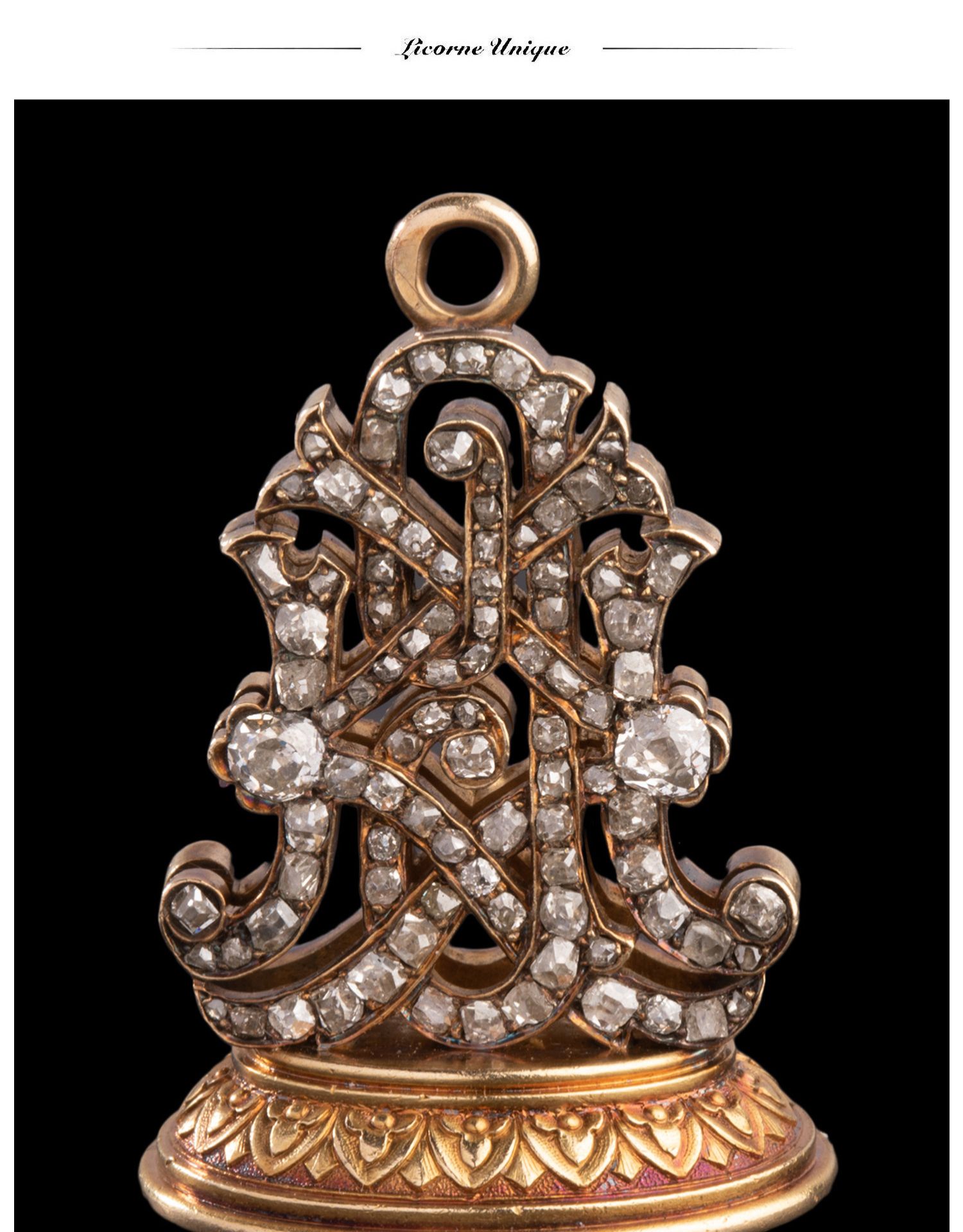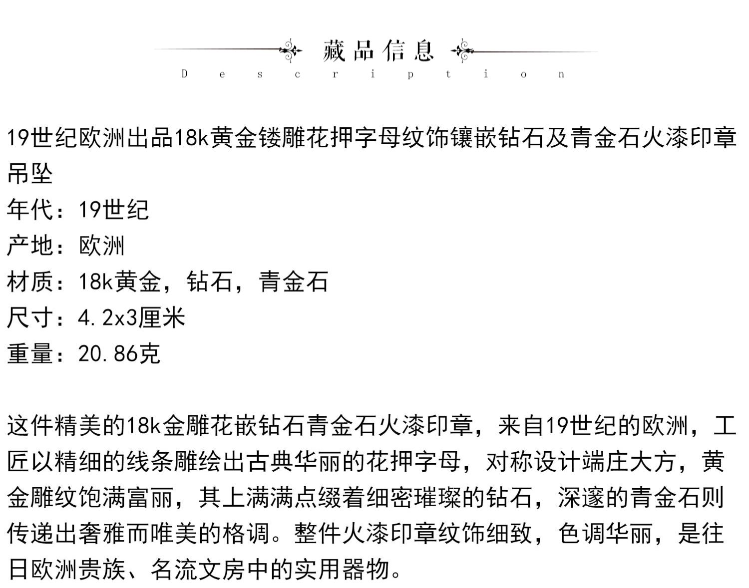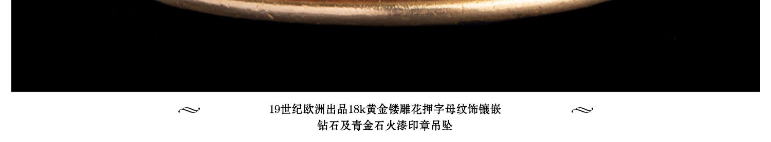 独角鹿西洋古董18K黄金镂雕花押字母镶嵌钻石青金石火漆印章吊坠