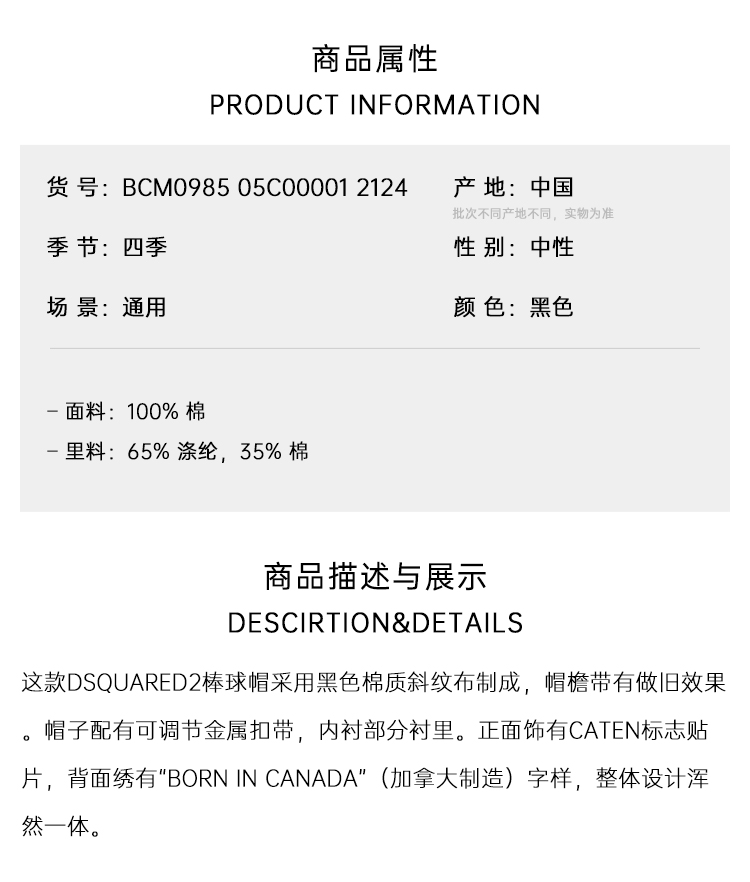 DSQUARED2 中性徽标贴片刺绣棉质棒球帽 黑色 BCM0985 05C00001 2124
