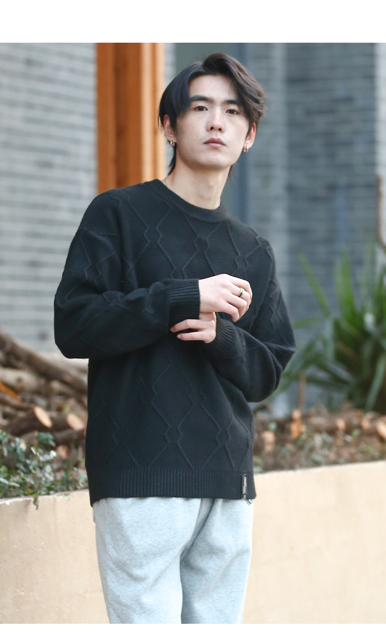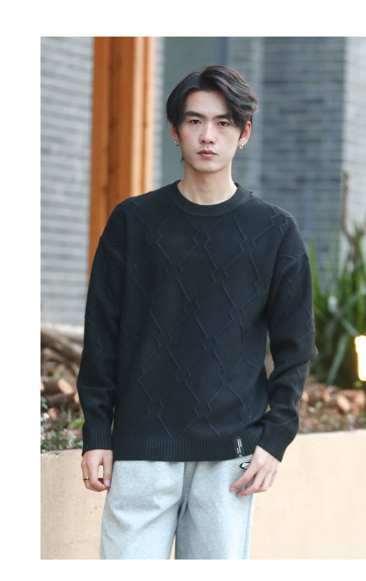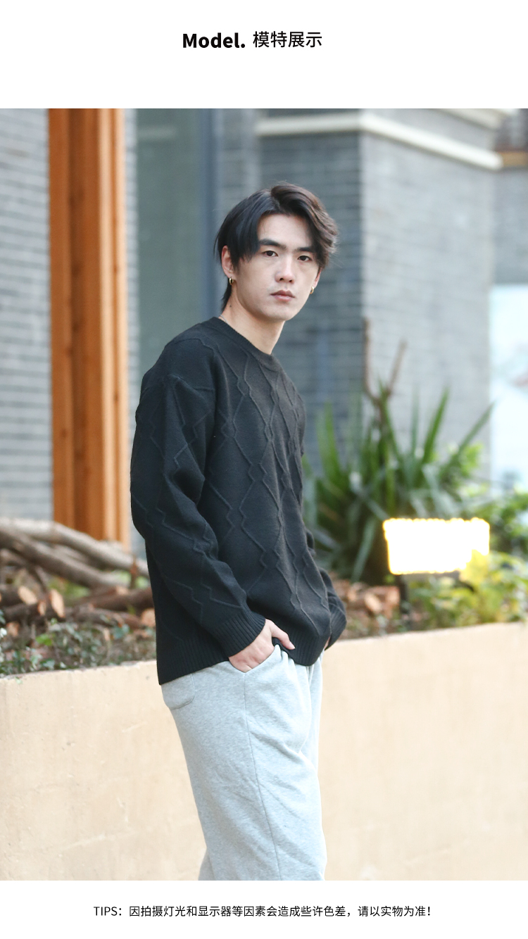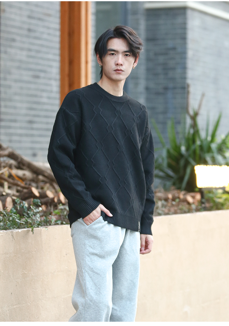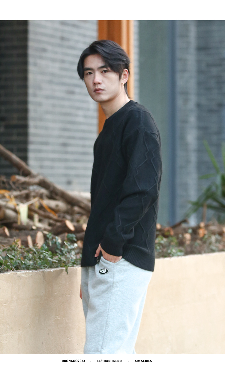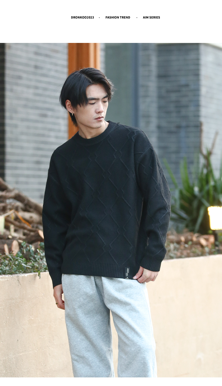 DRONKOO 2025 圆领立体菱形格纹提花厚毛衣
