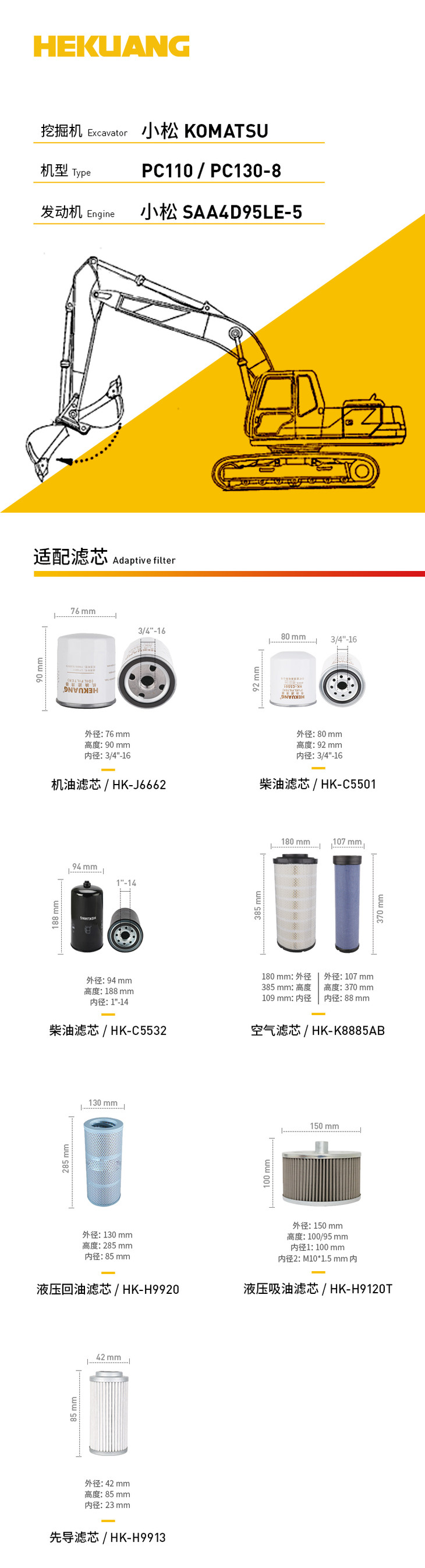 KOMATSU小松PC110/130-8挖掘机滤芯 机油柴油空气滤芯 液压油先导滤芯