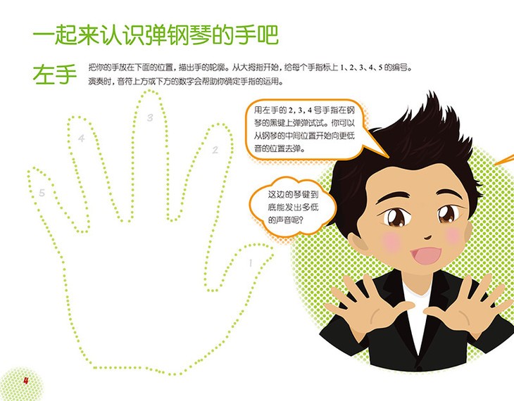这套教材沿袭了郎朗“趣味+联想”的教学模式,鼓励孩子通过想象去学习音乐,了解钢琴。这套教材把课程都设置为不同的场景,包括中国之行、太空之旅、非洲大冒险等,再将不同的技法编入特定的主题,例如模拟熊猫爬行的慢节奏低音练习,模拟火箭升空的跳跃练习,和模拟长颈鹿的音阶练习等等,它不仅训练孩子的手指技巧,更能够启发他们的艺术想象力和创造力。