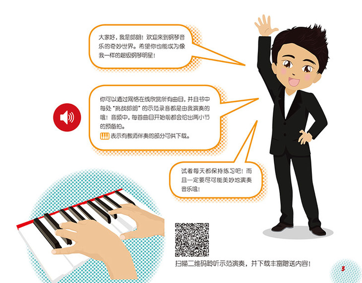 特别值得一提的是,书中每单元都有一个“挑战郎朗”的环节,其中的曲目都是郎朗在英国皇家音乐学院录制的,小琴童可以一试身手,用这些妙趣横生的曲目与大师过过招!