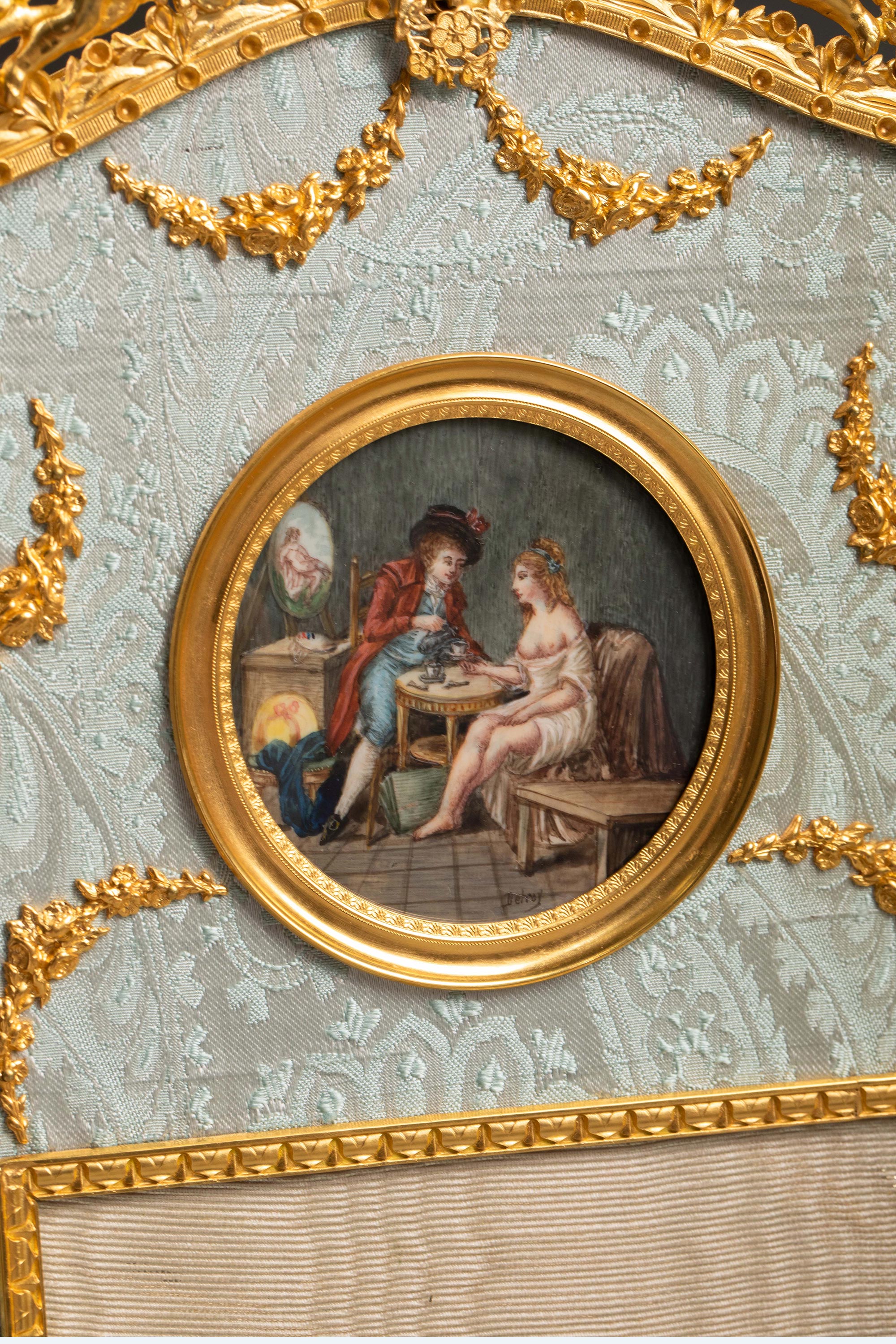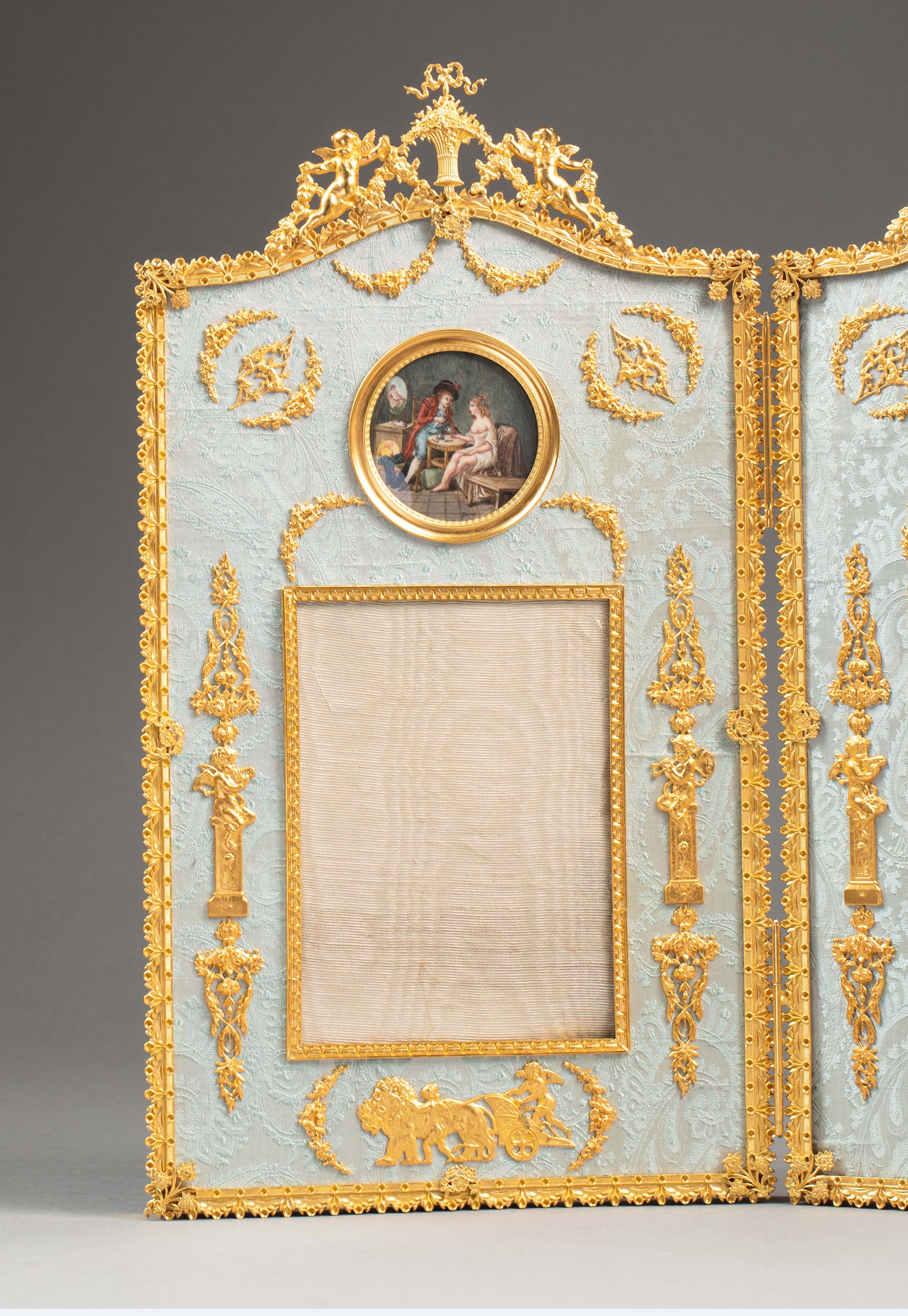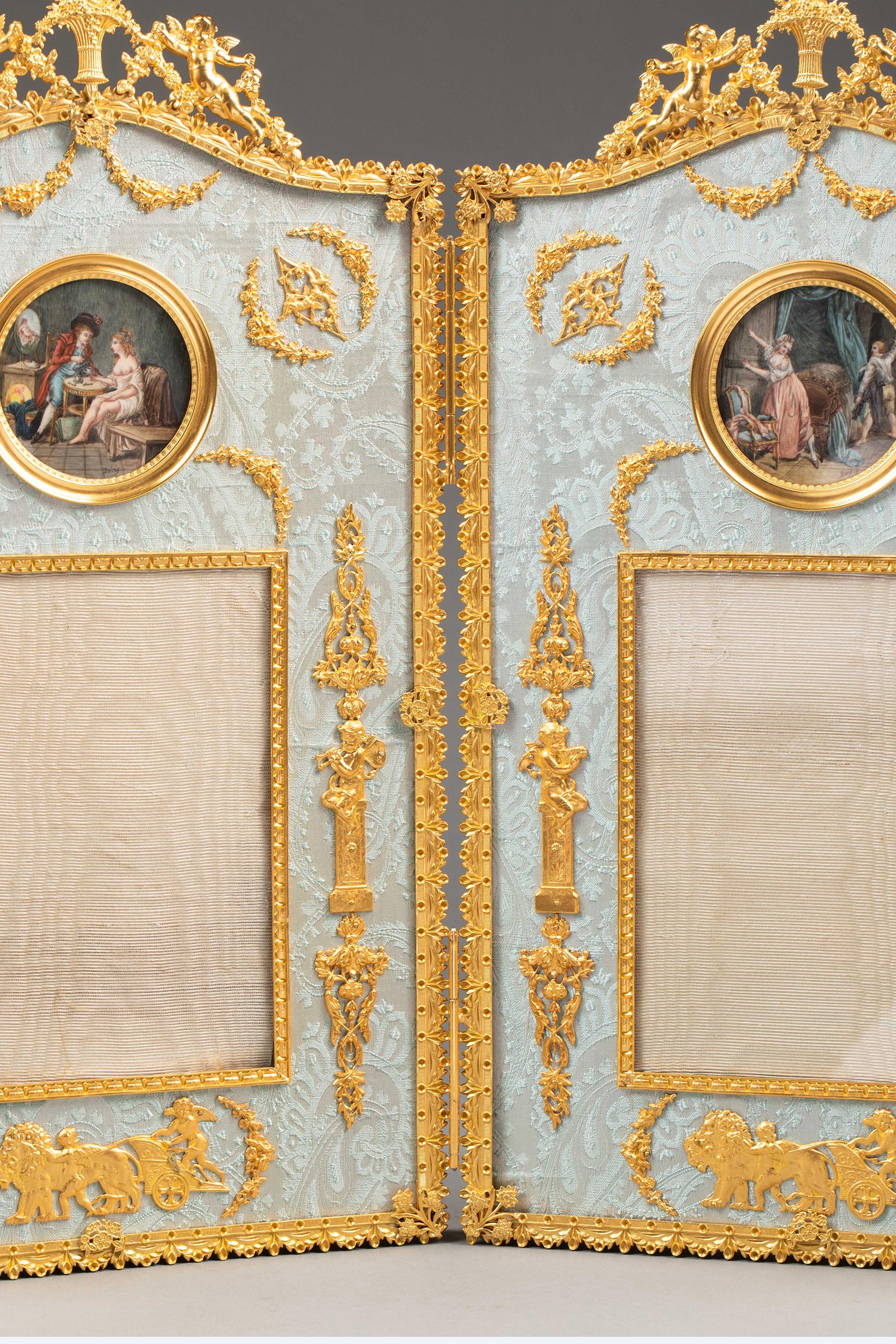 19世纪法国出品路易十六风格天使繁花纹铜鎏金精雕嵌古典人物主题细密画装饰天蓝色天鹅绒双子相框