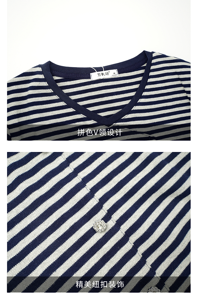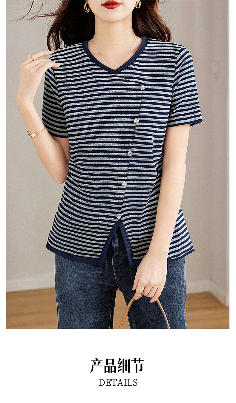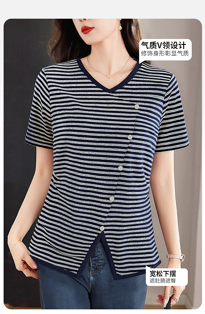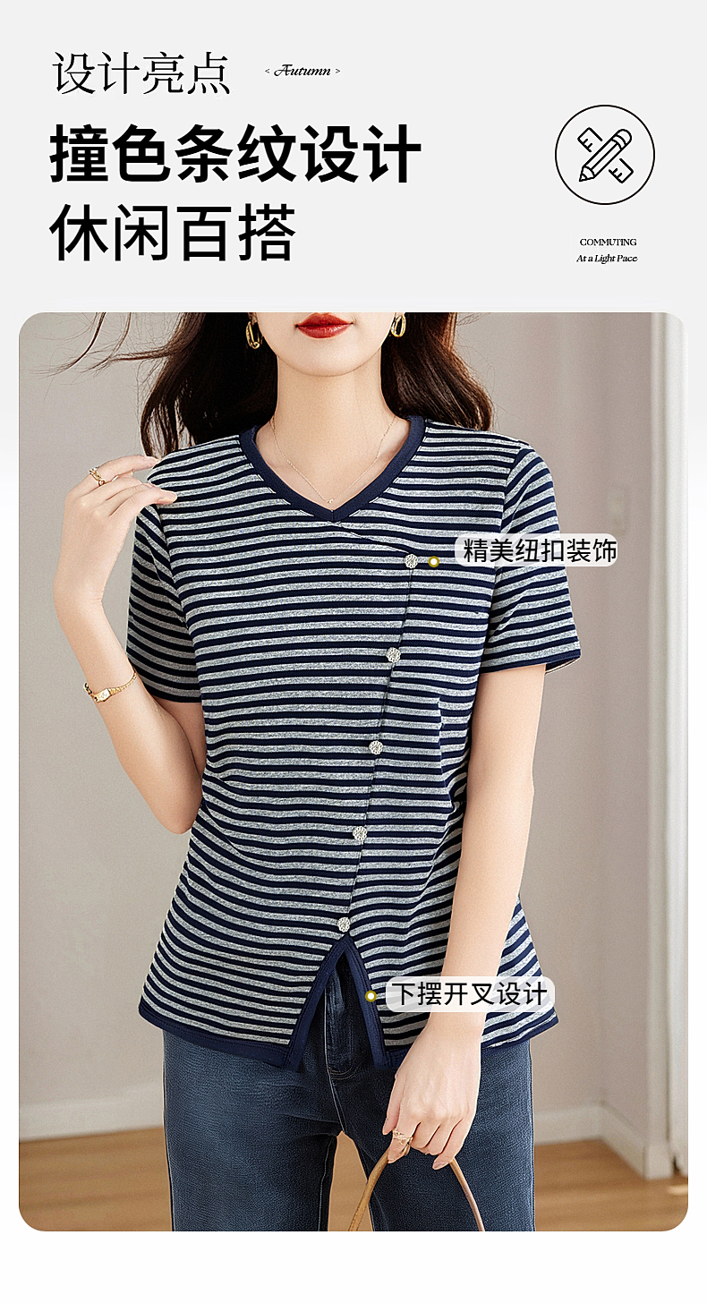 休闲短袖t恤女士宽松大码显瘦V领上衣春夏季2025年新款条纹打底衫