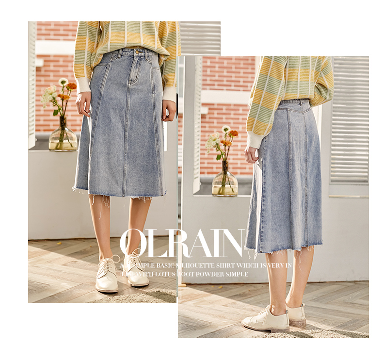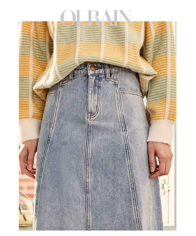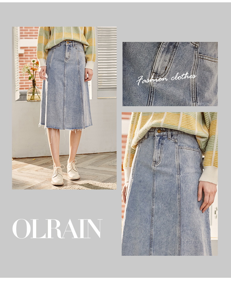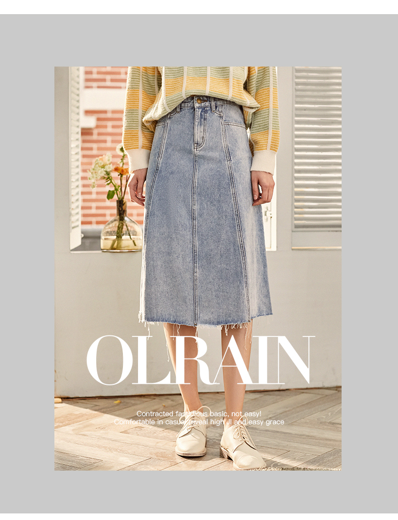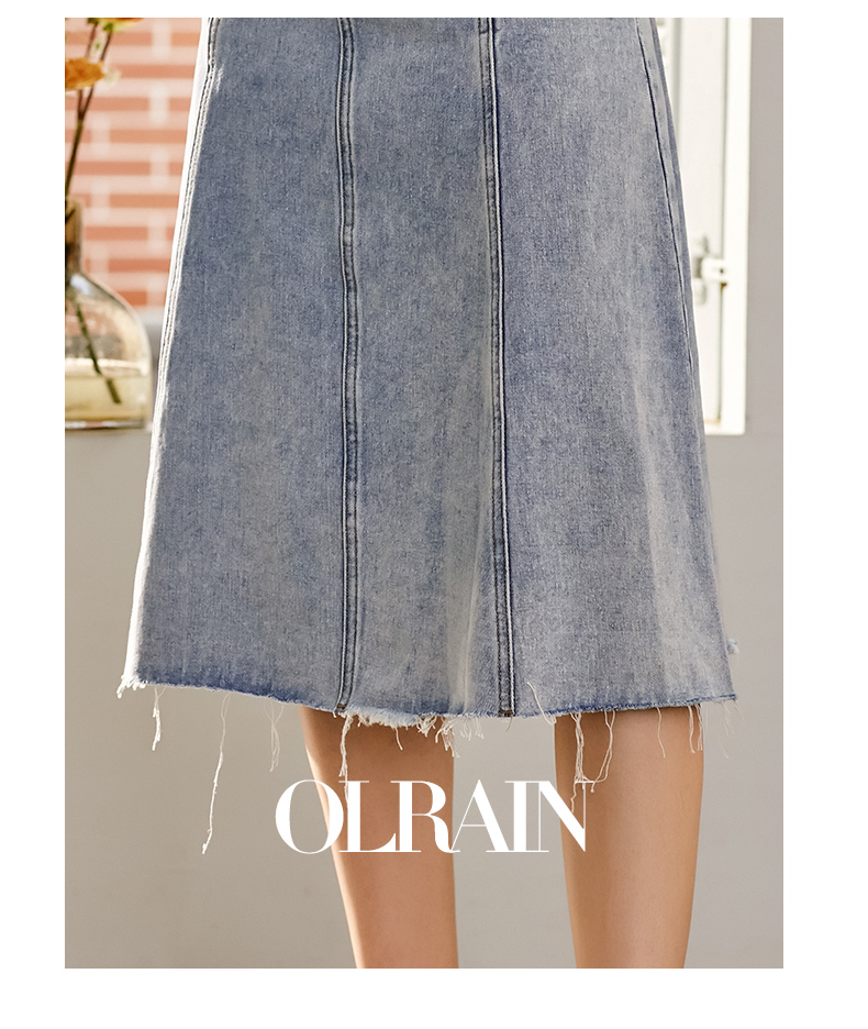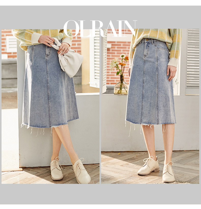 欧芮儿水洗牛仔半身裙女新款高腰显瘦中长款花边A字裙
