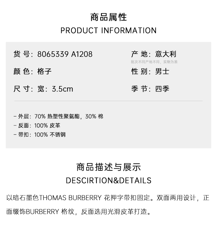 【一】BURBERRY 巴宝莉 男士格纹拼皮革双面两用 TB专属标识 腰带 格子 8065339 A1208