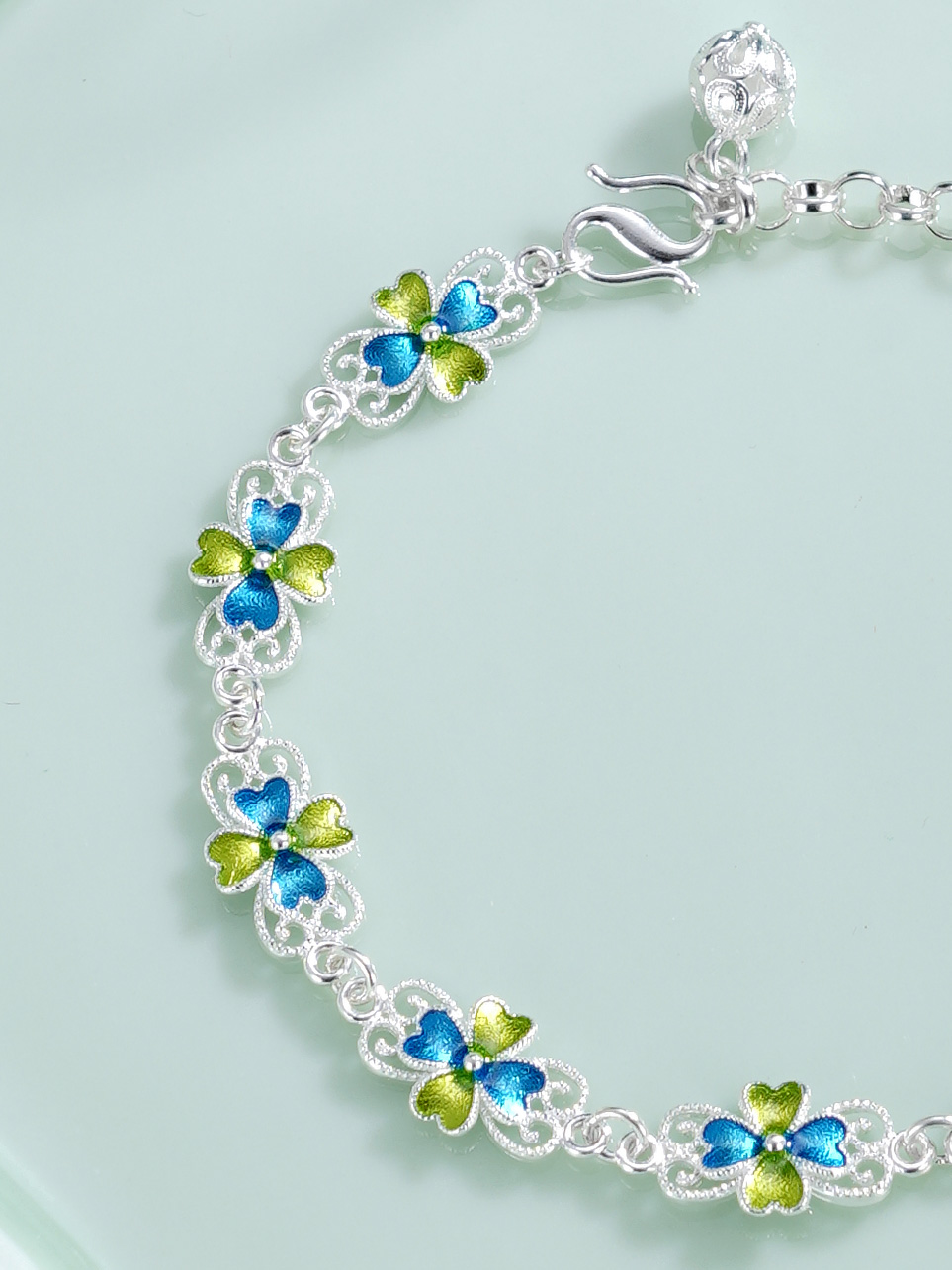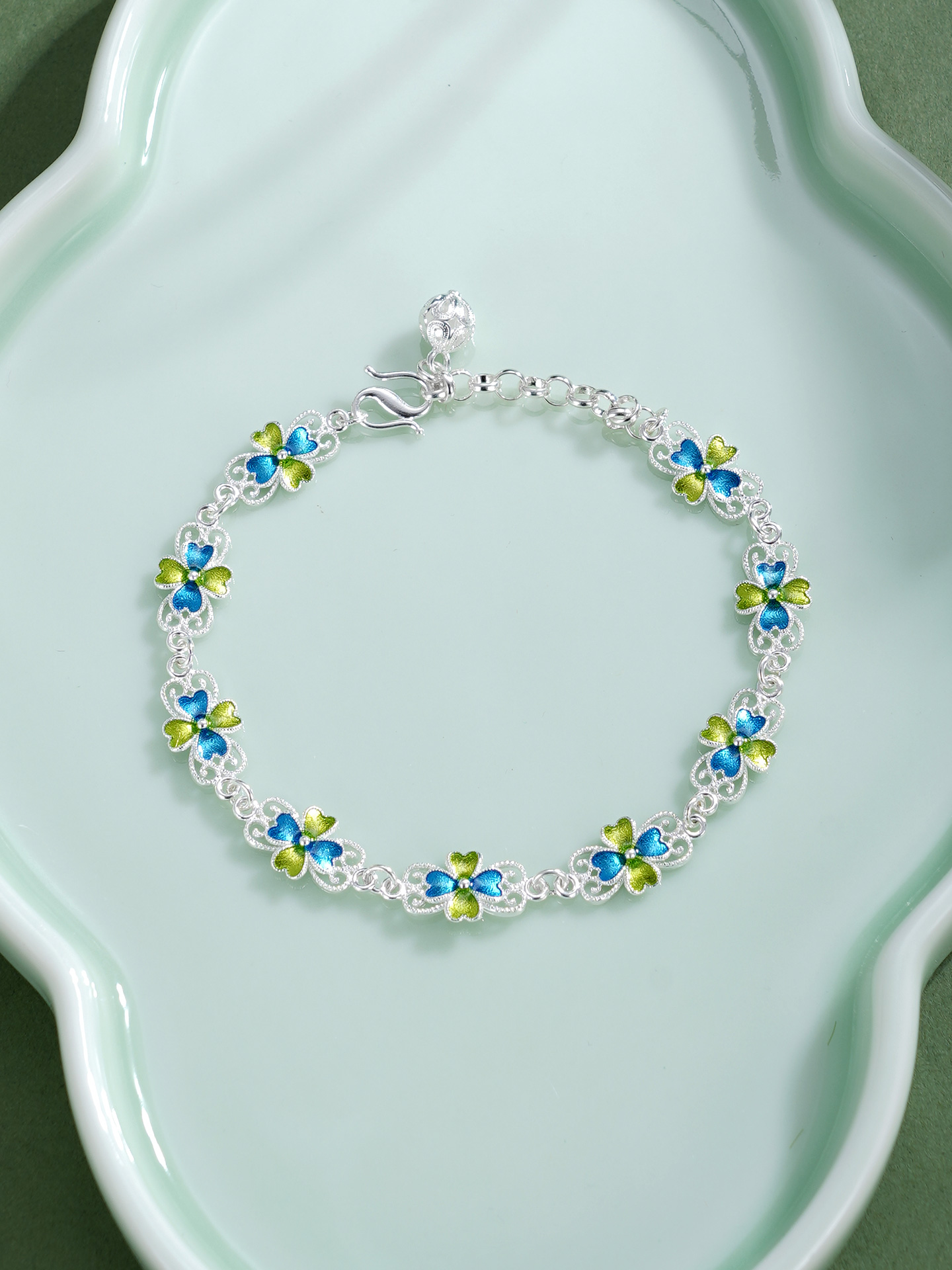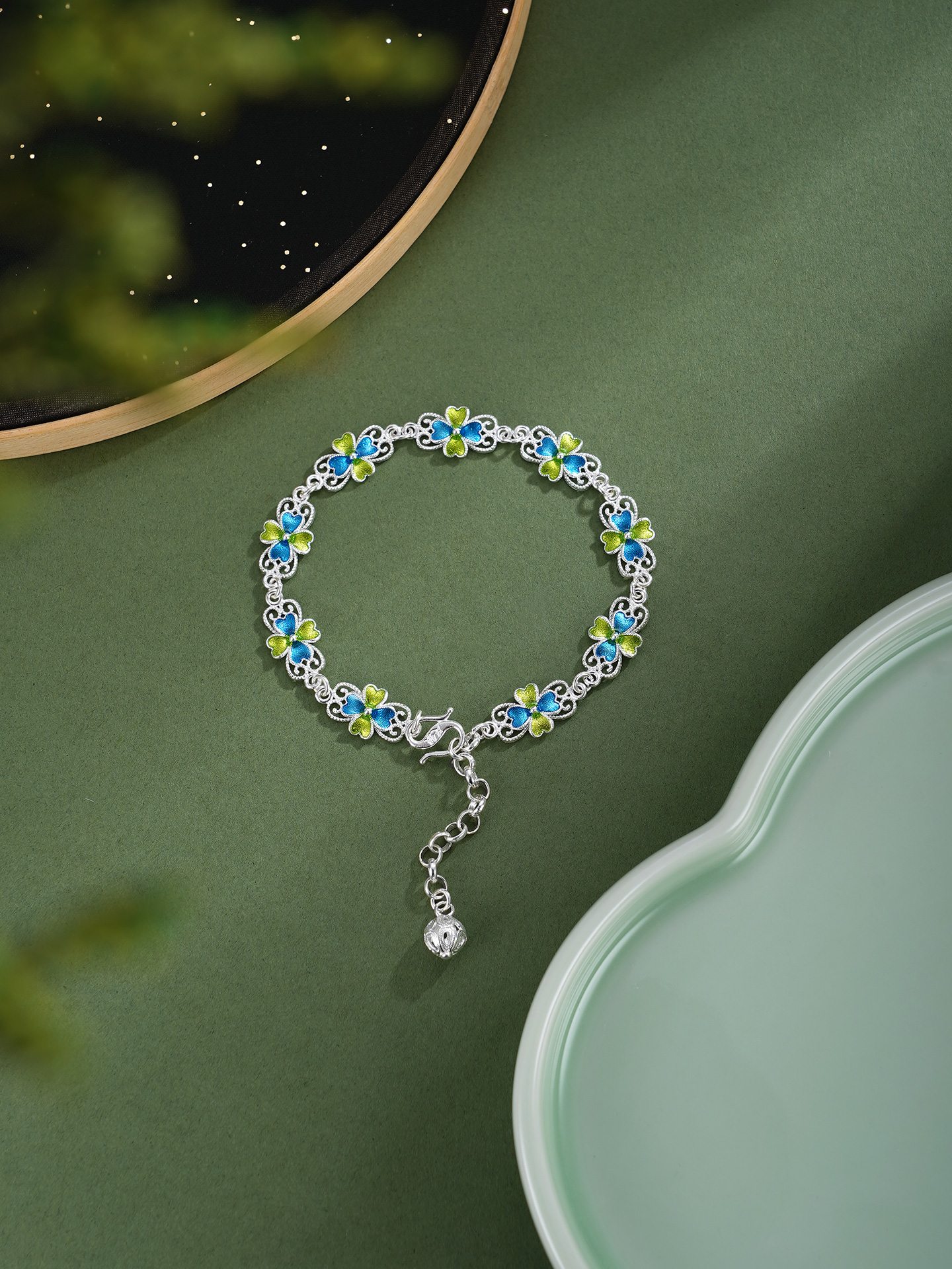 【寓意】:银花丝珐琅彩手链,设计灵感源自四叶草,四叶草元素流转不息,污秽邪气统统远离,总能给佩戴者带来意外之喜。