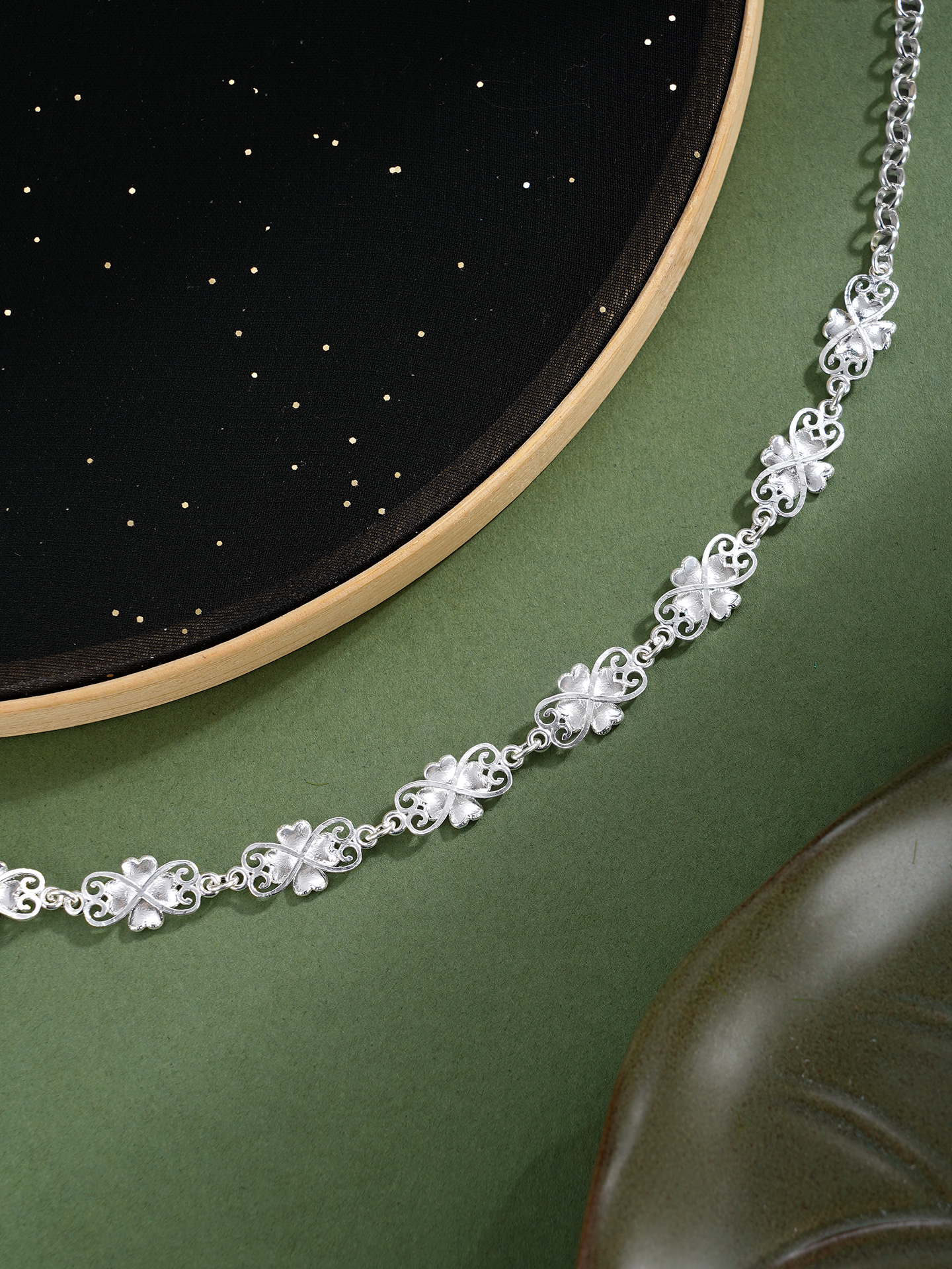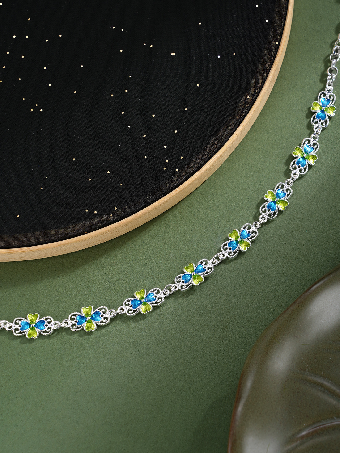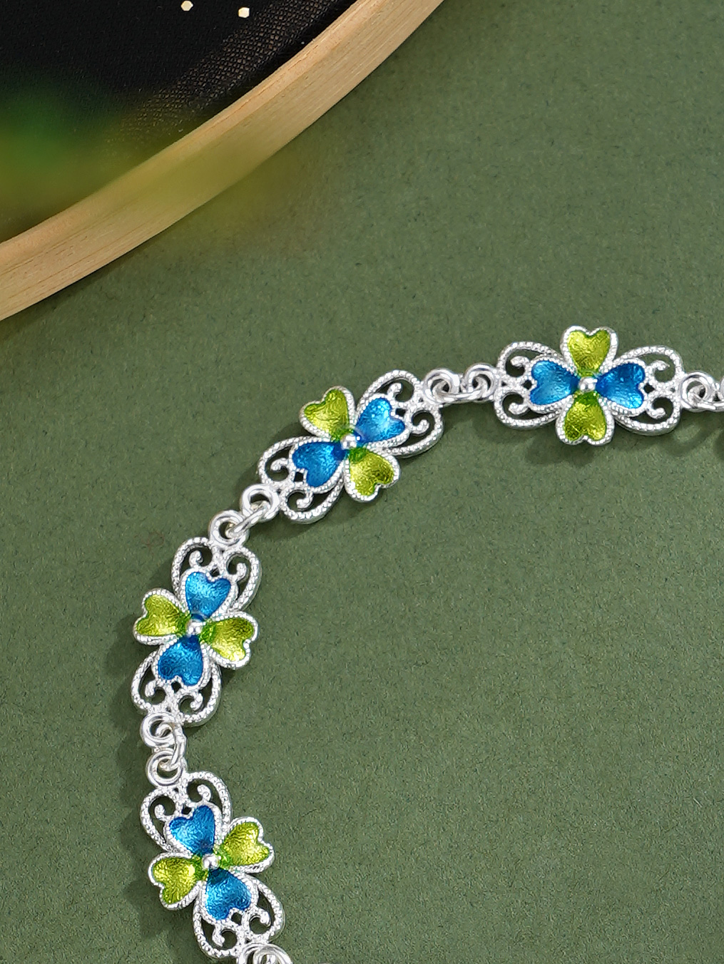 【寓意】:银花丝珐琅彩手链,设计灵感源自四叶草,四叶草元素流转不息,污秽邪气统统远离,总能给佩戴者带来意外之喜。