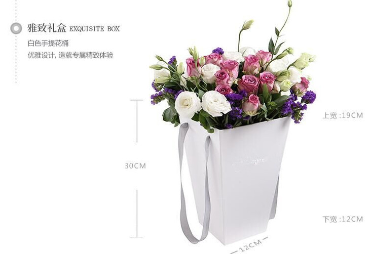紫色玫瑰19枝,白色桔梗5枝,紫色勿忘我0.2扎,叶上花3枝