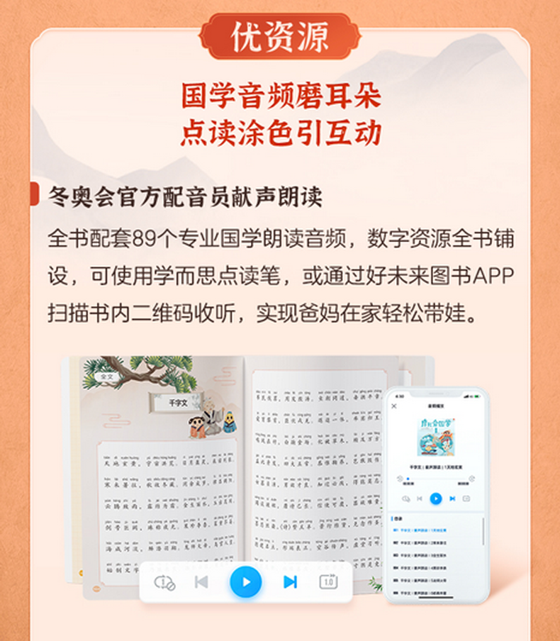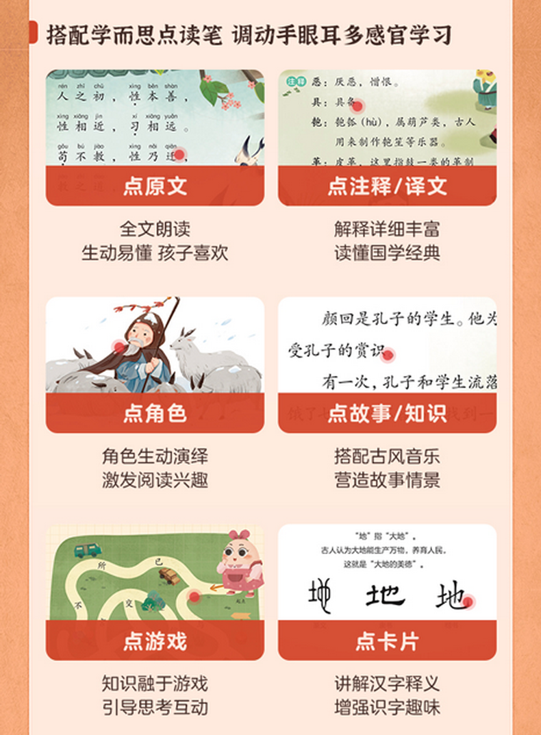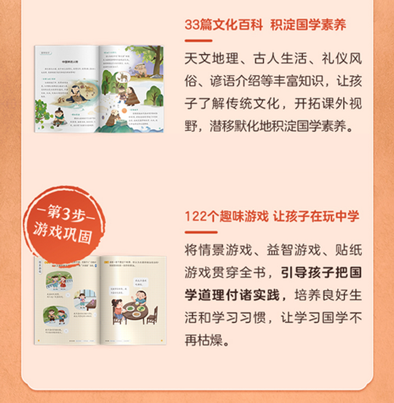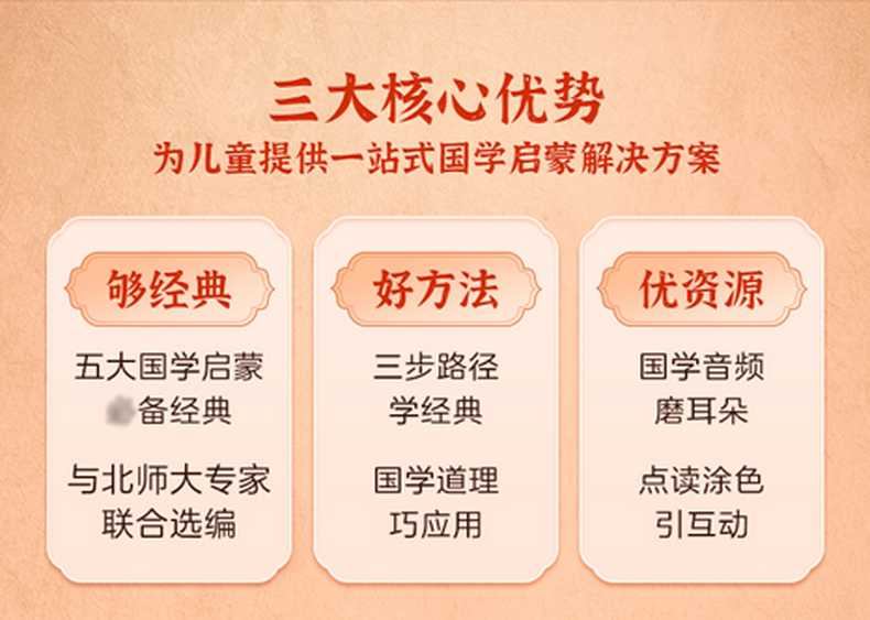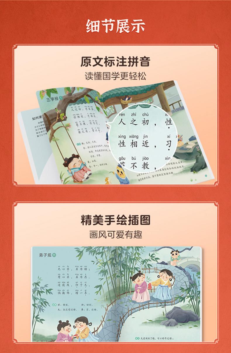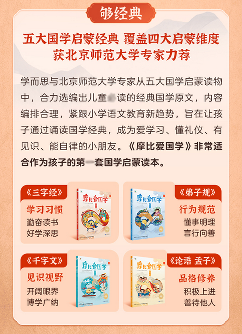 《摩比爱国学》在专家把关下,对5本国学经典的原文做了内容筛选,剔除了原文中部分价值观落后的内容和含义过于深奥晦涩的部分,更适合低幼儿童阅读,家长可以放心让孩子自主学习。