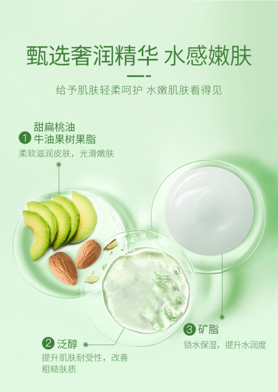 1.添加甜扁桃油 牛油果树果脂:柔软滋润皮肤 光滑嫩肤