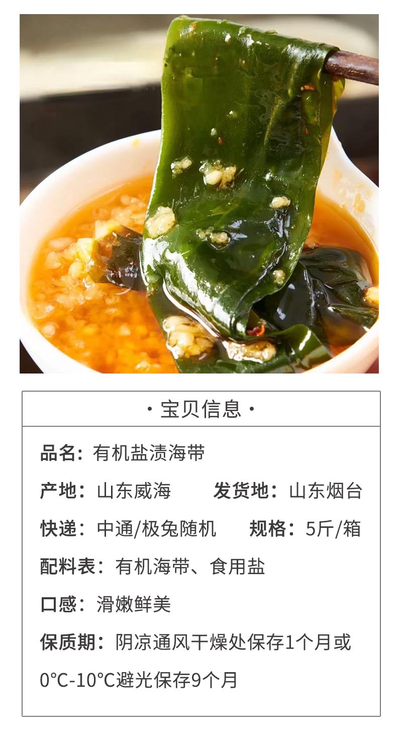 【有机盐渍海带】非人工养殖,来自远离陆地8-10海里之外的深海新鲜采摘,从采摘到加工全场不落地处理,24小时完成整个生产过程,保留海带自身鲜嫩口感,泡发后可以直接凉拌