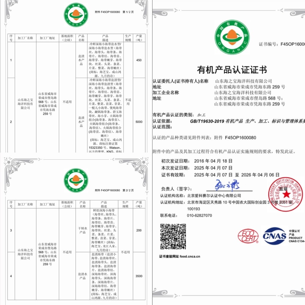 【海芝宝-有机盐渍海带嫩苗】山&姆、&胖&来、麦龙!同品牌在售的有机海带来咯,有机认证,一箱一码,非人工养殖,来自远离陆地8-10海里之外的深海新鲜采摘。