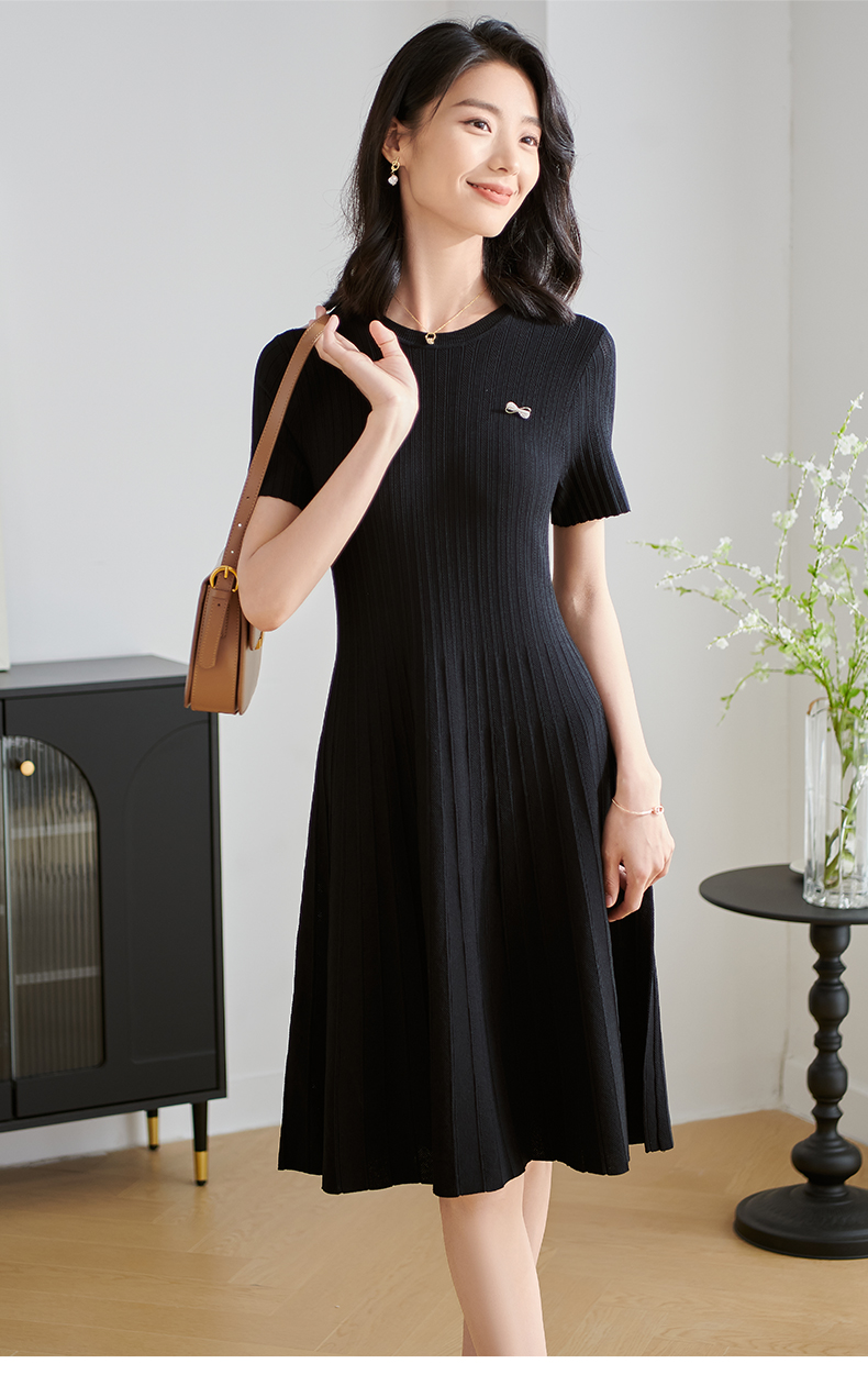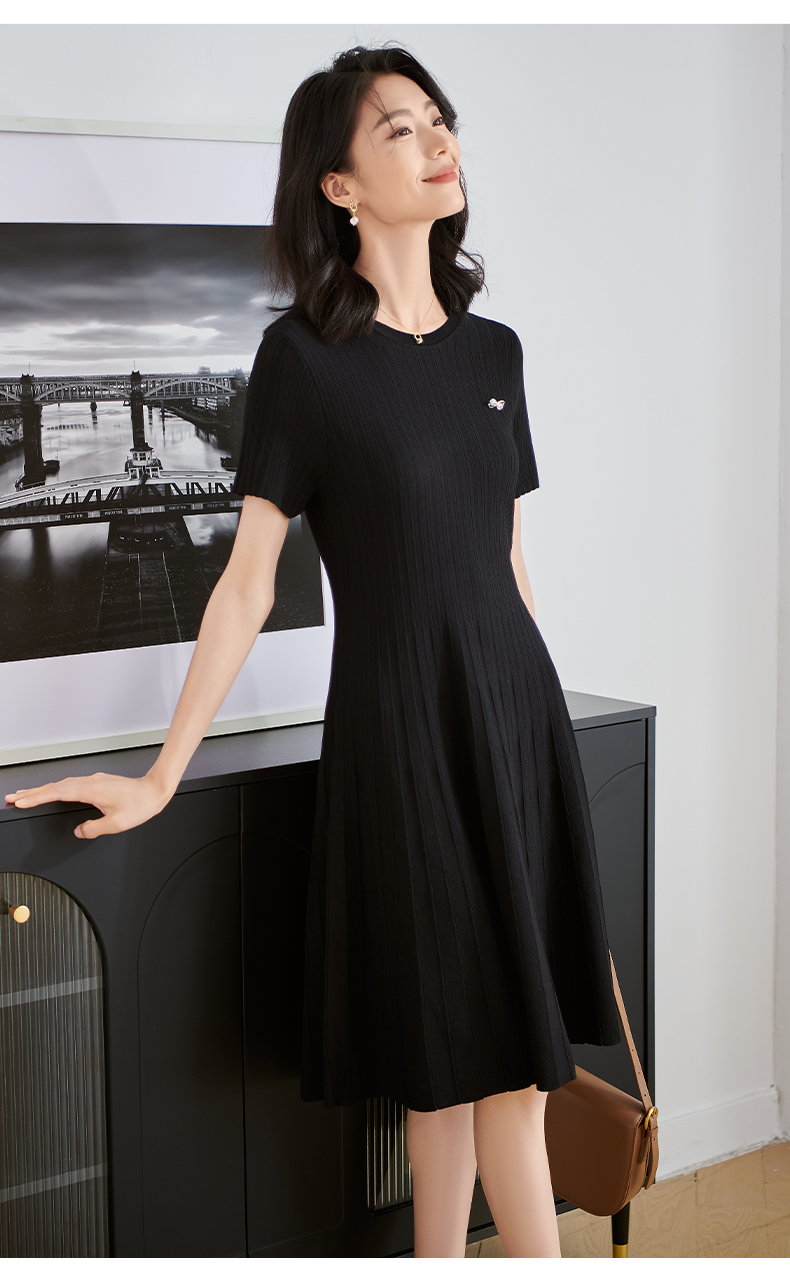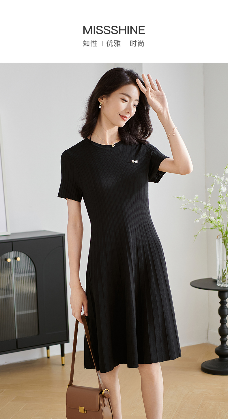 米思阳2025夏季新款知性优雅短袖连衣裙收腰修身圆领A字裙女2915