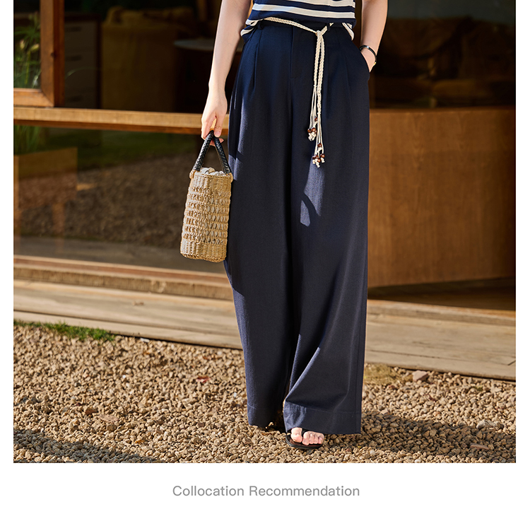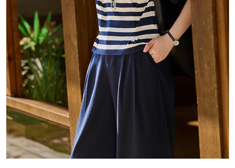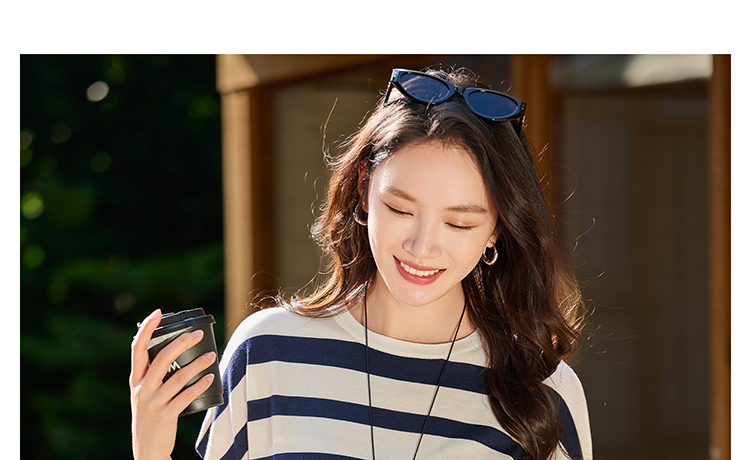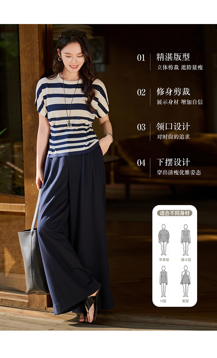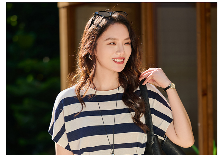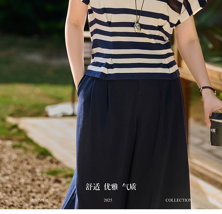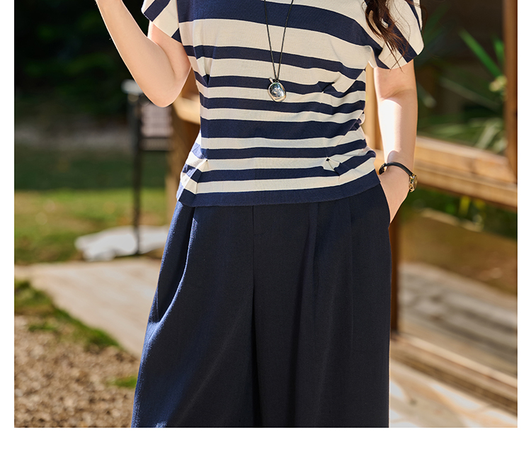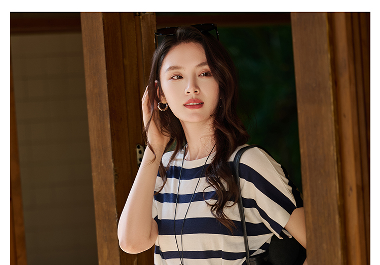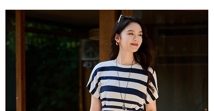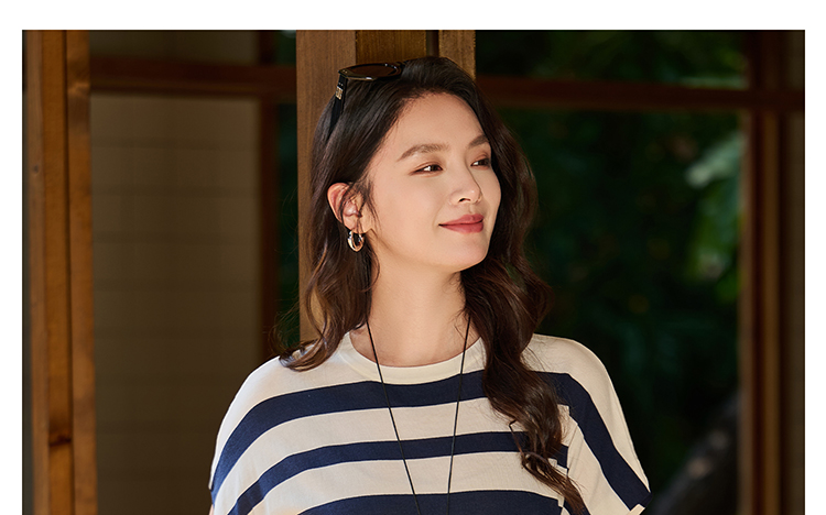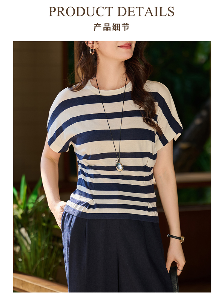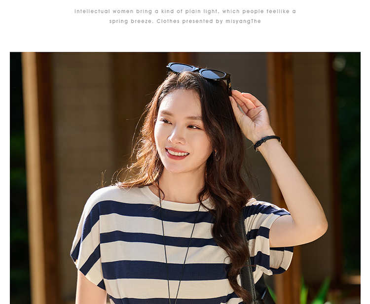 条纹针织衫 会呼吸的天丝棉混纺 时髦腔调 米思阳2026夏季新款设计感落肩捏褶收腰针织T恤撞色条纹百搭上衣2074-2111