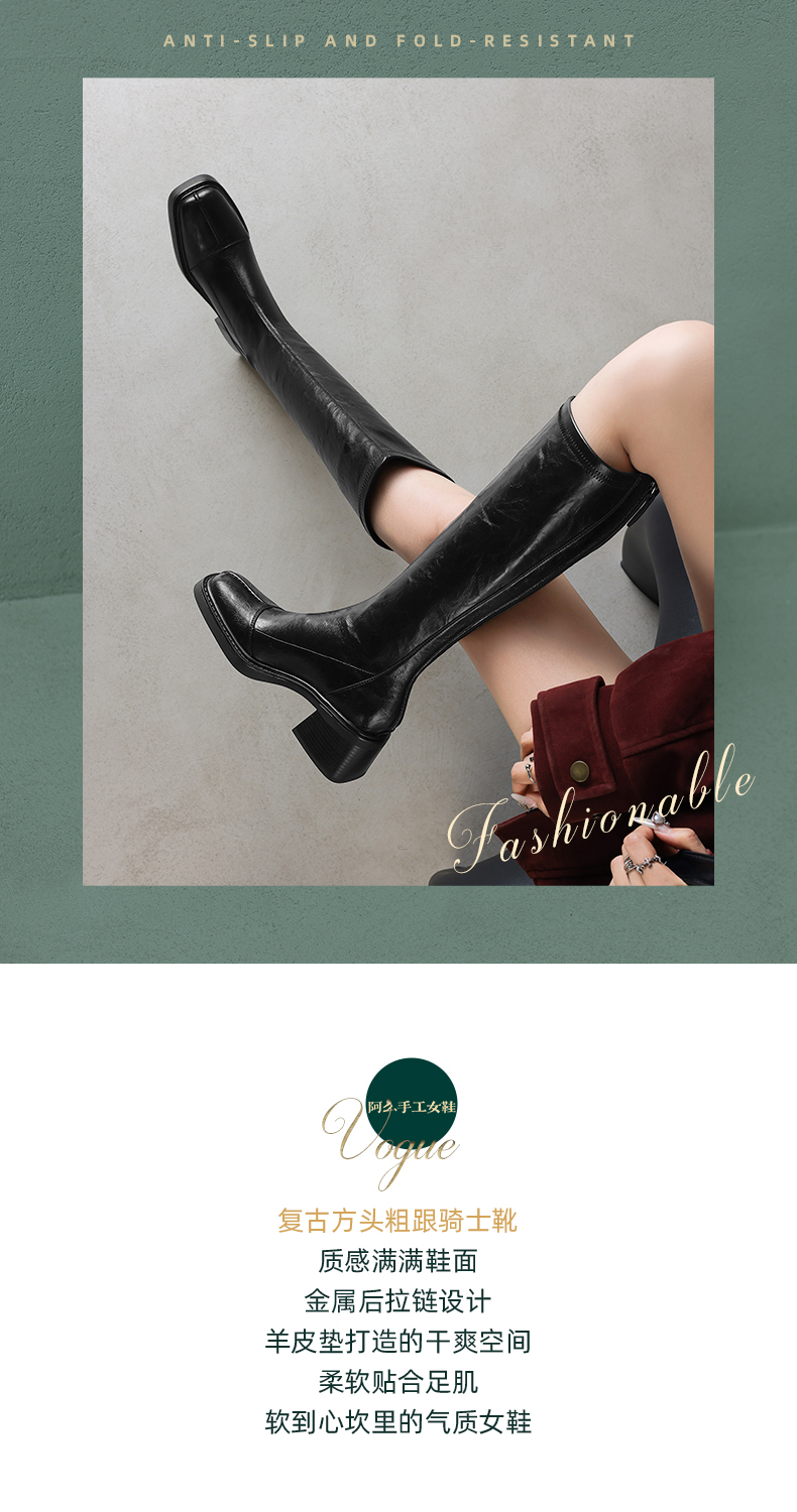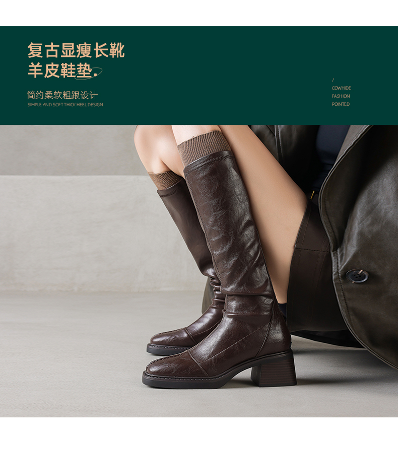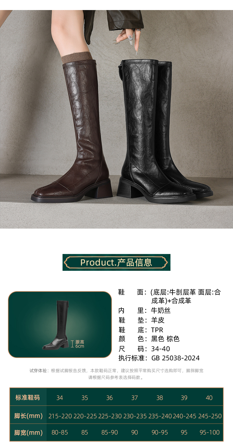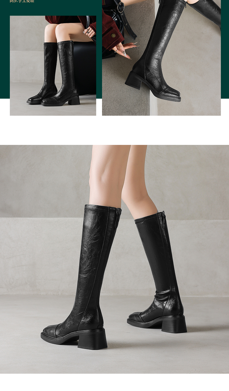 阿么手工女鞋秋冬粗跟弹力长靴女小个子百搭显瘦不过膝高筒靴6CM