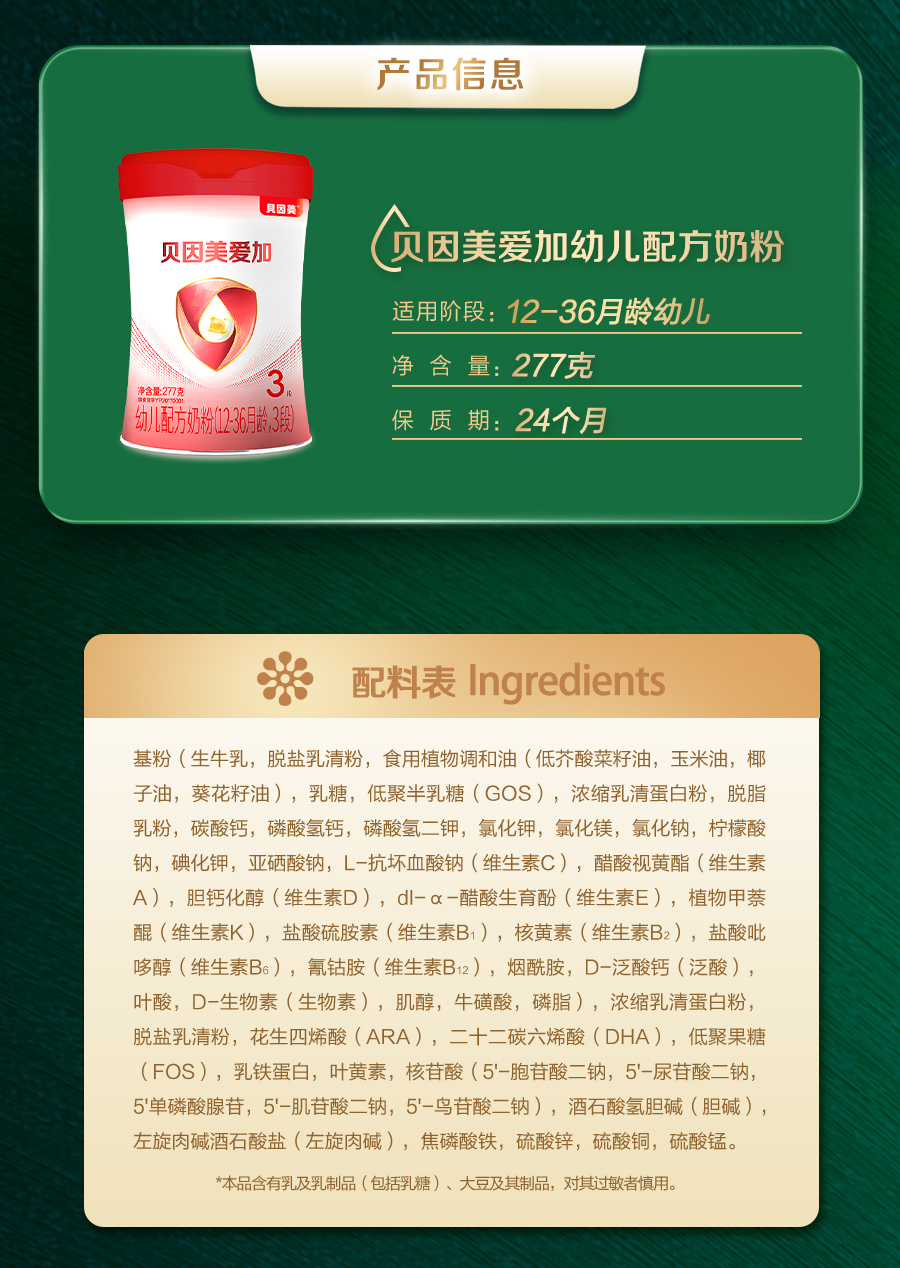 【6罐装】贝因美爱加有机A2 婴幼儿配方奶粉277克