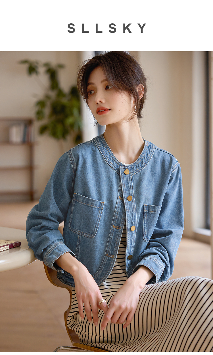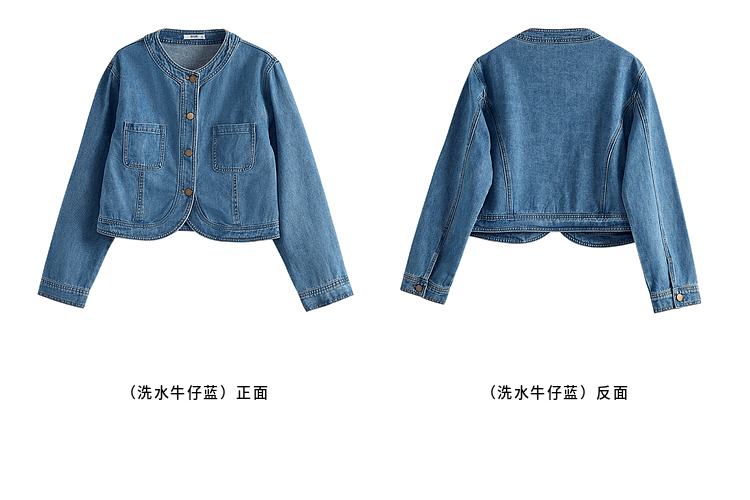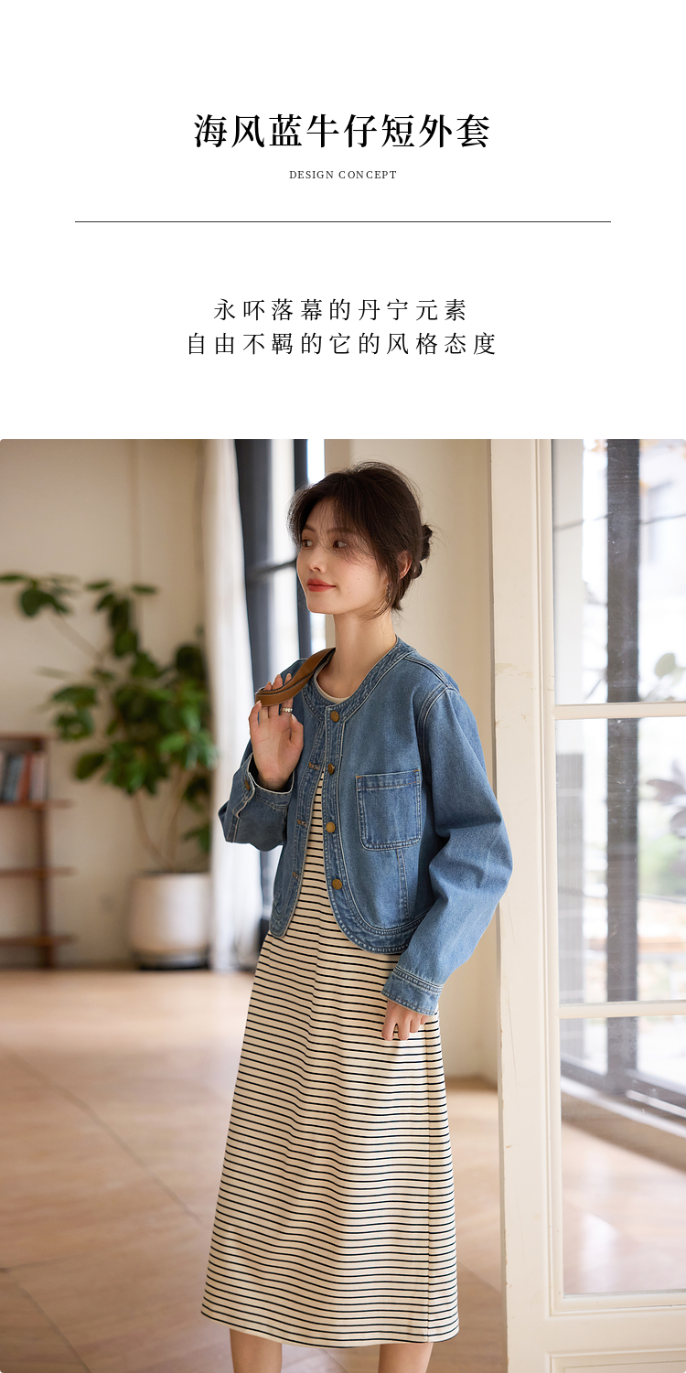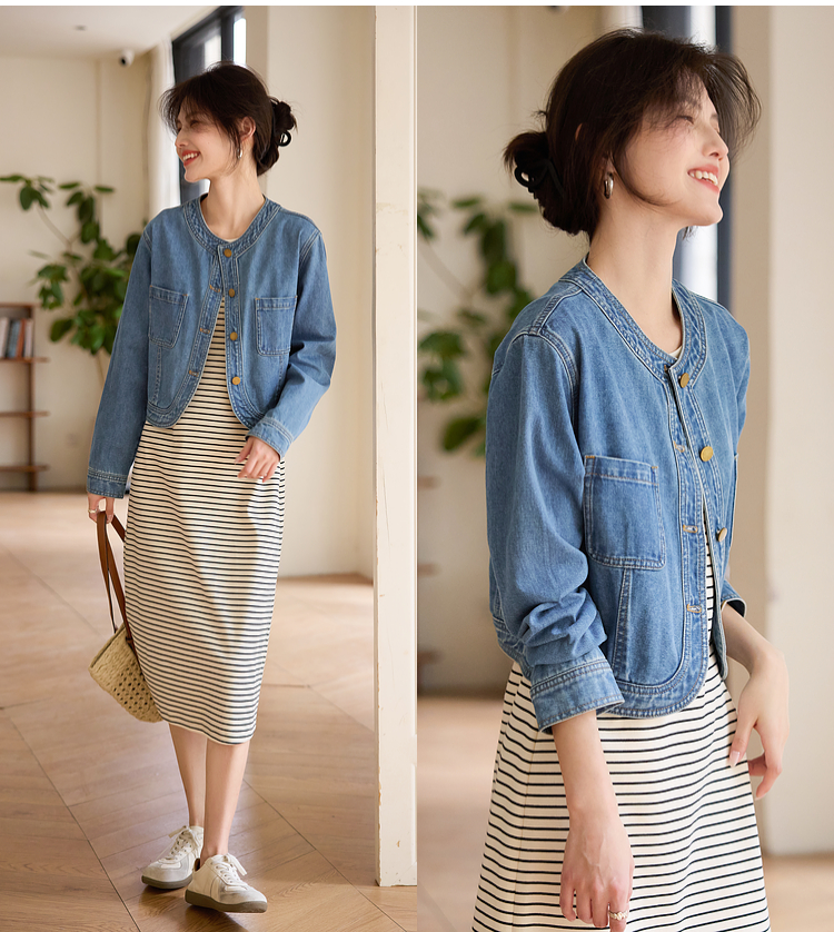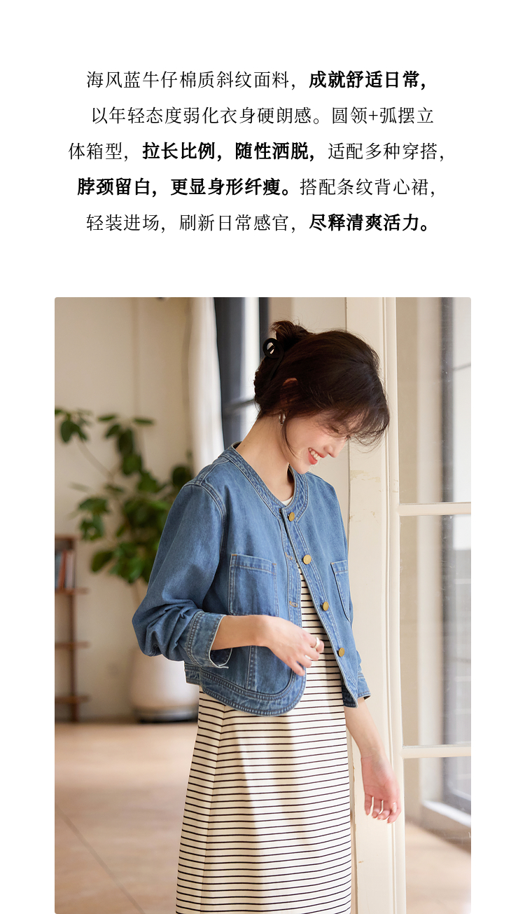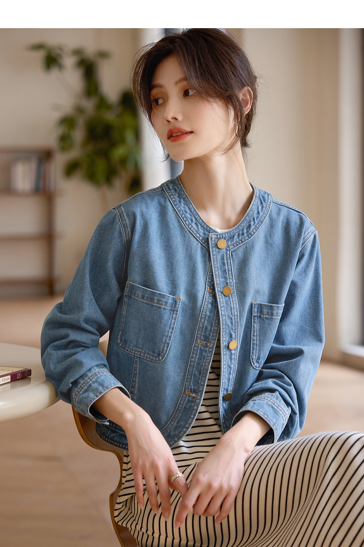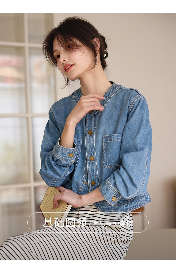 【五折购】熙世界小香风圆领牛仔外套女2025春秋新款小个子复古正肩短款上衣